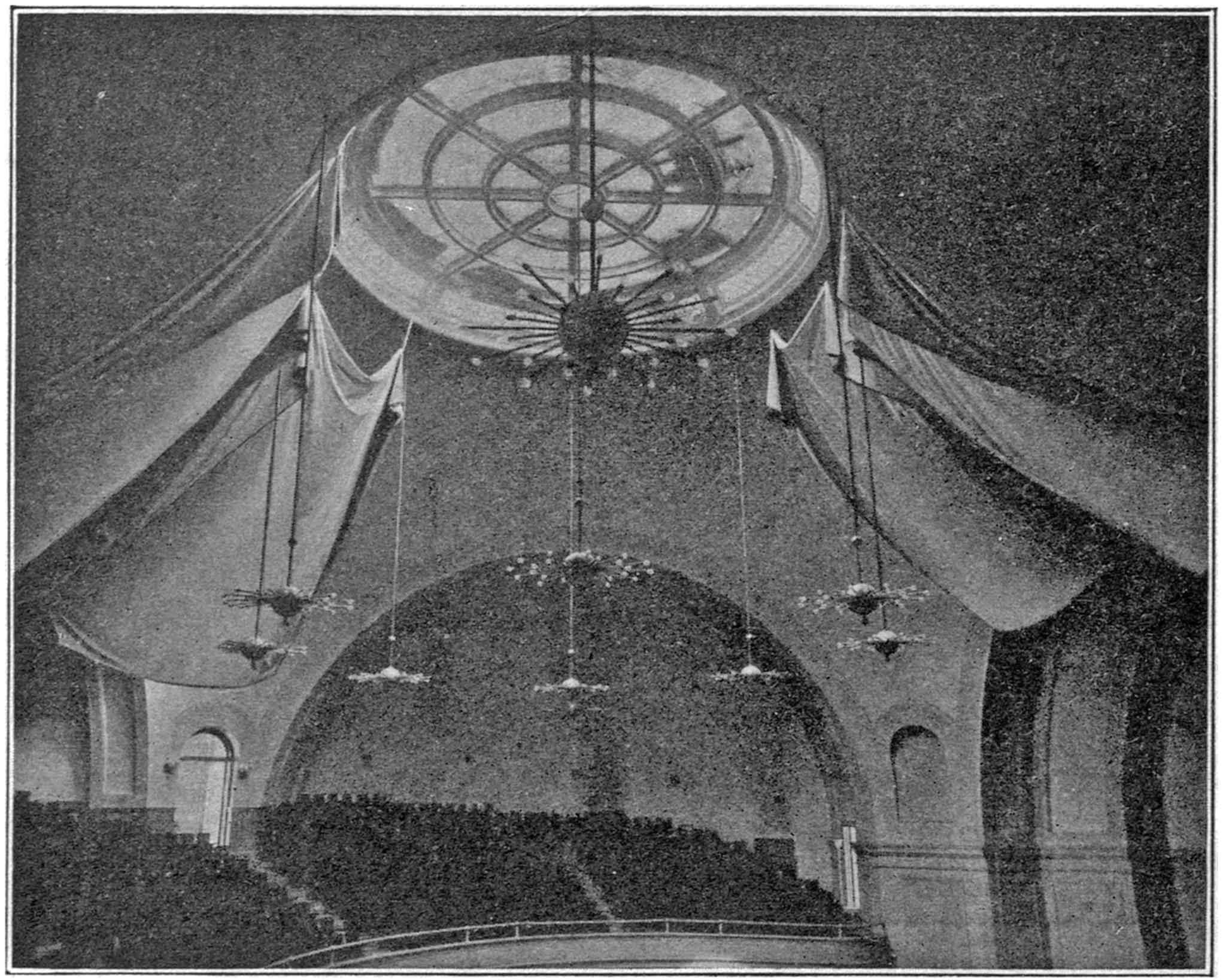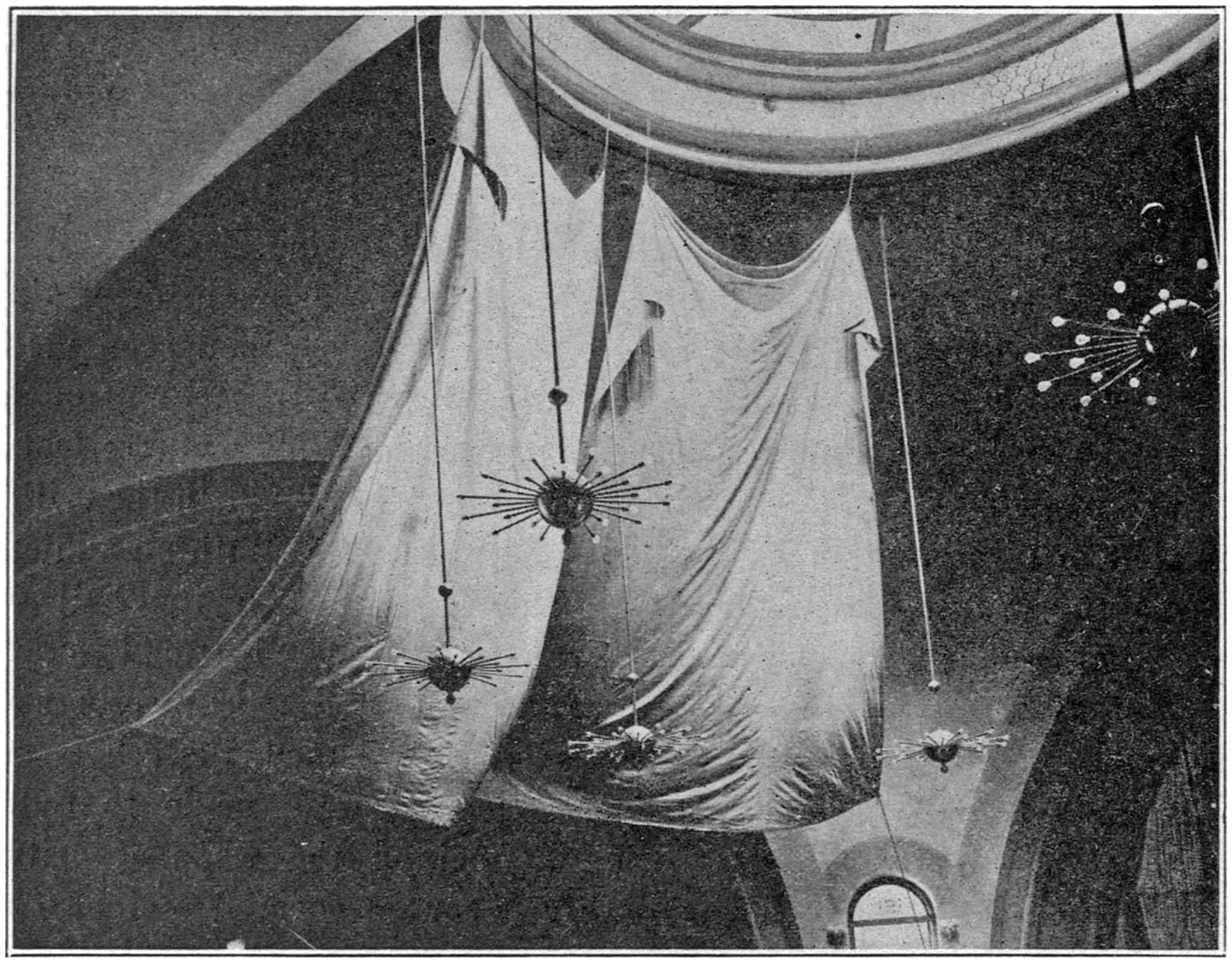 Method of Eliminating Echoes.—Although the time of reverberation was reduced to be fairly satisfactory, as just explained, the echoes still persisted, and were very annoying. Attempts were made to reduce individual echoes by hanging cotton flannel on the walls at critical points. Thus the shaded areas in Fig. 17 were covered and also the entire rear wall in the balcony. Pronounced echoes still remained, and it was evident that some drastic action was necessary to alleviate this condition. Four large canvases, shown in Figs. 23 and 24, were then hung in the dome in position suggested by the results of the diagnosis. A very decided improvement followed. For the first time the echoes were reduced to a marked degree and speakers on the stage could talk without the usual annoyance. This arrangement eliminated the echoes not only on the stage, but generally all over the house. A number of minor echoes were still left, but the conditions were much improved, especially when a large audience was present to reduce the reverberation.
