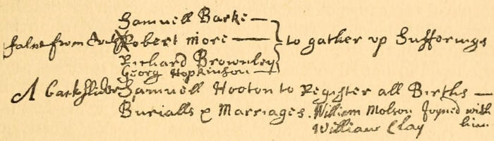 Between the years 1633 and 1636 Oliver and Elizabeth Hooton appear to have migrated to Skegby, a village about four miles west of Mansfield. The Parish Registers there show that in 1636 “Thomas [?] yᵉ sonne of Olive Hooton and Elizabeth” was baptized, and in the years 1639 and 1641 the names of John and Josiah appear. There is no entry of the births of her two children, Oliver and Elizabeth, so possibly they were born at Ollerton between the years 1633 and 1636, when no entries appear in those Registers.
