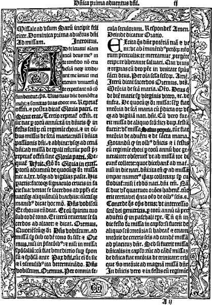 The first printers naturally turned to these manuscripts, not only for the models of their types, but for other hints—and what did they find? They found that the scribes generally began on the second leaf of the vellum or paper, and that sometimes the vellum or paper was ruled with faint red lines for margins and for evenness of line. They found that the title of the work was put at the head of the text, and that the first page of the text was enclosed within a richly illuminated border, sometimes merely decorative or conventional, but more often consisting of exquisitely drawn and coloured pictures,[4] illustrating, if it were a service book, scenes in the life of Our Lord or fragments of sacred history.