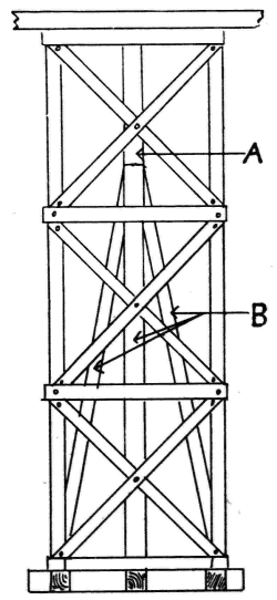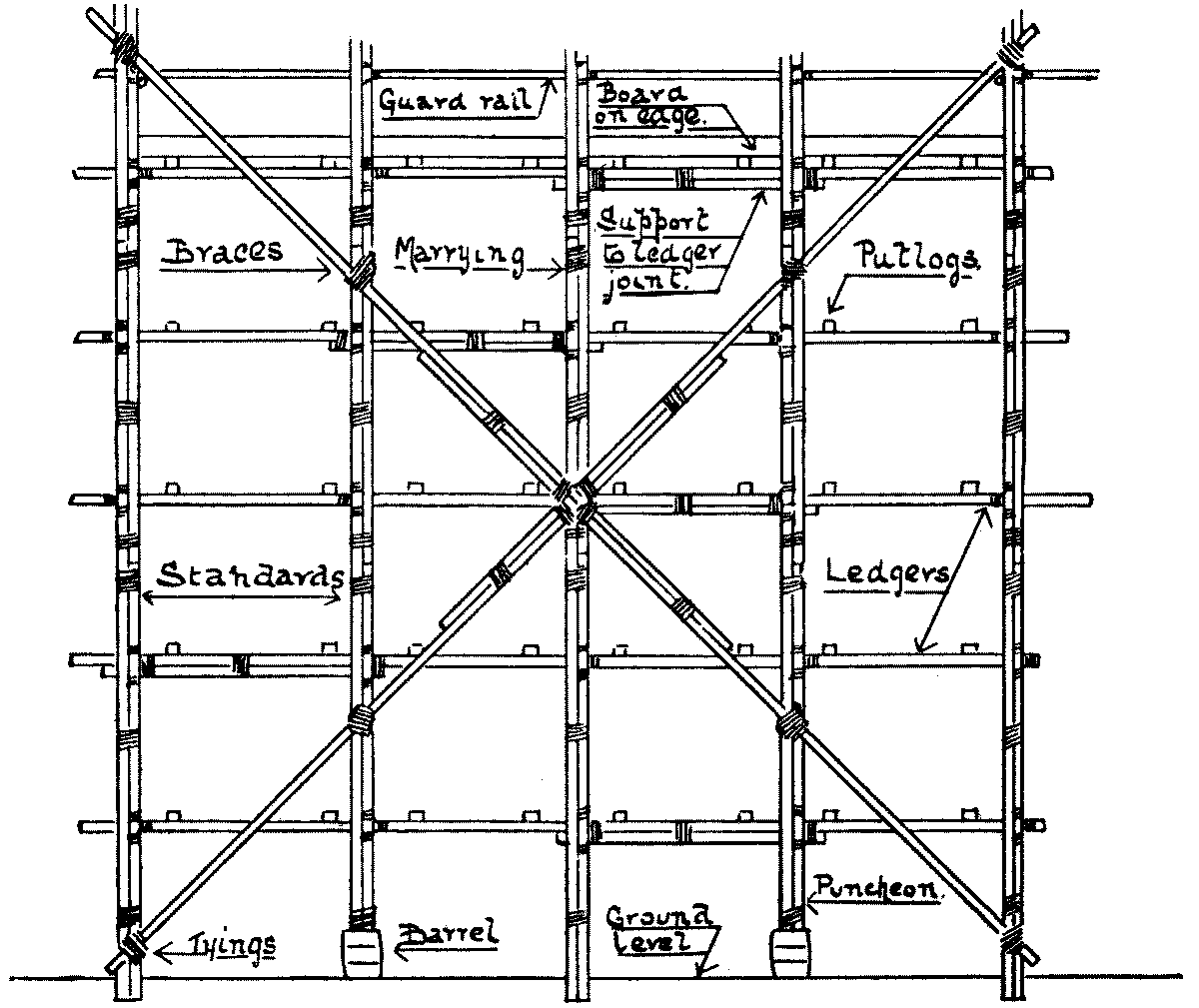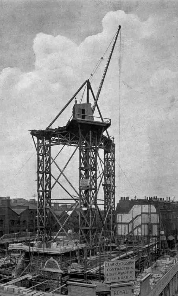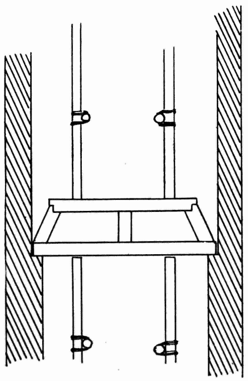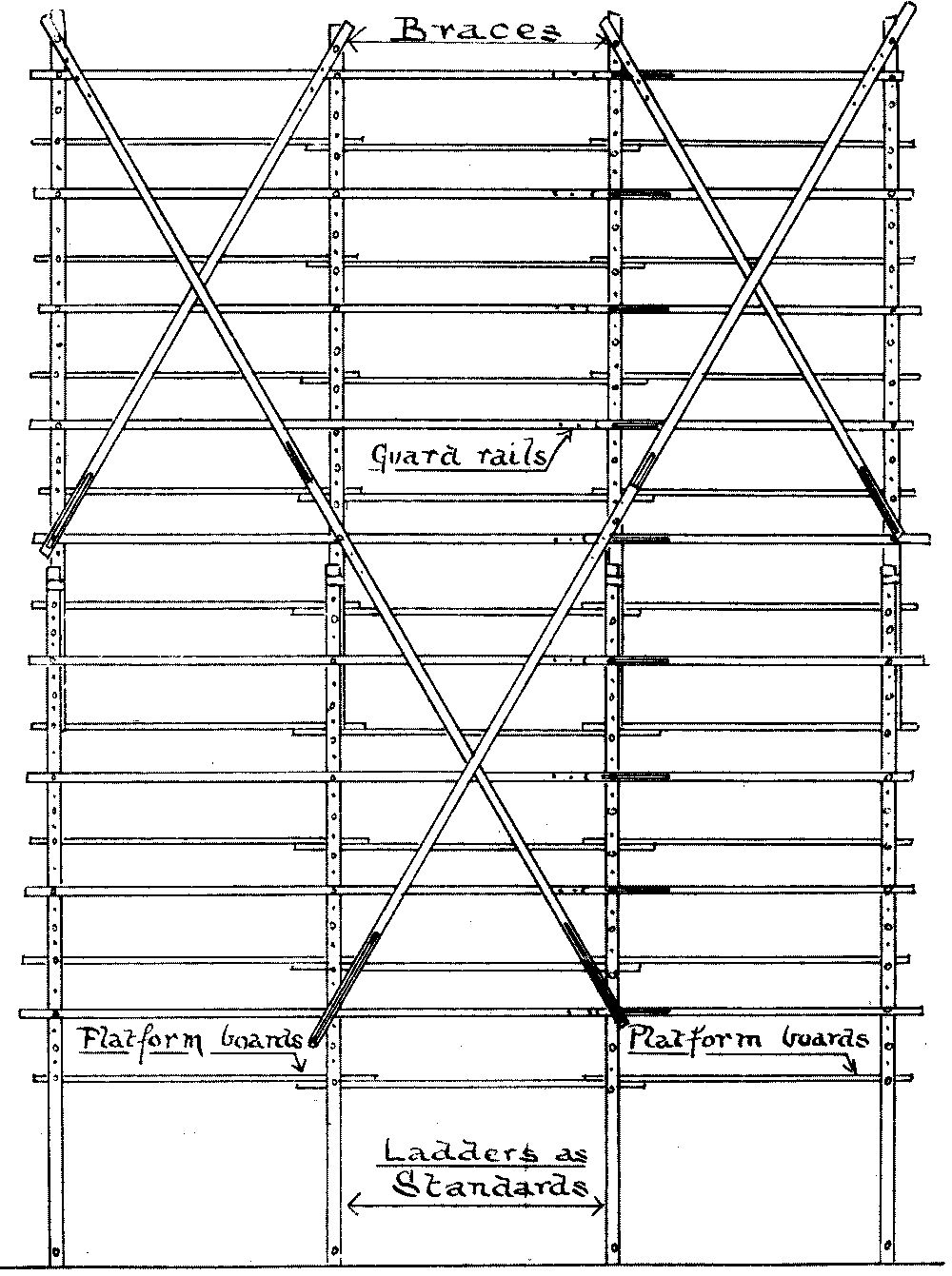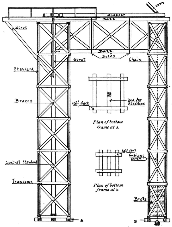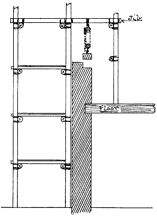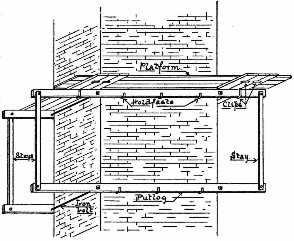 Scaffolding—Definition of—Northern system—Derrick stagings—Working platforms—South country system—Gantries, commonly called travellers—Travelling gantry—Gantries which serve as a base for lighter forms of scaffolding—Stagings—Pole scaffolds—Bricklayers’ scaffolds—Masons’ scaffolds—Connections |