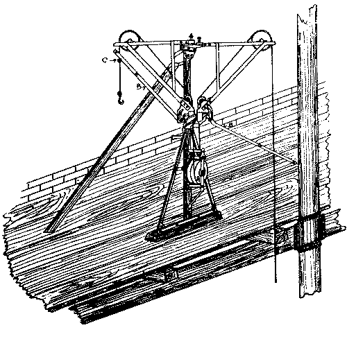 Crane engines—The crane—Pulleys—Differential pulleys—Winch—Jibs—Shears—Gin—Rails—Sack trucks—Attachment of material—Ironwork—Timber —Bricks—Slates—Stone |