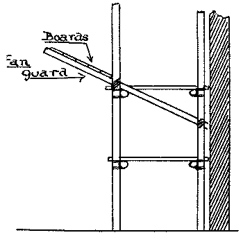 Short ladders—Sagging of ladders—Guard rails—Well holes—Edge boards—Traps—Runs—Supports to centering—Damp cordage—Sound material—Competent control—Fan guards—Due care by workmen |