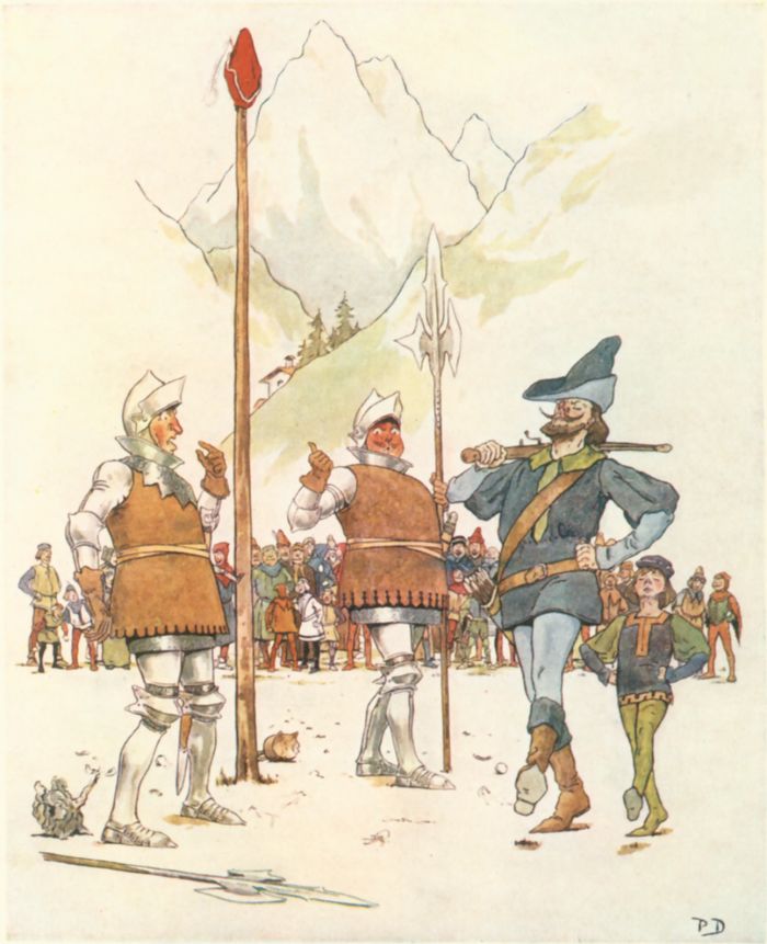 One of the first things the Emperor did was to send his friend Hermann Gessler to govern the country. Gessler was not a nice man, and it soon became plain that he would never make himself really popular with the Swiss. The point on which they disagreed in particular was the question of taxes. The Swiss, who were a simple and thrifty people, objected to paying taxes of any sort. They said they wanted to spend their money on all kinds of other things. Gessler, on the other hand, wished to put a tax on everything, and, being Governor, he did it. He made everyone who owned a flock of sheep pay a certain sum of money to him; and if the farmer sold his sheep and bought cows, he had to pay rather more money to Gessler for the cows than he had paid for the sheep. Gessler also taxed bread, and biscuits, and jam, and buns, and lemonade, and, in fact, everything he could think of, till the people of Switzerland determined to complain. They appointed Walter Fürst, who had red hair and looked fierce; Werner Stauffacher, who had gray hair and was always wondering how he ought to pronounce his name; and Arnold of Melchthal, who had light-yellow hair and was supposed to know a great deal about the law, to make the complaint. They called on the Governor one lovely morning in April, and were shown into the Hall of Audience.