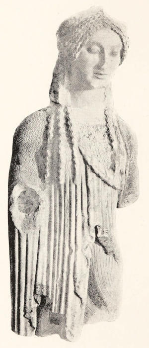 With all his efforts he can frame but a hazy picture of this earlier Acropolis, this citadel before the Persian wars. Probably he might drop the whole question as of merely antiquarian interest—a matter to be noted rather than realized—but that his next experience brings sudden revelation. Skilfully sunk out of sight—to avoid interfering with his realization of Periklean Athens—is the small Acropolis Museum. Entering it, he finds himself in a moment actually within that other and earlier Athens dimly discerned, and instantly he knows it, not as a world of ground-plans and fragmentary Pelasgic fortifications, but as a kingdom of art and of humanity vivid with colour and beauty.