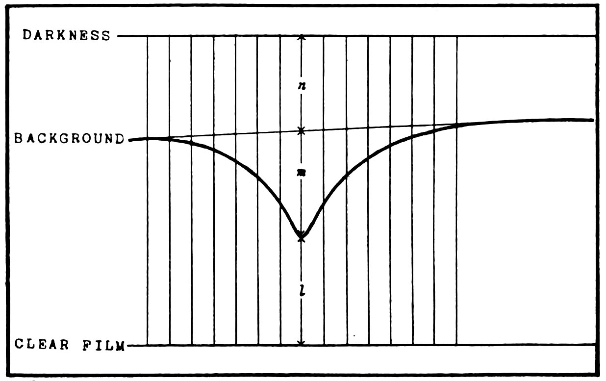 Figure 2.—Diagram of an absorption line, as registered by the microphotometer, showing the method of measuring the tracings. The quantities n (“darkness” to “background curve”), m (“background curve” to “line”), and l (“line” to “clear film”) were measured at intervals of five scale divisions, indicated by the vertical lines.