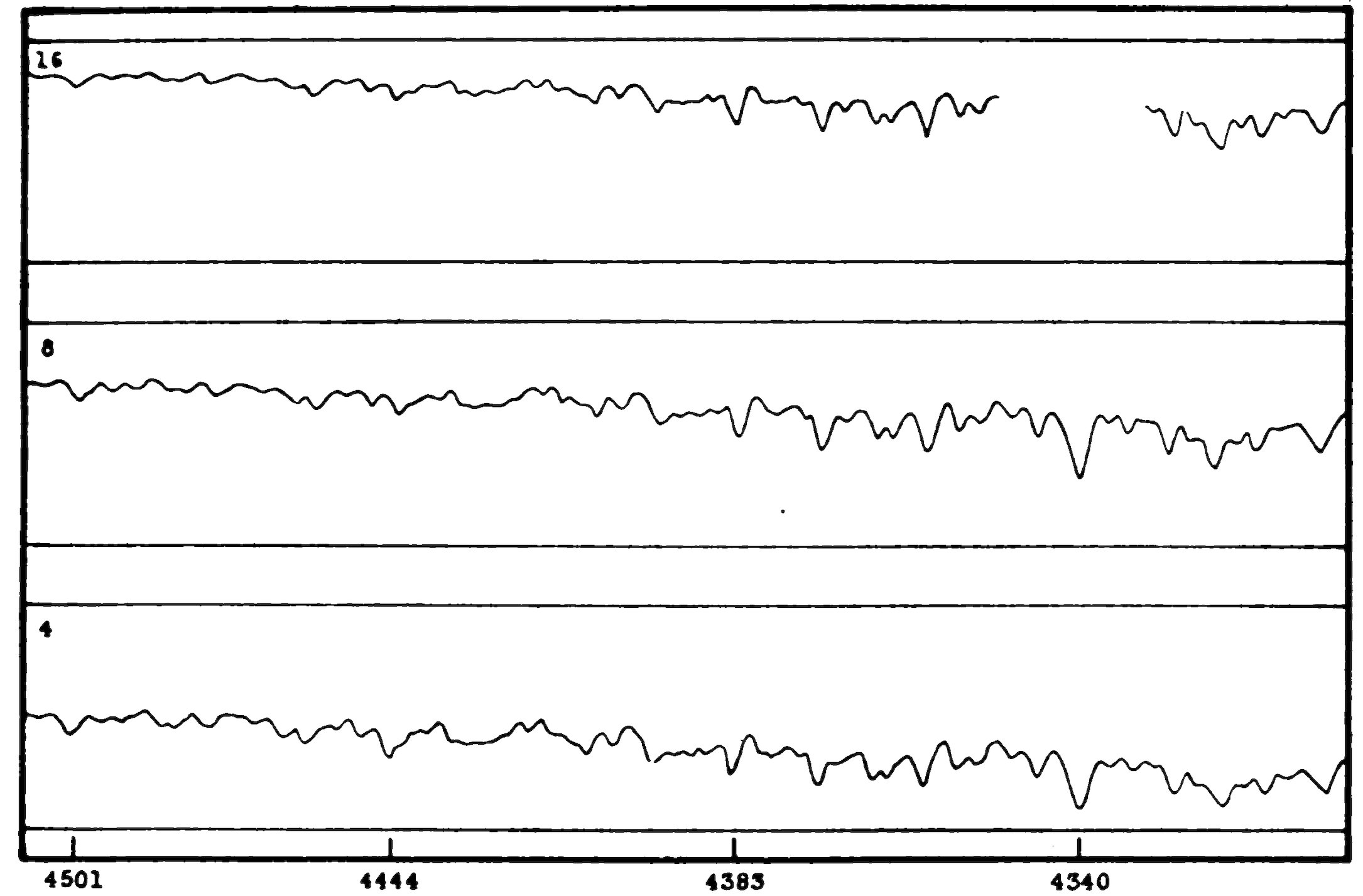 a. Accuracy of plates.—A qualitative test of the reliability of the spectra used is made by examining the reproduction of line detail throughout the whole series made for one star. Figure 4 shows the microphotometer tracings for a portion of the spectrum of δ Canis Majoris, made with apertures 16, 8, and 4. Figure 5 shows a similar series of tracings made from spectra of α Persei, taken with apertures 16, 8, 4, and 2. It may be seen that the reproduction of line detail is satisfactorily faithful, although a few spurious details can be detected.