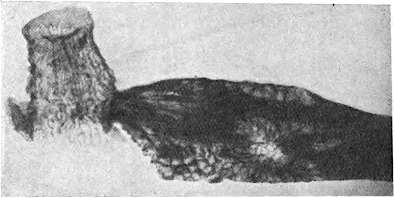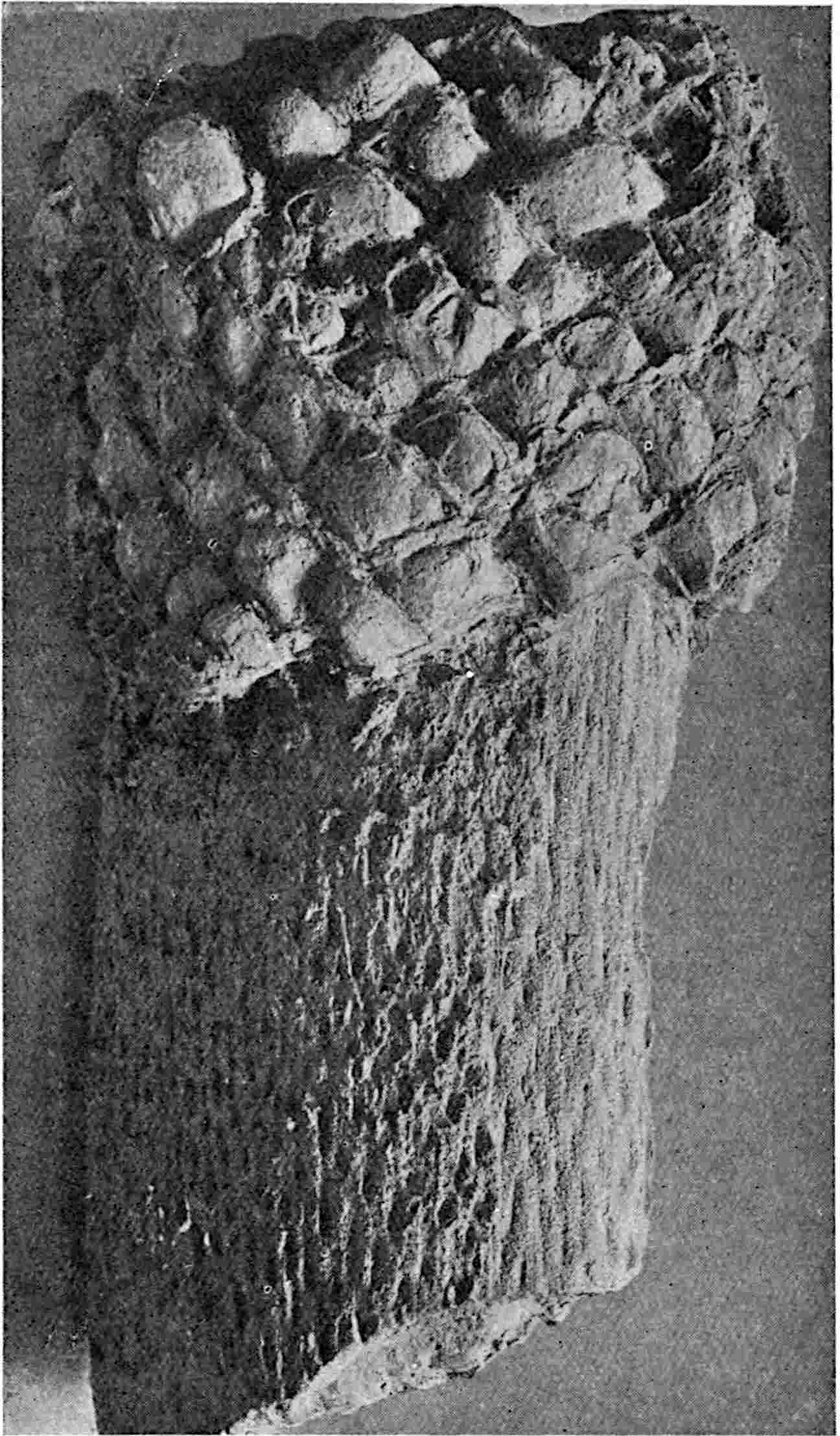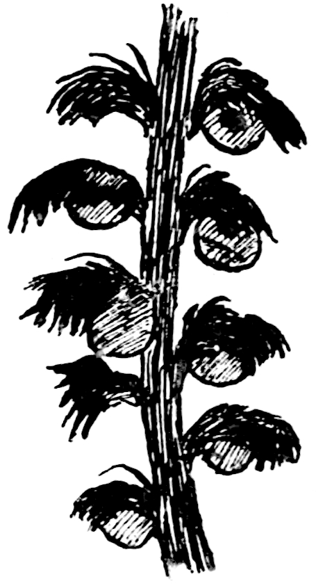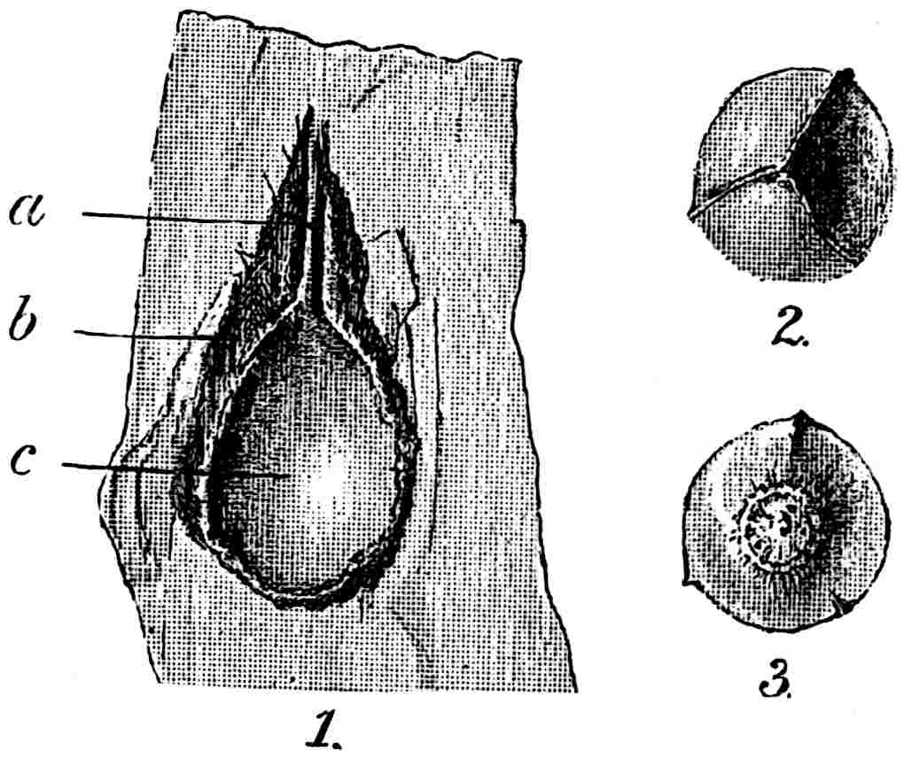 The employment of this generic name may serve a useful purpose if used for specimens, whether preserved as petrifactions or impressions, believed to be portions of Cycadean frond-axes, but which in the absence of pinnae cannot be assigned to one of the recognised genera of fronds. Saporta[1770] describes two species from Kimmeridgian beds in France, Cycadorachis abscissa and C. armata: the first may be the winged base of a Cycadean petiole, but it agrees equally well with the broad base of an Osmundaceous 591leaf and should not be referred to a genus implying affinity with a particular class. The other species, C. armata, is probably a piece of a spinous axis like that of the Wealden plant Sewardia latifolia (Sap.). A fragment figured by Fliche and Bleicher[1771] from the Jurassic of Nancy as C. tuberculata is another example of a fossil which cannot be referred with any certainty to the Cycads.