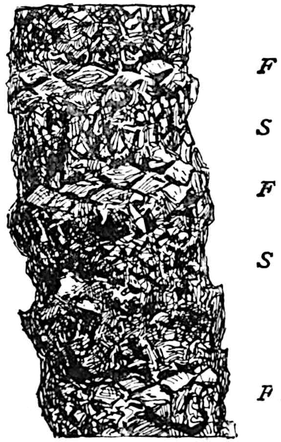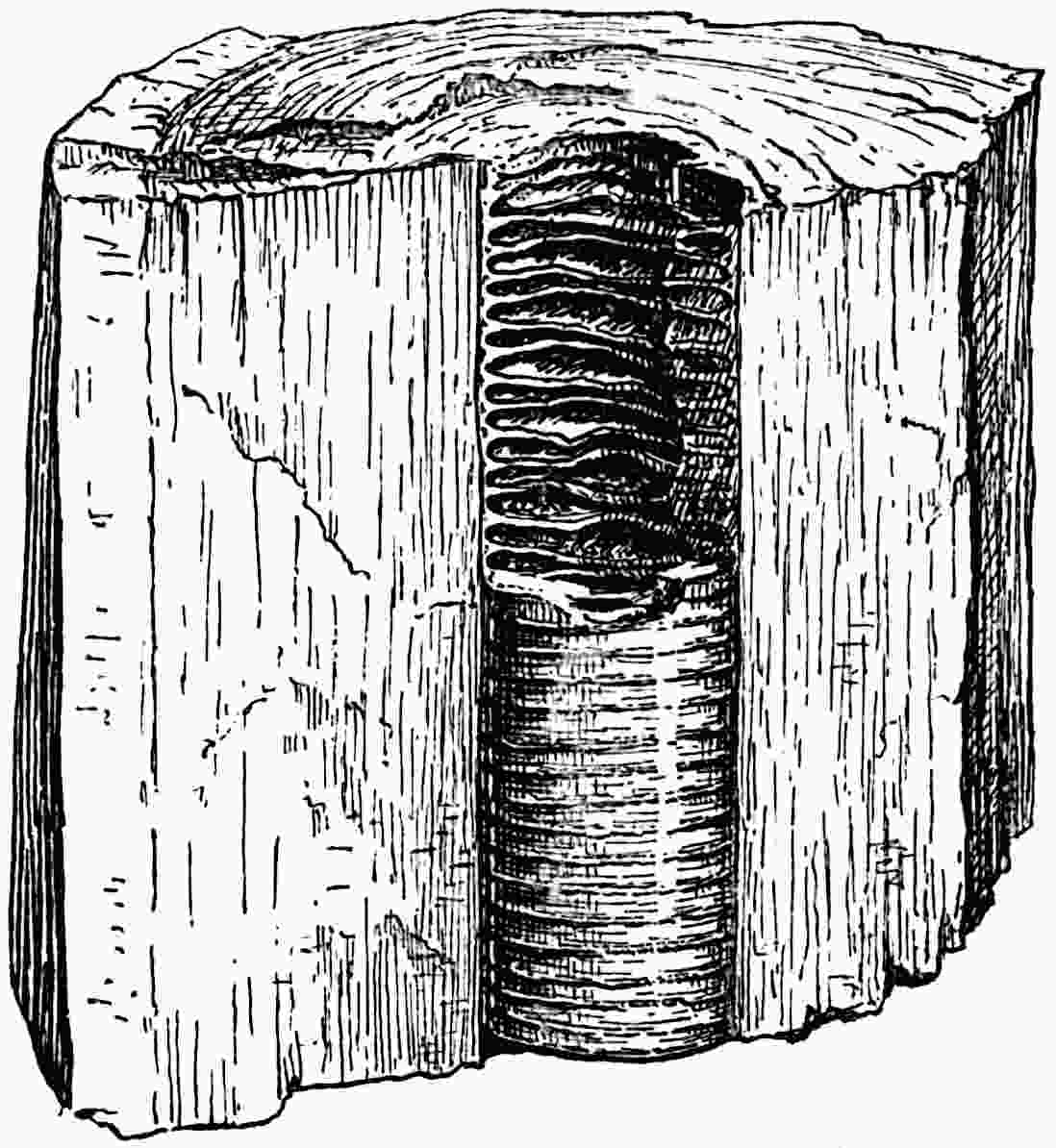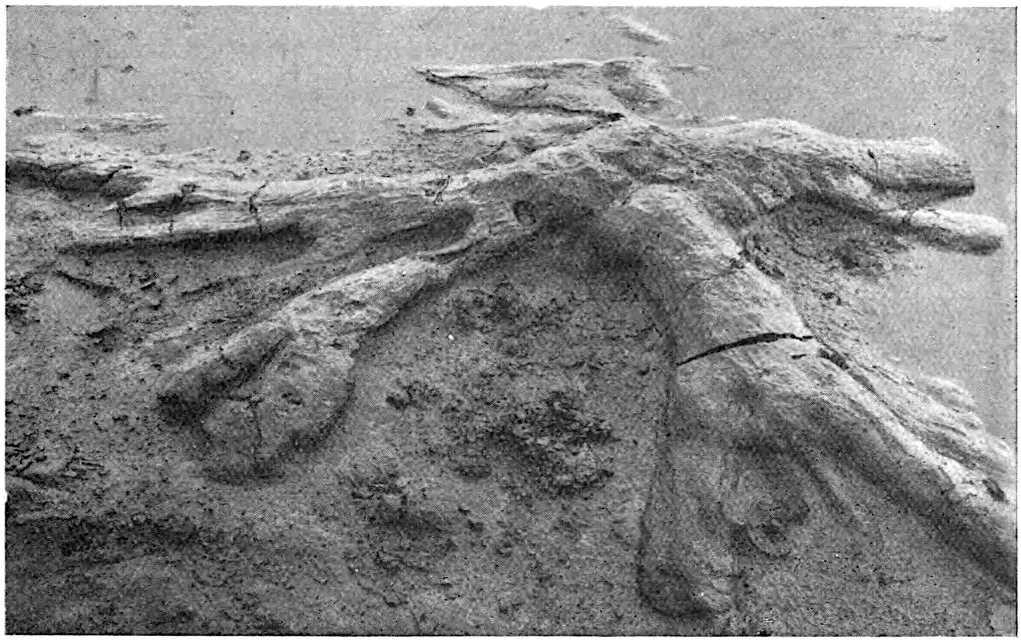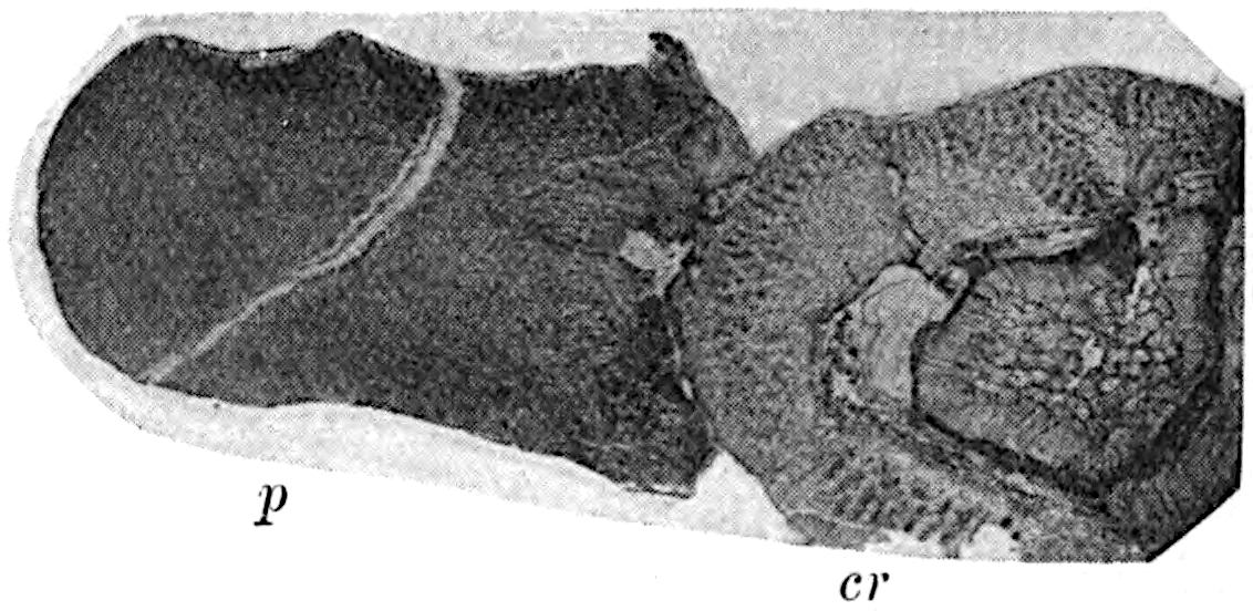 The employment of this generic name may serve a useful purpose if used for specimens, whether preserved as petrifactions or impressions, believed to be portions of Cycadean frond-axes, but which in the absence of pinnae cannot be assigned to one of the recognised genera of fronds. Saporta[1770] describes two species from Kimmeridgian beds in France, Cycadorachis abscissa and C. armata: the first may be the winged base of a Cycadean petiole, but it agrees equally well with the broad base of an Osmundaceous 591leaf and should not be referred to a genus implying affinity with a particular class. The other species, C. armata, is probably a piece of a spinous axis like that of the Wealden plant Sewardia latifolia (Sap.). A fragment figured by Fliche and Bleicher[1771] from the Jurassic of Nancy as C. tuberculata is another example of a fossil which cannot be referred with any certainty to the Cycads.