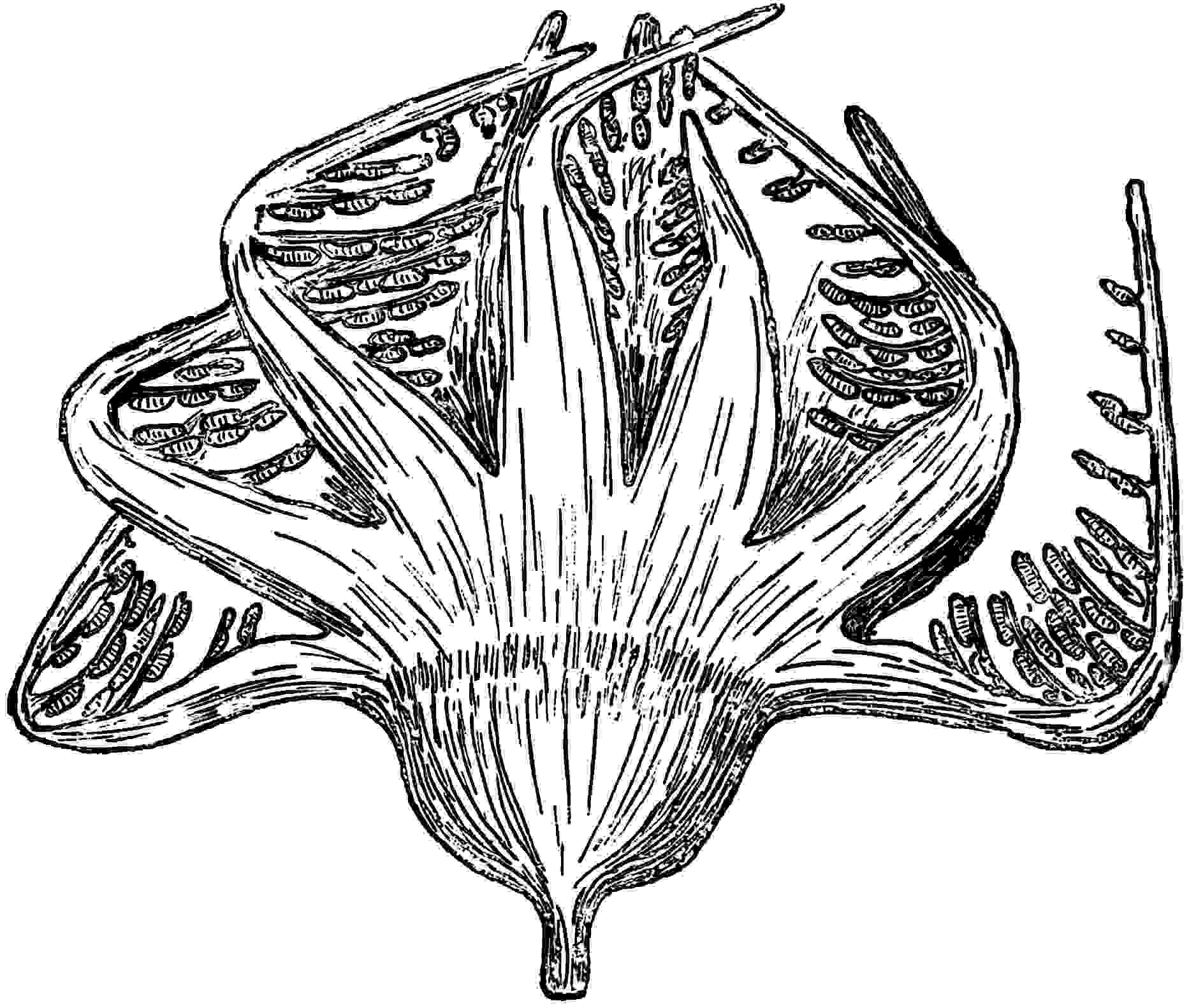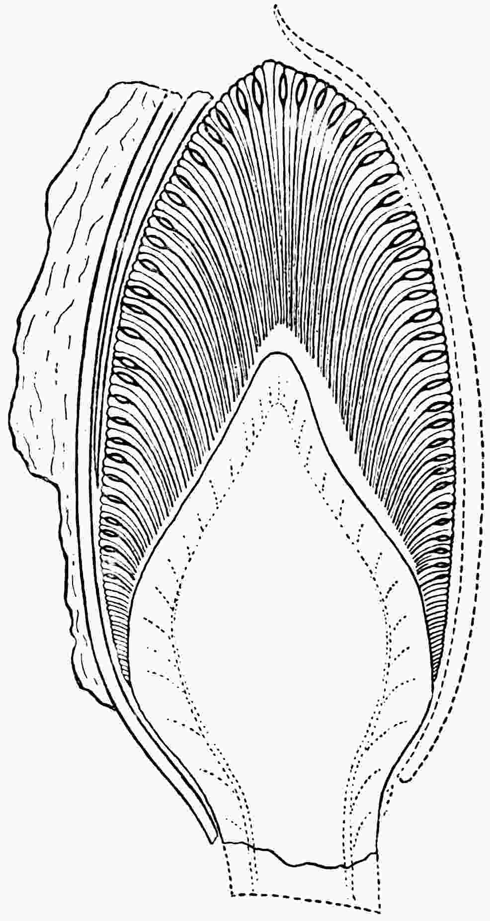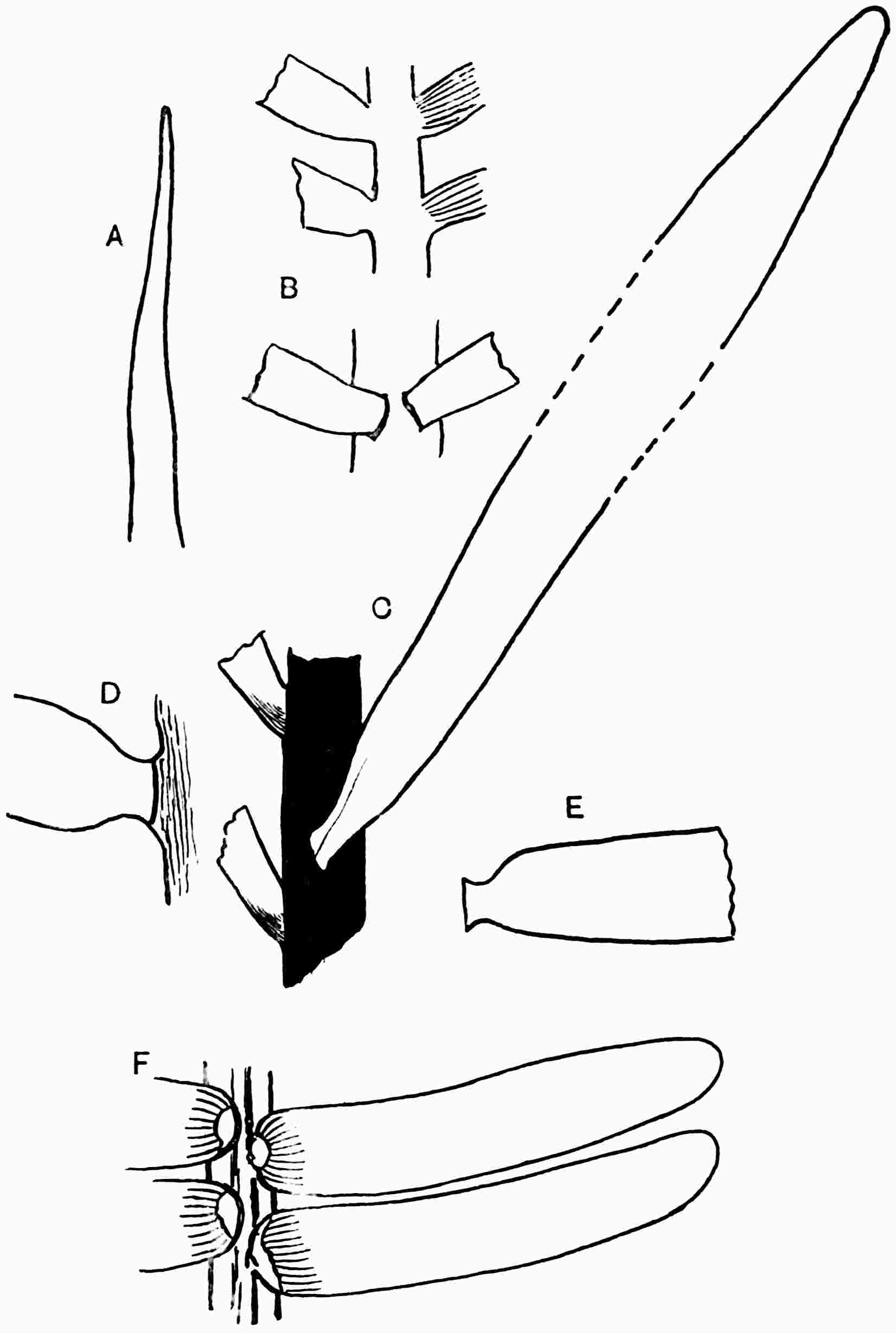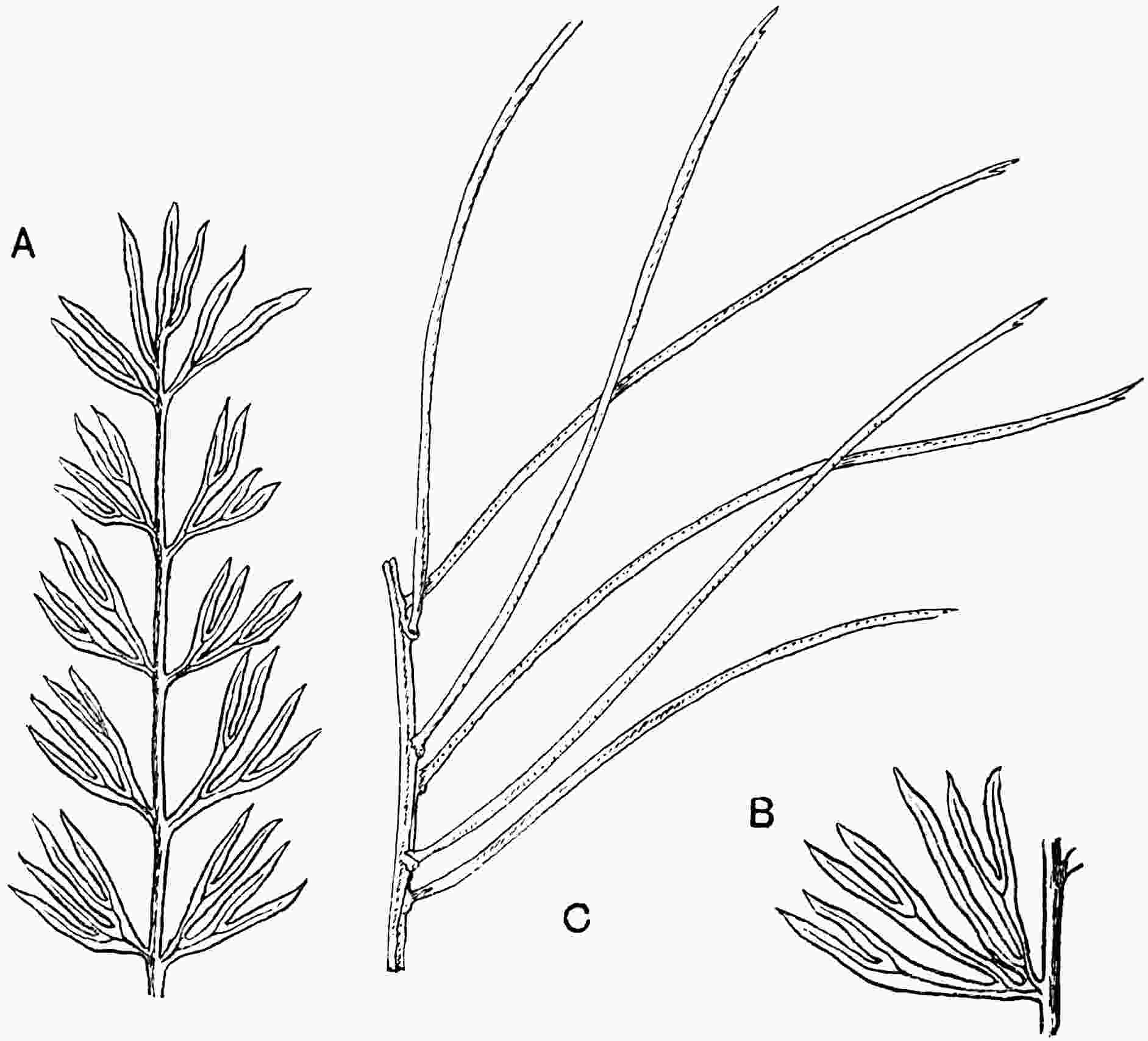 Linear fronds varying considerably in breadth and in the degree of dissection of the lamina, which may be entire; the margin may show broad and shallow crenulations or there may be a few narrow and deep sinuses cutting the otherwise entire lamina into long and narrow segments. More usually the lamina is divided to the rachis into numerous truncate segments traversed by parallel, simple, veins extending from a narrow groove in the middle of the rachis on the upper surface of the frond (fig. 619, E). The veins run in very narrow grooves in the generally flat but occasionally corrugated lamina[1670].
