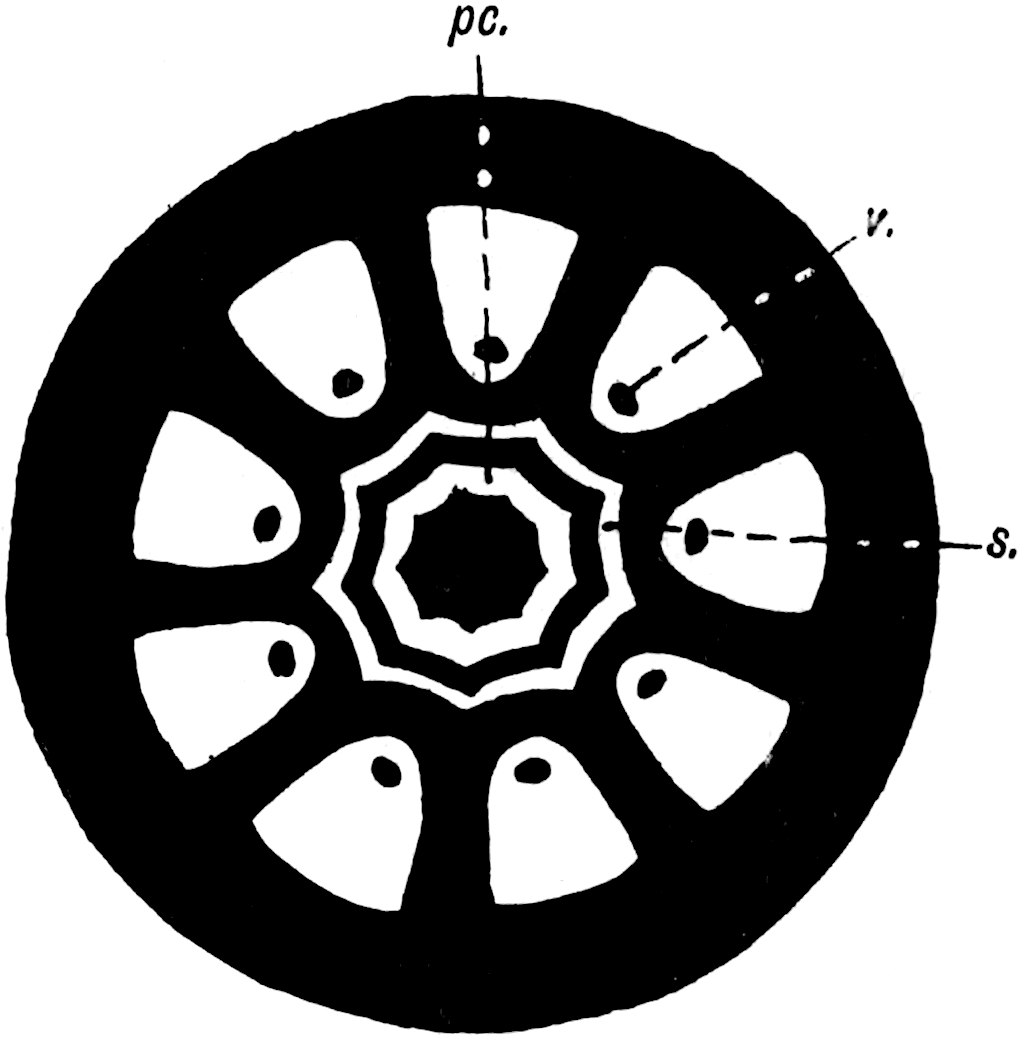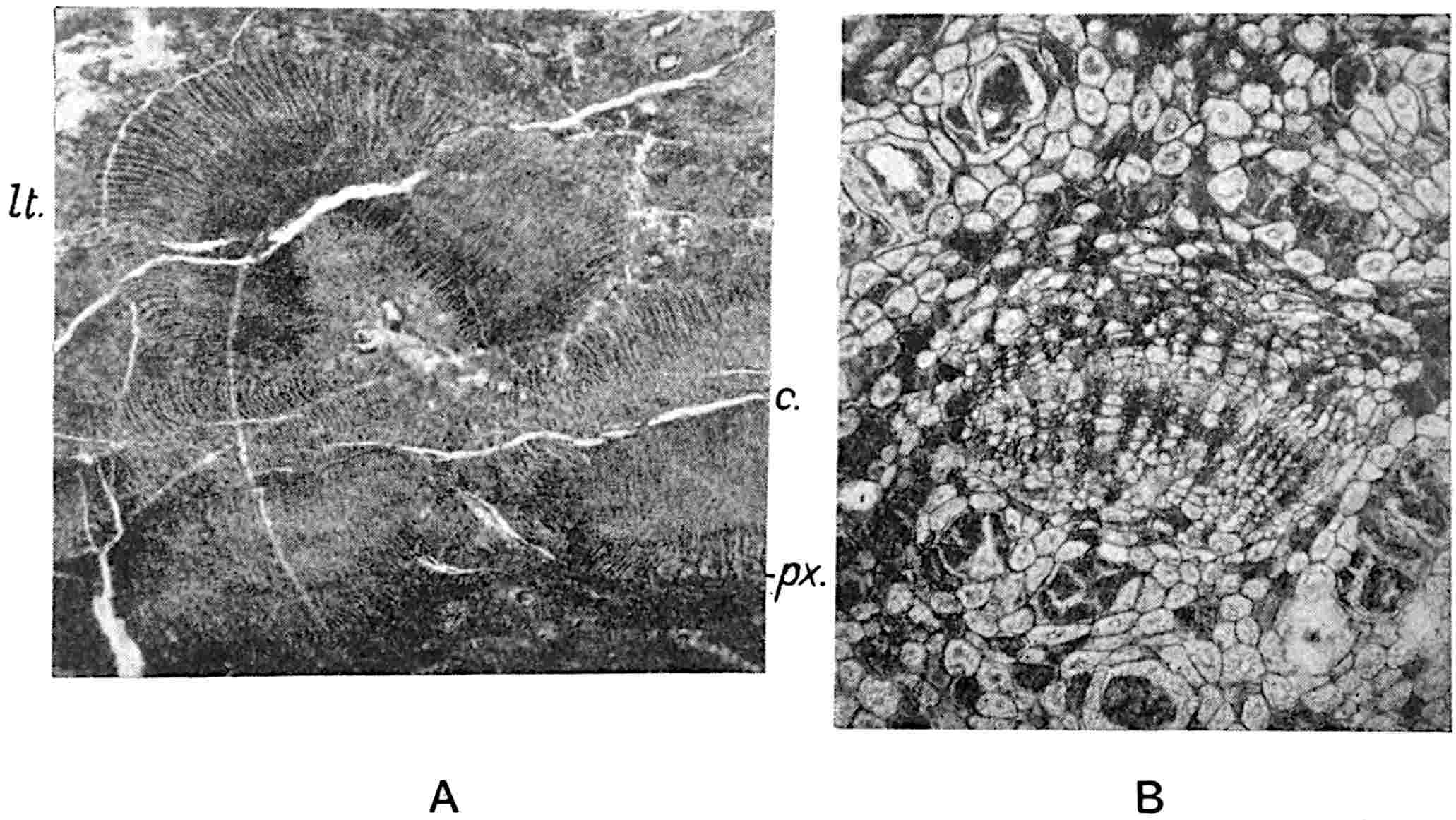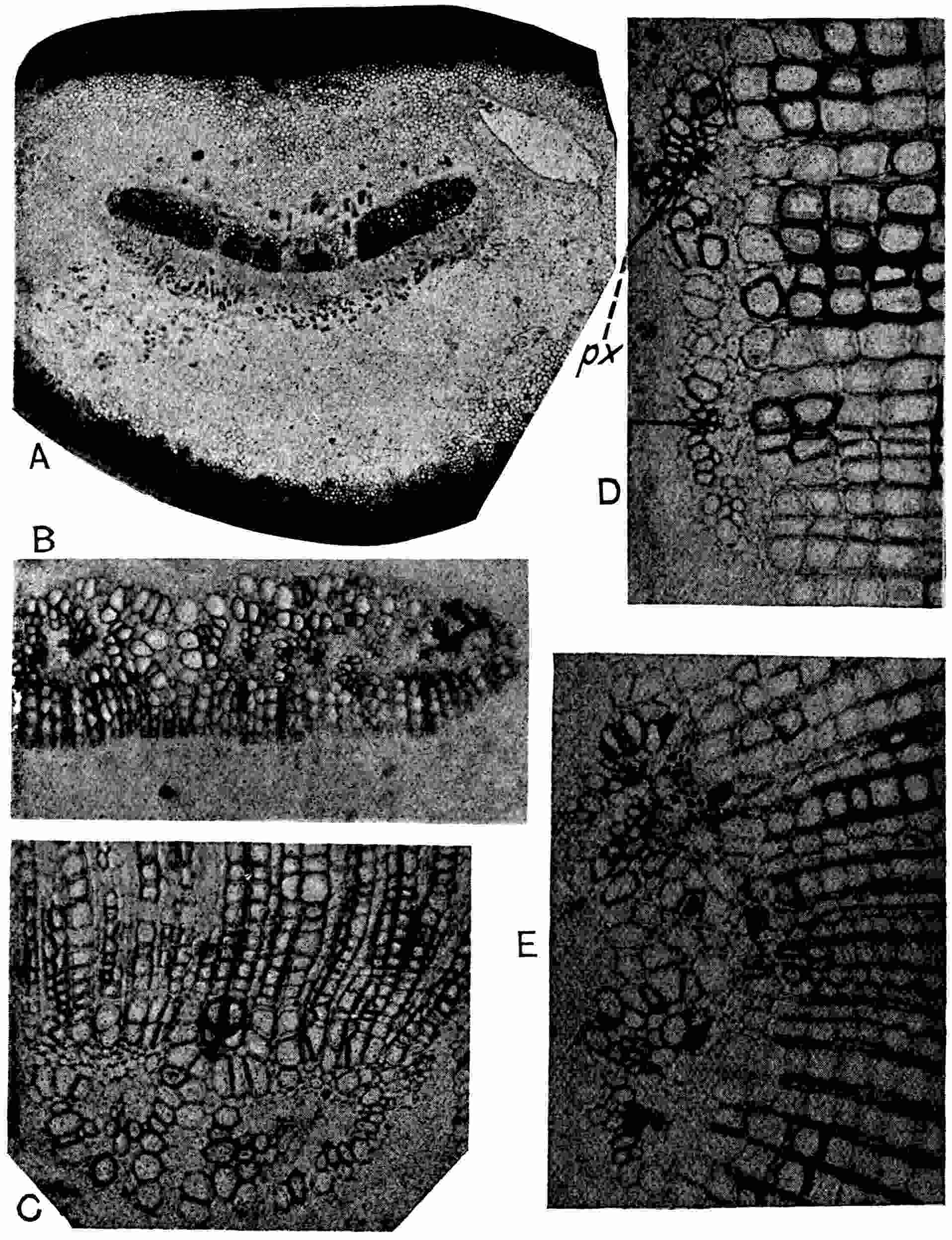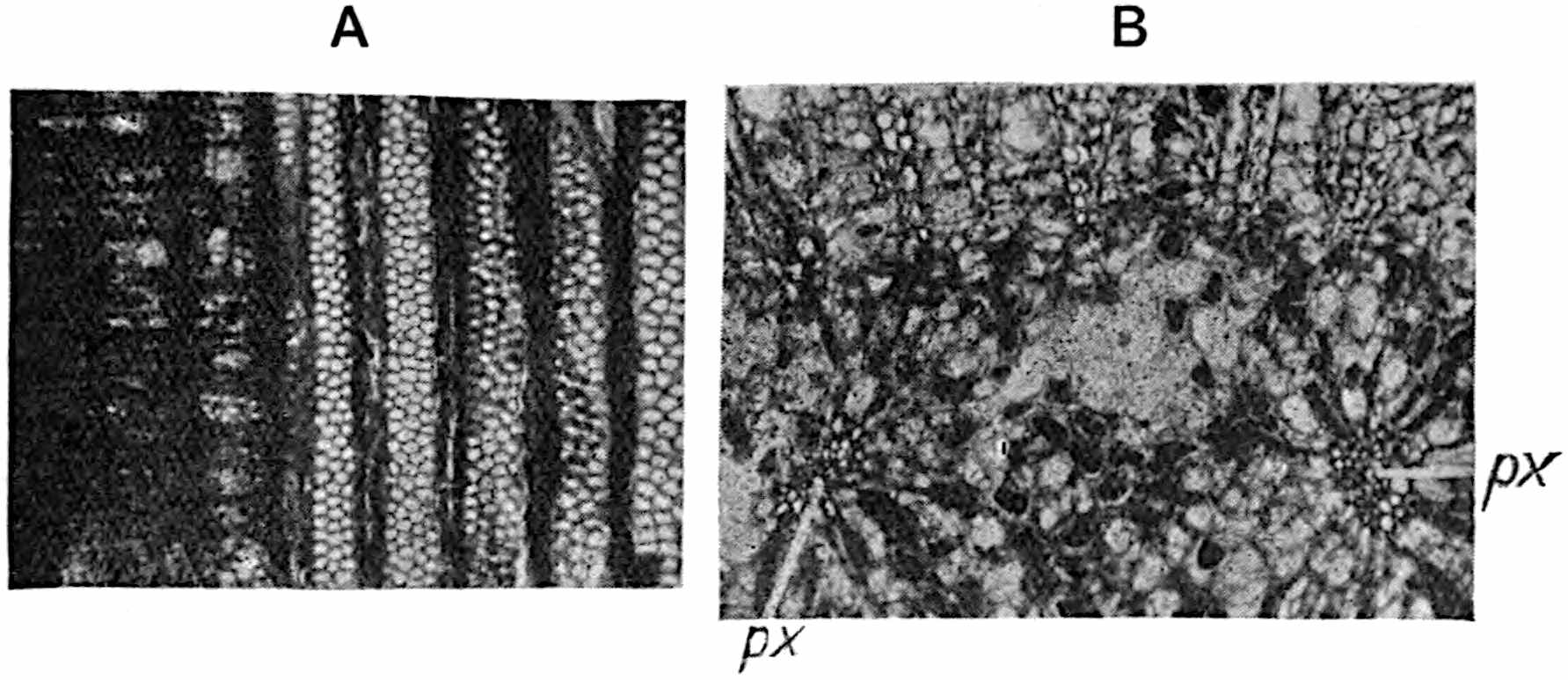 ‘The re-examination of Pitys primaeva and P. antiqua in the light of the structure exhibited by numerous specimens of a new species recently discovered in Haddingtonshire has shown that all three types are similar as regards the structure of the primary wood. In each case the primary cylinder is comparable with that in Archaeopitys Eastmanii [see p. 290], i.e., there are medullary as well as circummedullary xylem-strands. In certain specimens of the new species, Pitys Dayii, the bark and leaves are preserved and thus the details of leaf-trace emission from the stem have been determined. The leaves are short and stout and taper gradually to a point, quite distinct from the long, thin, spatulate Cordaitean foliage. The internal structure of the leaf renders it easily distinguishable from the Cordaites type while it tends to accentuate the possible relationship of Pitys with the Lyginodendreae.’