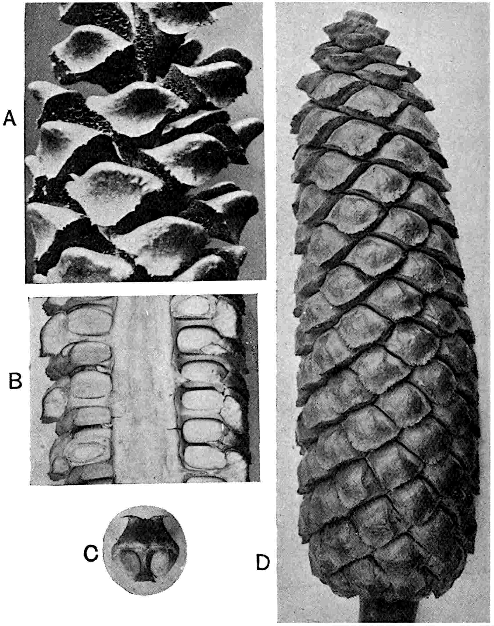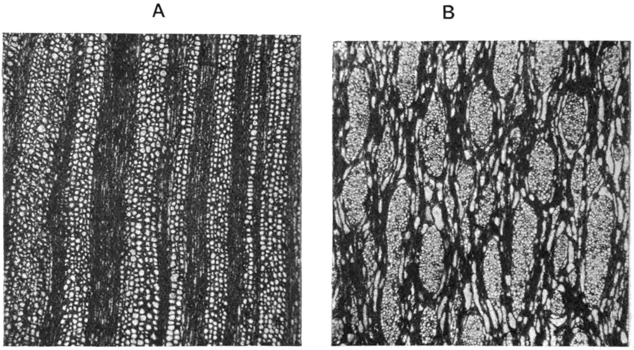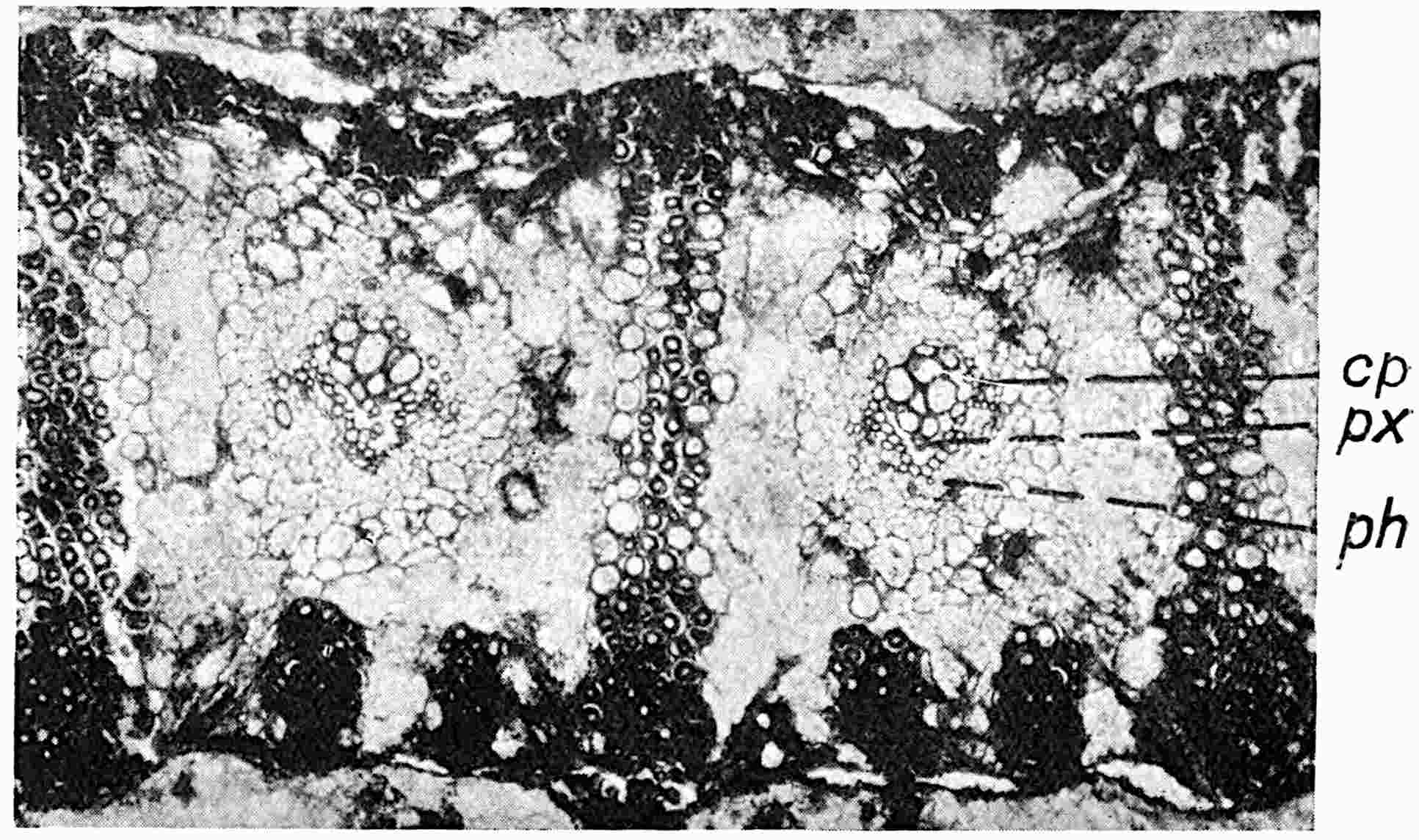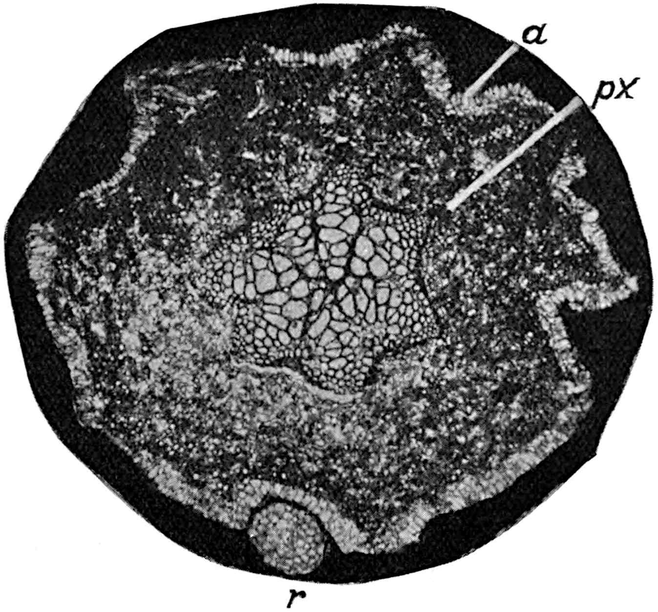 ‘The re-examination of Pitys primaeva and P. antiqua in the light of the structure exhibited by numerous specimens of a new species recently discovered in Haddingtonshire has shown that all three types are similar as regards the structure of the primary wood. In each case the primary cylinder is comparable with that in Archaeopitys Eastmanii [see p. 290], i.e., there are medullary as well as circummedullary xylem-strands. In certain specimens of the new species, Pitys Dayii, the bark and leaves are preserved and thus the details of leaf-trace emission from the stem have been determined. The leaves are short and stout and taper gradually to a point, quite distinct from the long, thin, spatulate Cordaitean foliage. The internal structure of the leaf renders it easily distinguishable from the Cordaites type while it tends to accentuate the possible relationship of Pitys with the Lyginodendreae.’