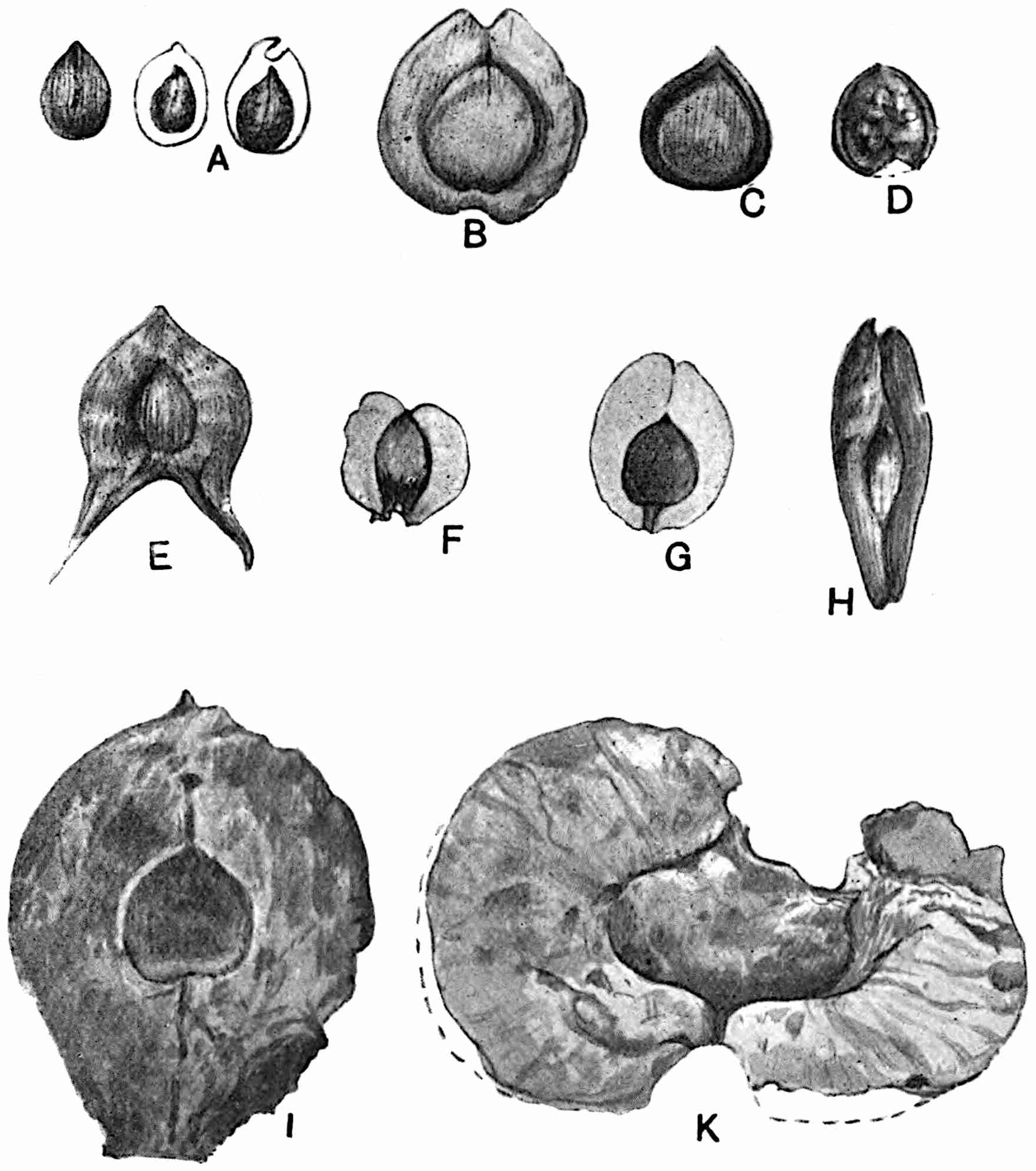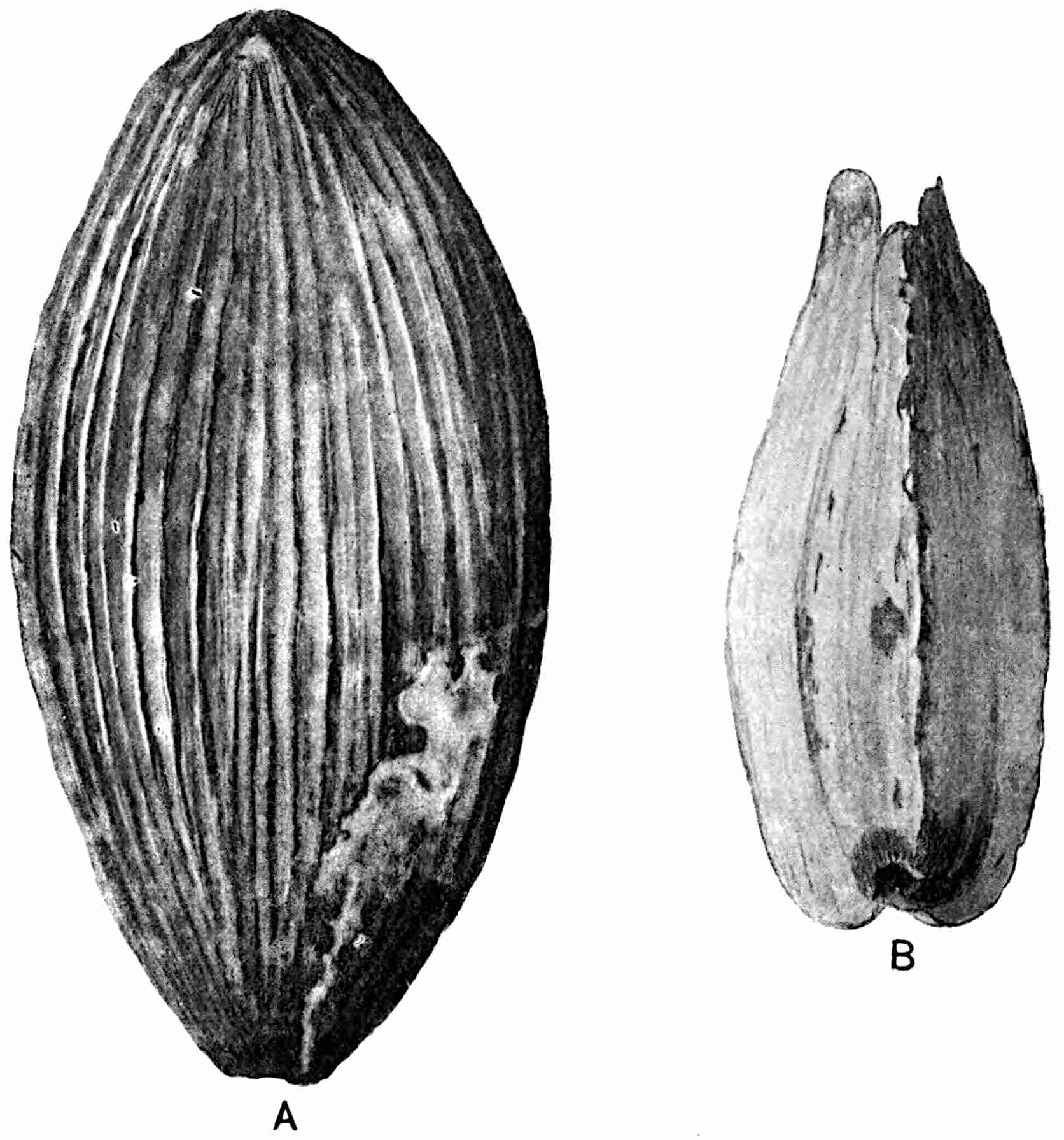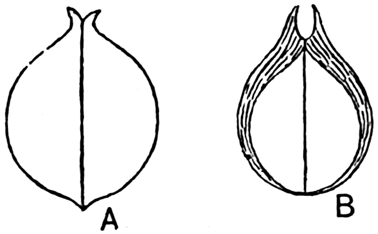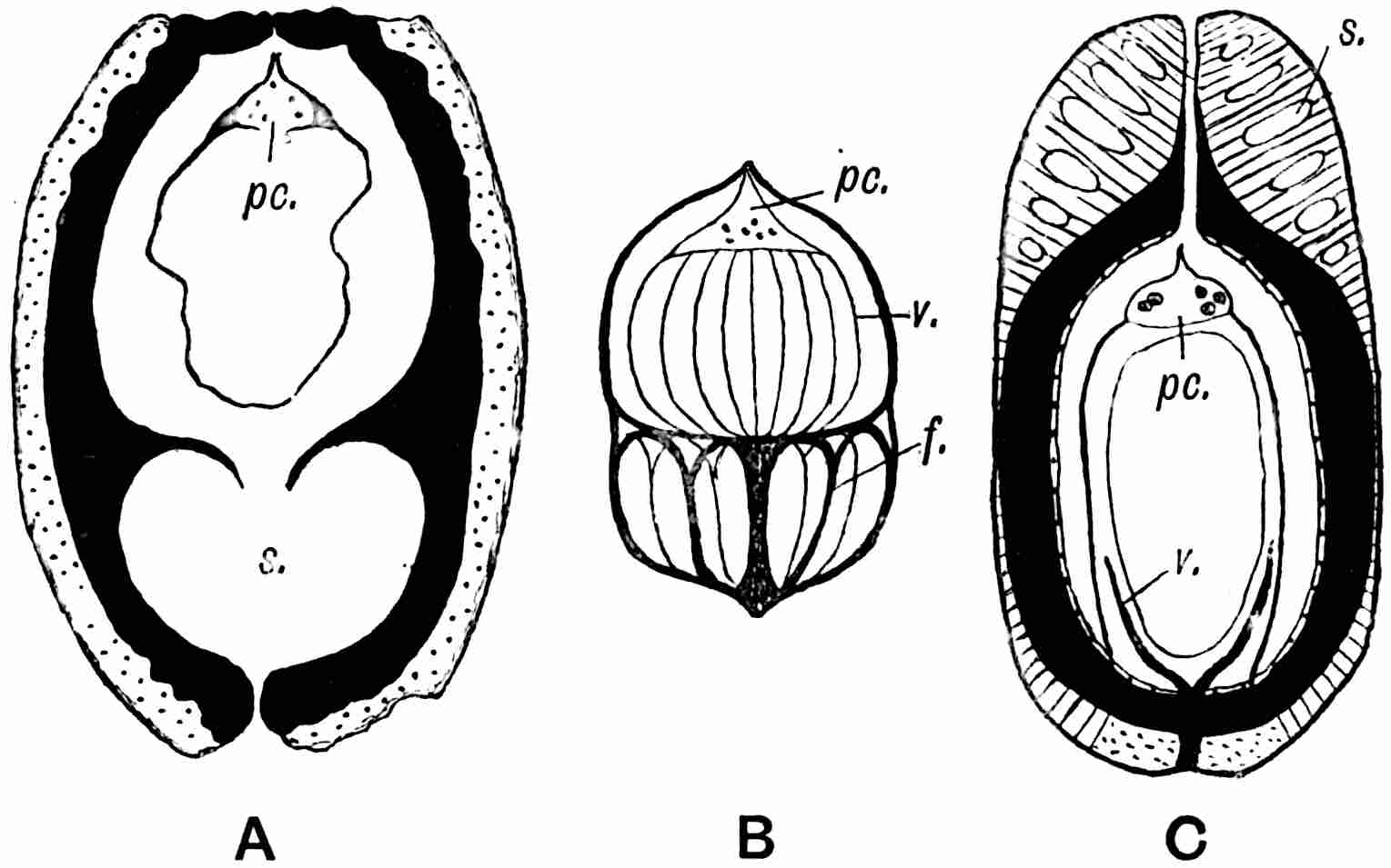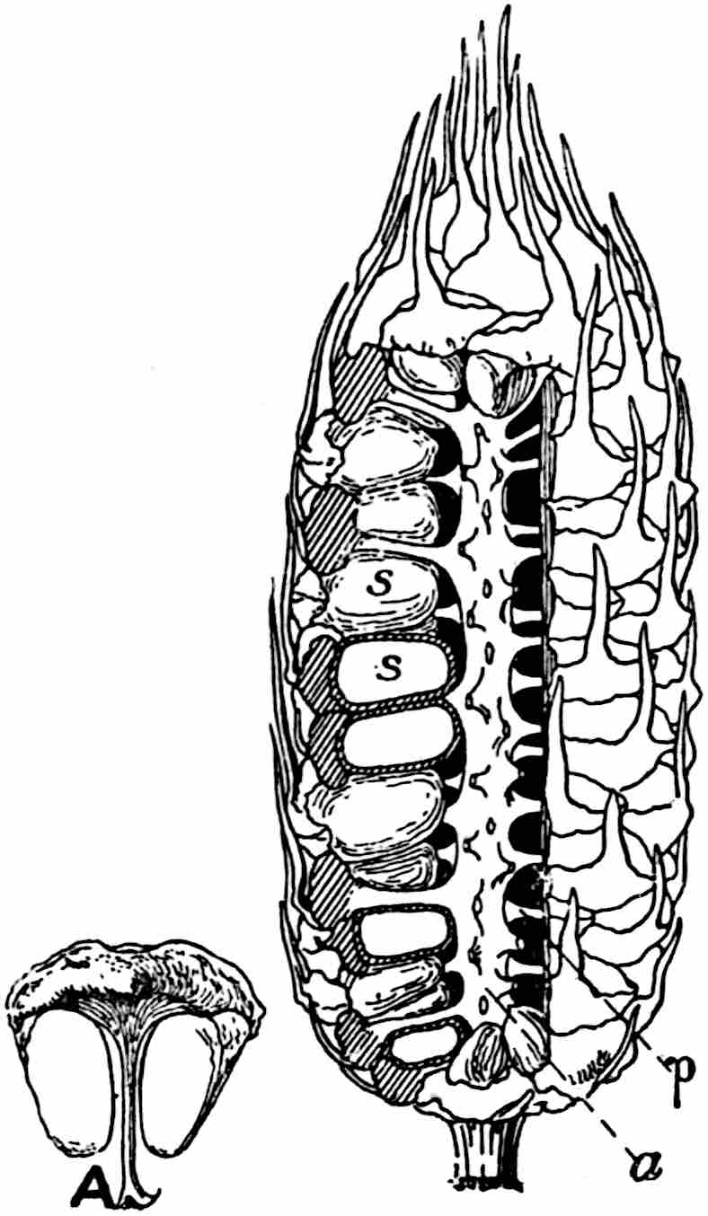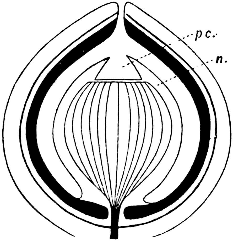 A Rhaetic Scanian species originally referred by Nathorst[1678] to Nilssonia but later removed by him to Dioonites[1679] and in 1909 reinstated in Nilssonia[1680] on the ground that the lamina covers the upper face of the rachis. The segments are fairly uniform in breadth and linear; they reach 10 cm. in length and are usually 5–7 mm. broad; the lamina is slightly tapered towards the apex (fig. 619, B). There are 3–10 parallel grooves on the upper 573face of the segments and between each pair is a single unbranched vein. In close association with portions of three fronds of this species Nathorst found several oval bodies, 1 cm. × 7 mm., which he at first regarded as ‘antherangia’ comparable with the sporocarps of the Hydropterideae, but an examination of the carbonised tissue demonstrated that the small rounded bodies contained in each of the ‘antherangia,’ originally believed to be pollen-sacs, are grains of resin internal to a cuticle of thick-walled cells and probably formed by secretory sacs in a fleshy tissue. Internal to the resin-bodies is a second cuticle which may be the remains of a nucellus, the outer cuticle and the resin belonging to the sarcotesta. Nathorst’s careful examination of these fossils shows that they are seeds (fig. 619, A) and were probably borne on plants of N. pterophylloides, though an accidental association is not improbable.