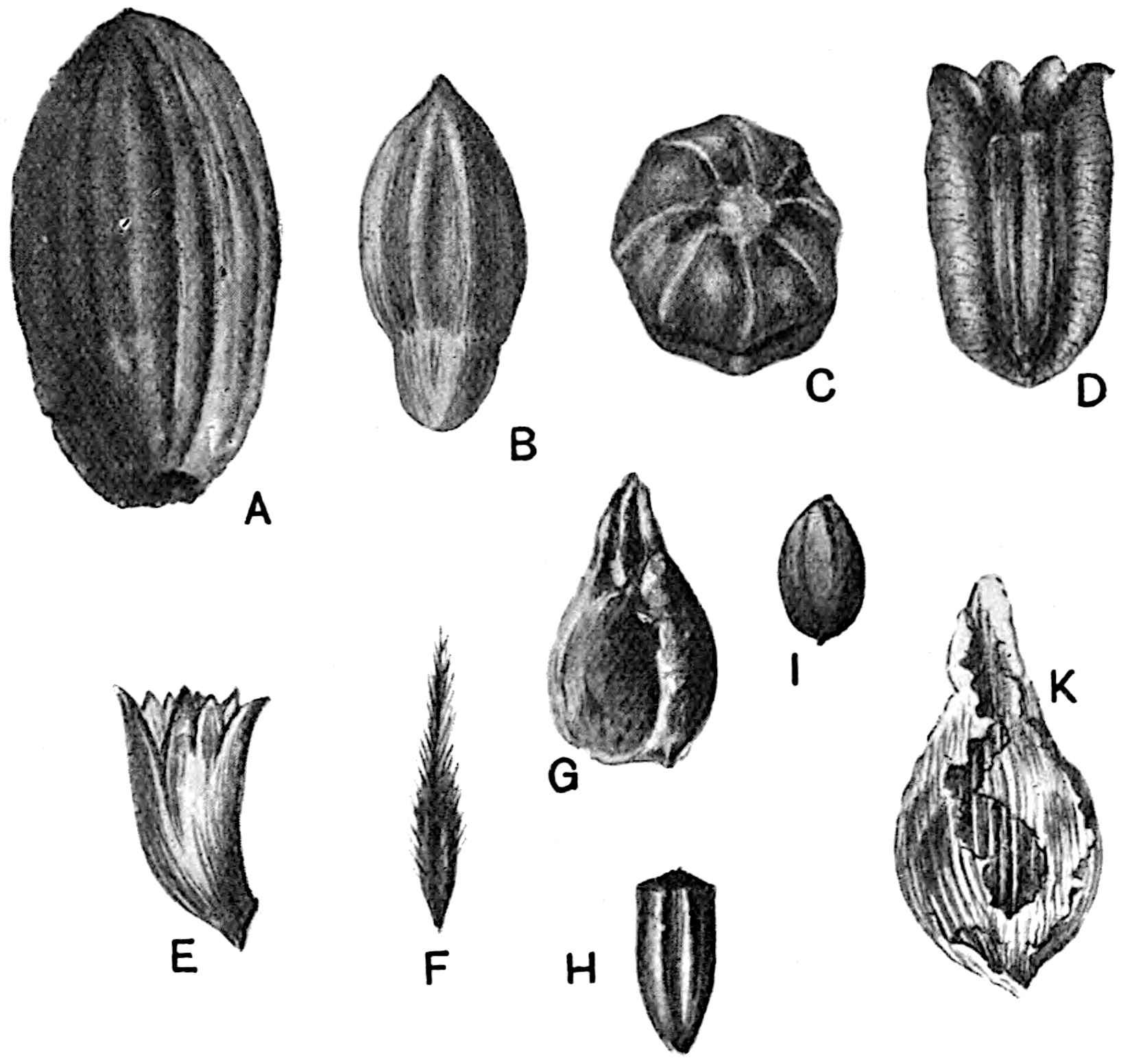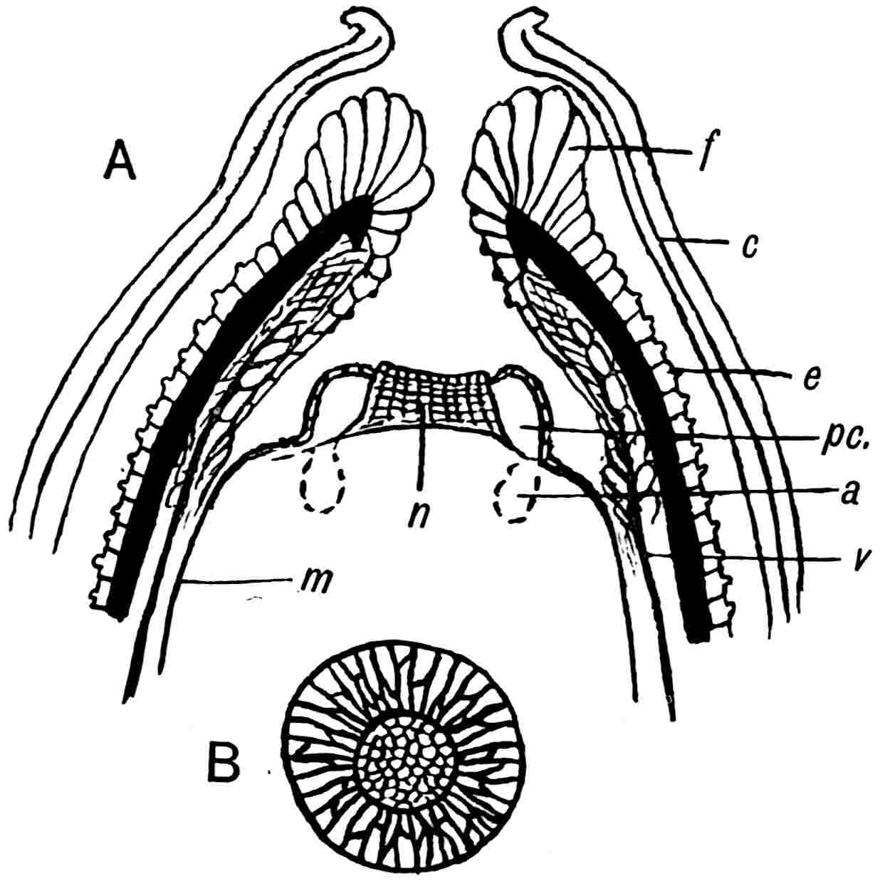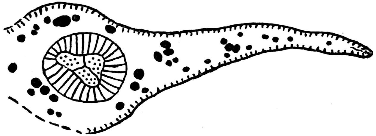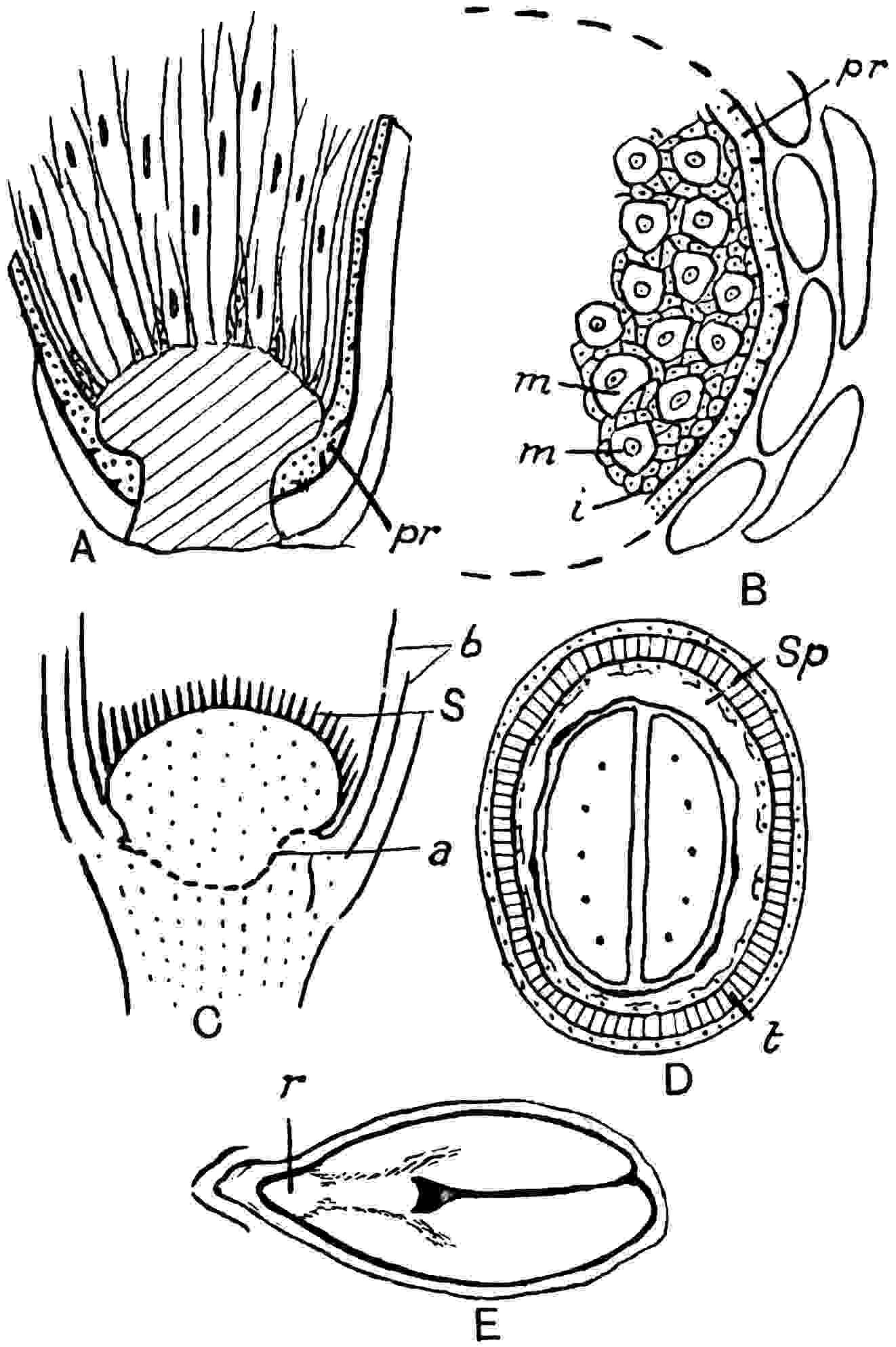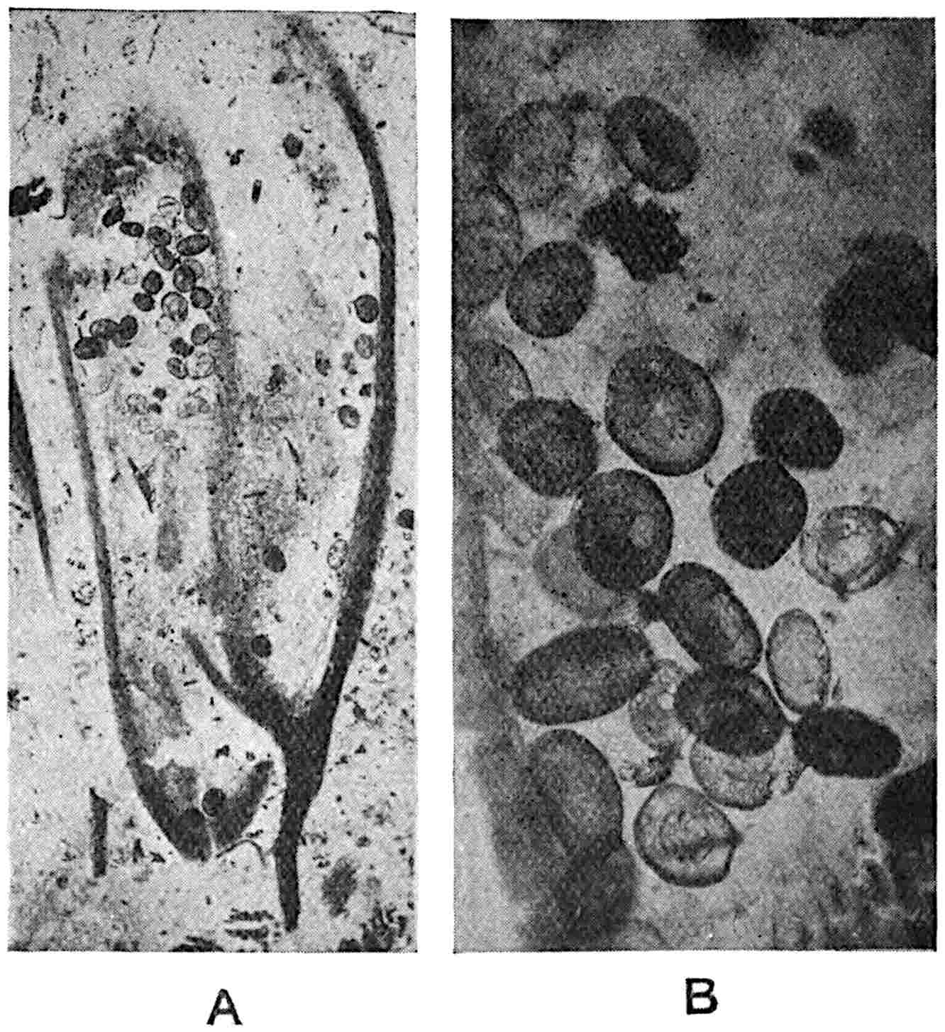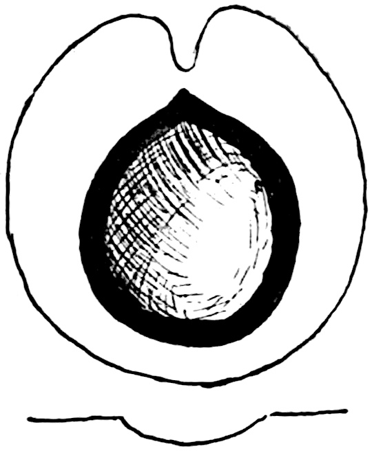 A Rhaetic Scanian species originally referred by Nathorst[1678] to Nilssonia but later removed by him to Dioonites[1679] and in 1909 reinstated in Nilssonia[1680] on the ground that the lamina covers the upper face of the rachis. The segments are fairly uniform in breadth and linear; they reach 10 cm. in length and are usually 5–7 mm. broad; the lamina is slightly tapered towards the apex (fig. 619, B). There are 3–10 parallel grooves on the upper 573face of the segments and between each pair is a single unbranched vein. In close association with portions of three fronds of this species Nathorst found several oval bodies, 1 cm. × 7 mm., which he at first regarded as ‘antherangia’ comparable with the sporocarps of the Hydropterideae, but an examination of the carbonised tissue demonstrated that the small rounded bodies contained in each of the ‘antherangia,’ originally believed to be pollen-sacs, are grains of resin internal to a cuticle of thick-walled cells and probably formed by secretory sacs in a fleshy tissue. Internal to the resin-bodies is a second cuticle which may be the remains of a nucellus, the outer cuticle and the resin belonging to the sarcotesta. Nathorst’s careful examination of these fossils shows that they are seeds (fig. 619, A) and were probably borne on plants of N. pterophylloides, though an accidental association is not improbable.
