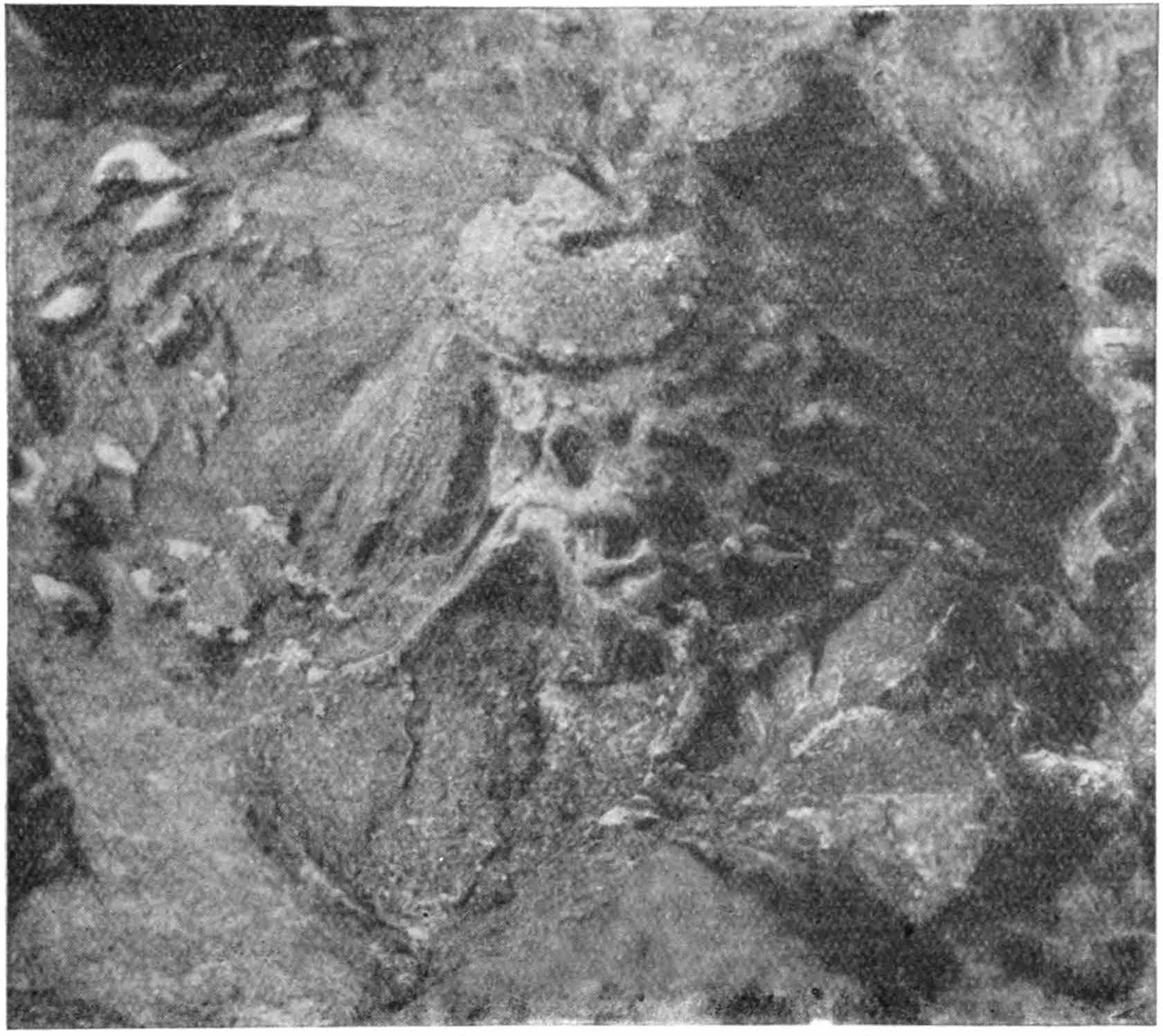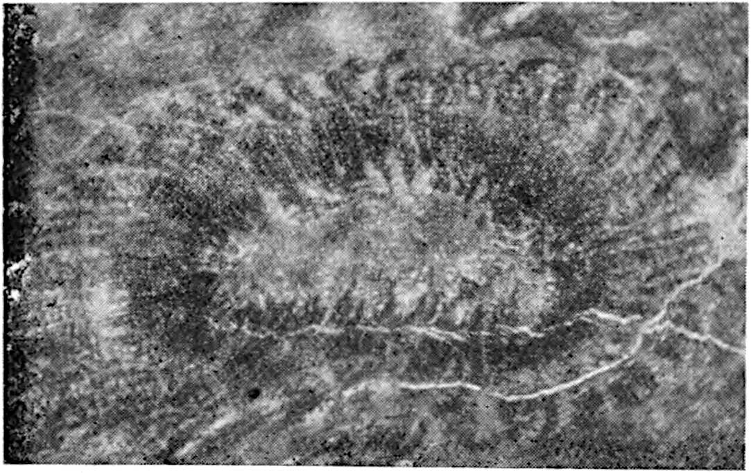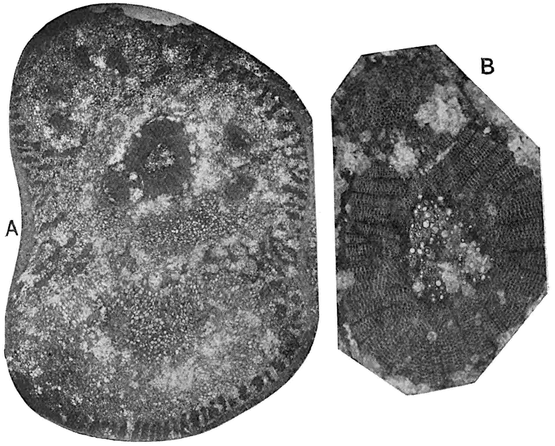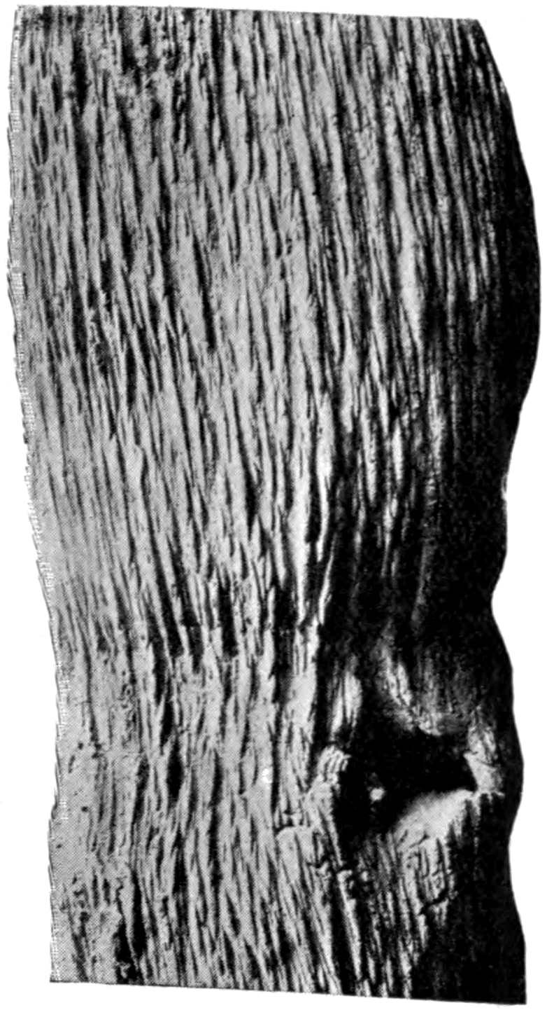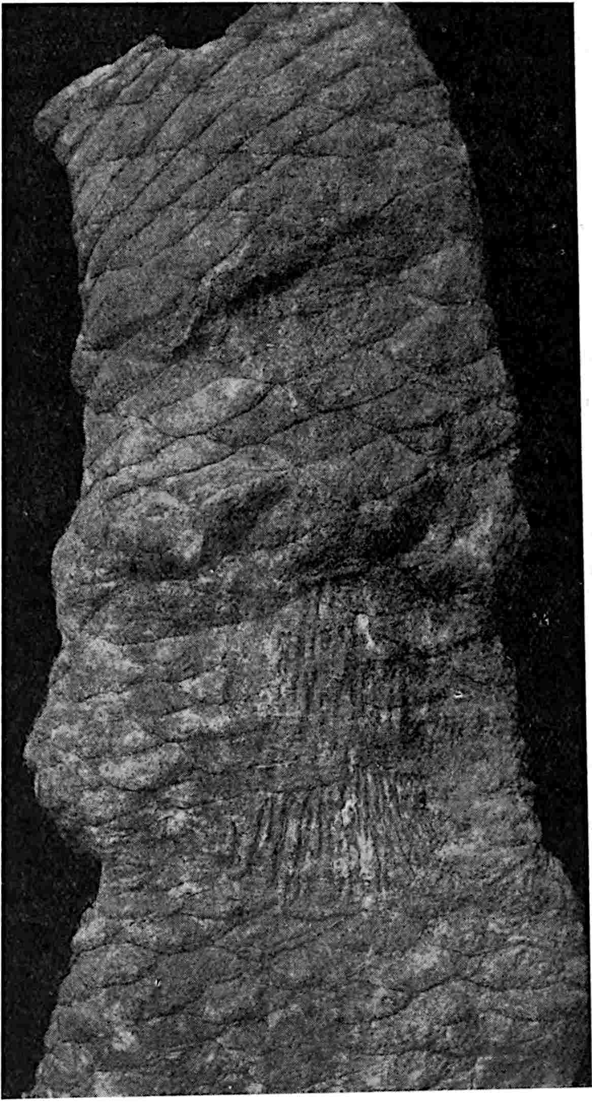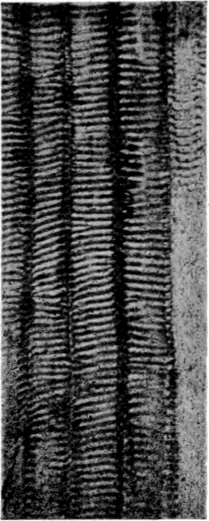 The pinna shown in fig. 624 from the Jurassic beds in Yorkshire[1737] is interesting as one of the few examples of the preservation of the cuticular membrane. The straight or curved walls of the epidermal cells agree with those of recent Cycads except Stangeria, and each cell bears a large central papilla that gives to the lamina the finely punctate appearance which has been regarded as evidence of sporangia. The gaps in the cuticle probably mark the position of sunken stomata.