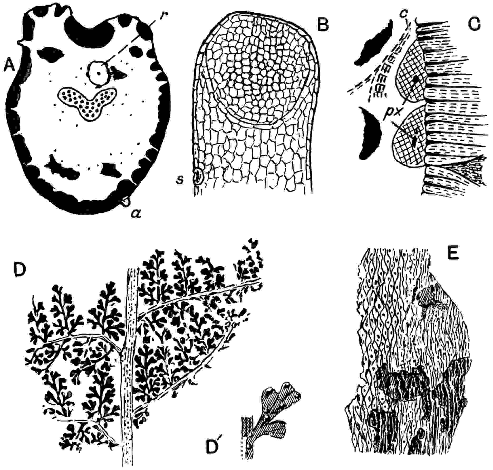 This species[1576], from rocks usually spoken of as Liassic but not improbably Middle Jurassic in age, differs from D. falcatus in the slightly more falcate form of the pinnae and in the more strongly auriculate upper angle of the base of the lamina. The stomata[1577] are confined to the lower epidermis and the strongly cuticularised guard-cells frequently lie at right-angles to the course of the veins. The epidermal cells have very sinuous walls (fig. 609, C) and in the middle of each is a prominent papilla.