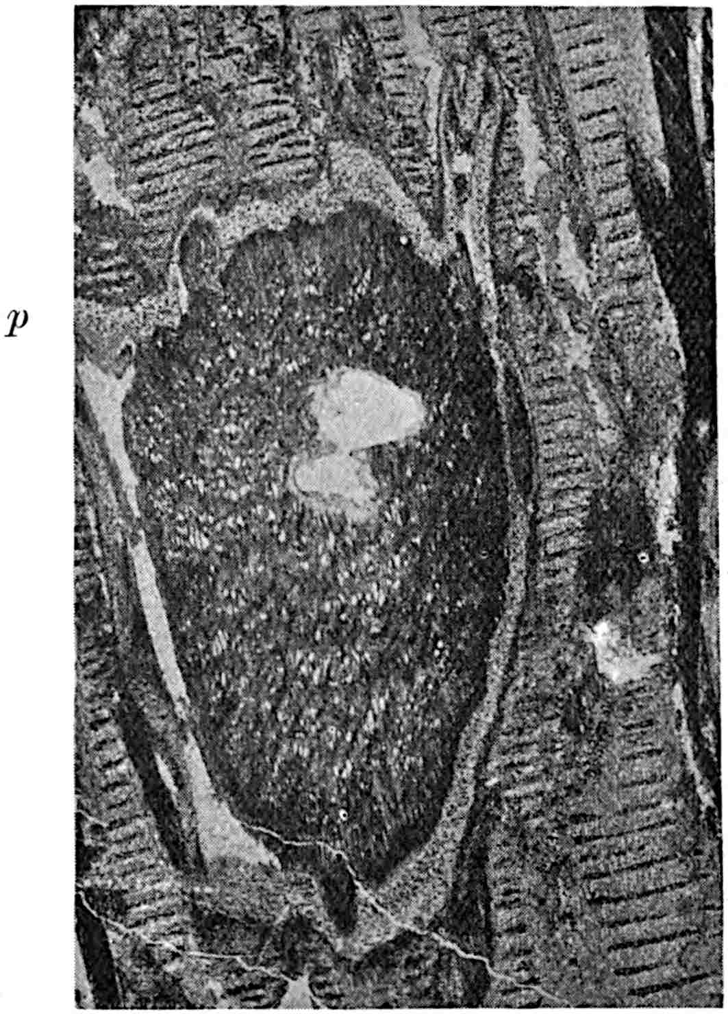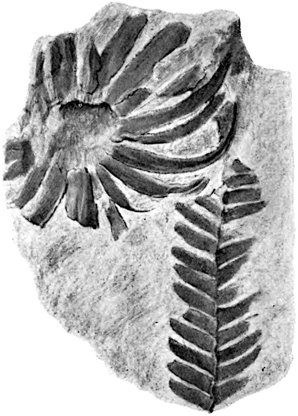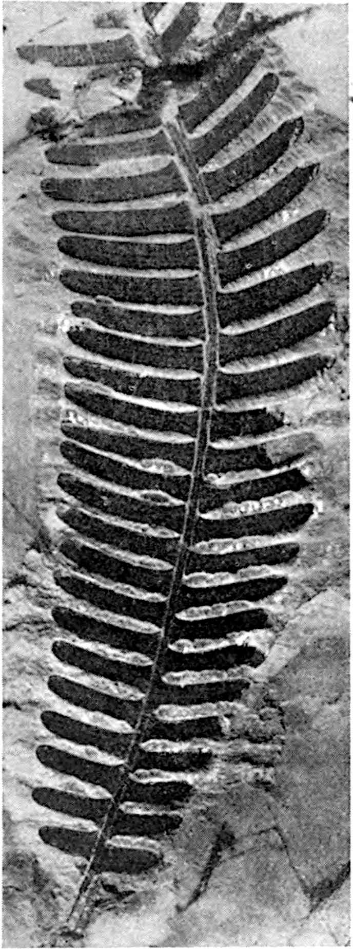 This species[1757], from the Lower Permian of the Autun district, is founded on a pinnate frond bearing alternate pinnae, 2·5 × 1 cm., with an asymmetrical oblong lamina attached obliquely near 588the edge of the rachis with a cuneate base slightly decurrent below and a broadly rounded apex; the veins dichotomise once or twice as they diverge from the narrow base (fig. 628). The pinnae resemble the leaflets of Noeggerathia foliosa Sternb. and are similar in shape to those of the Jurassic species Sphenozamites Geylerianus Zig.