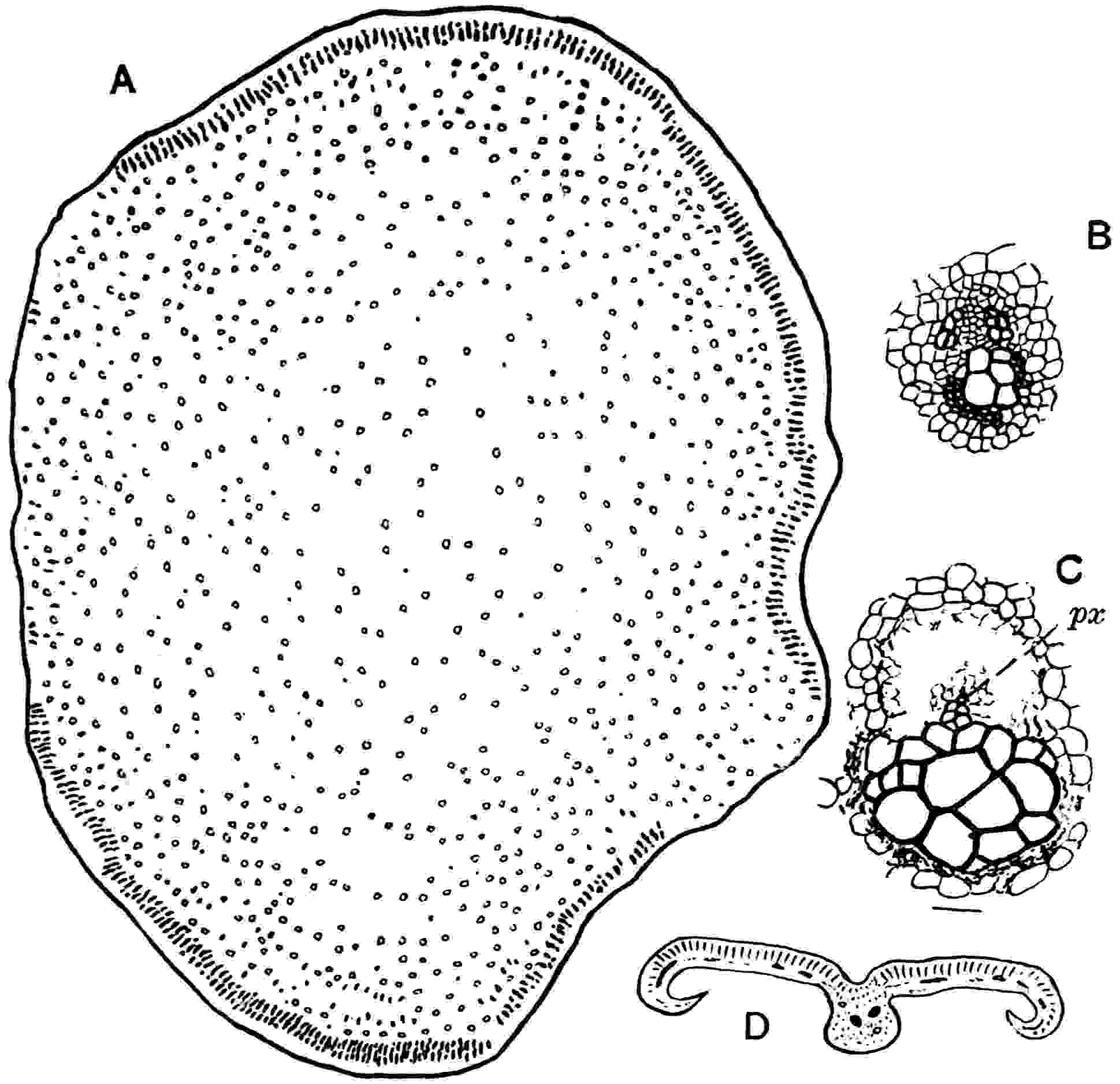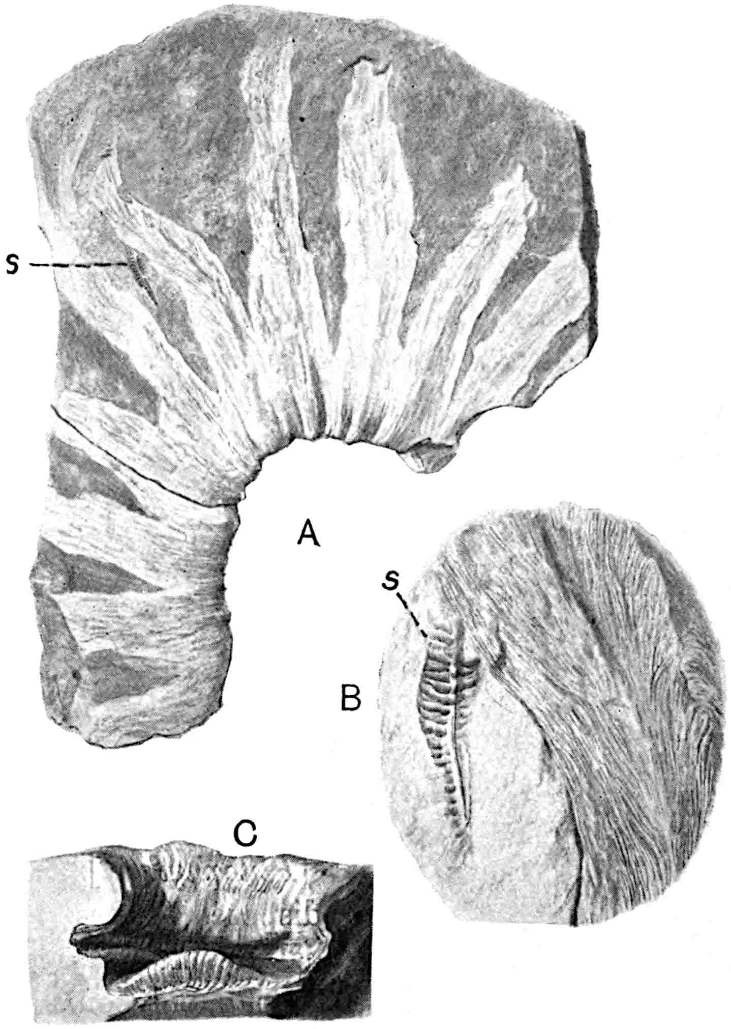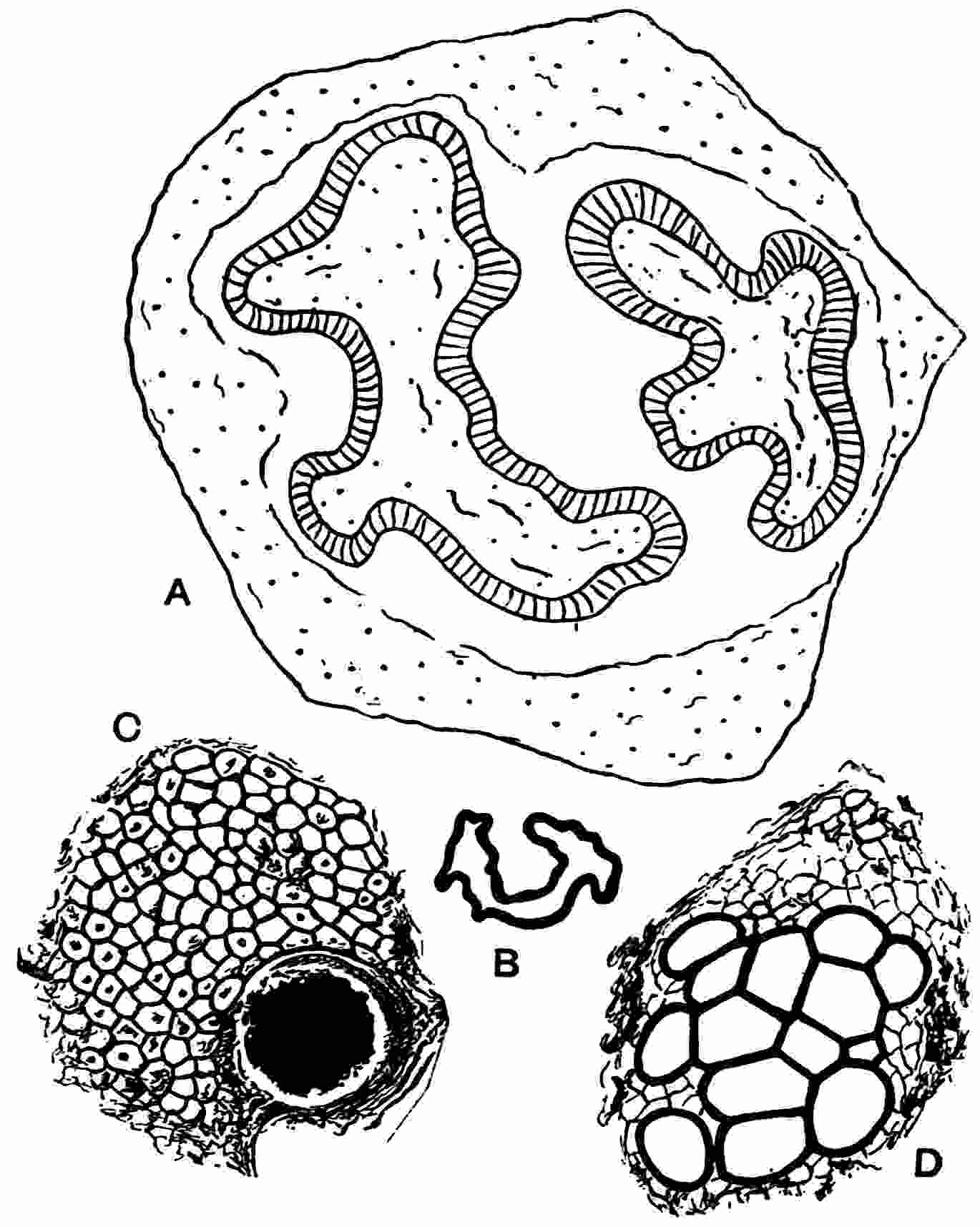 This species[1672] (fig. 619, C, D), one of those from Höör on which the genus was founded, has been very fully investigated by Nathorst[1673] whose researches have cleared up many obscure features. The young fronds are circinate like those of Ferns and Cycas. The linear fronds agree generally in habit with those of N. polymorpha and N. compta, but the lamina is thicker and is characterised by regular transverse corrugations; the veins are very rarely visible except in young leaves which have not reached their full thickness. The fronds may be 50 cm. long and vary in breadth from 1·5 to 12 cm.; the petiole is very short or the frond may be 572sessile. Between the regular grooves on the upper surface the lamina is more or less convex; seen from below the grooves are represented by ridges and between each pair of ridges there are parallel folds, sometimes three (fig. 620, B) or as many as six; and where the segments are narrow, that is the strips of lamina between two grooves (or ridges), there may be only a single fold which gives the appearance of linear segments with a single midrib as in Cycadites, a misleading resemblance of special interest in reference to the Nilssonia fronds described by Oldham and Morris[1674] and by Feistmantel[1675] as Cycadites rajmahalensis. Owing to the fleshy nature of the leaf the difference between the upper and lower side is particularly well marked in this species. The lamina may be more or less entire, but is usually divided by deep sinuses extending to the rachis into truncate or distally tapered segments varying in breadth (fig. 619, C, D), the narrow segments being characterised by a more pointed apex than in N. polymorpha. The structure of the stomata and epidermal cells is of the type described in the definition of the genus. Strongly cuticularised papillae, incorrectly described by Schenk[1676] in N. polymorpha as stomata, occur on some of the epidermal cells: these may be the bases of hairs. In some preparations Nathorst found patches of a resinous substance, an interesting discovery in view of the occurrence of secretory canals in the petrified leaf of Nilssonia orientalis described by Dr Stopes[1677].