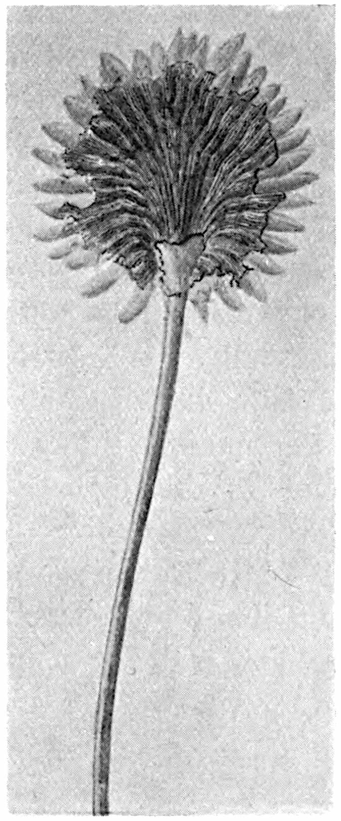 This generic name was instituted[1567] for pinnate fronds from the Rajmahal series of India, assigned by Feistmantel to a Lower Jurassic horizon, but probably nearer in age to the Middle Jurassic series. Morris, joint author with Oldham of the Memoir on the Rajmahal plants, adopted the name Dictyopteris. Dictyozamites agrees very closely with Otozamites but is readily distinguished by the anastomosing veins (fig. 609), while the absence of a midrib differentiates it from the Palaeozoic genus Dictyopteris. The genus is recorded also from Jurassic strata in England, Bornholm, Japan[1568], Korea[1569], and from a locality 60 nautical miles N.W. of Cape Horn in Tierra del Fuego[1570]: the specimens from these localities differ only in unimportant details from the Indian type. Dictyozamites is confined to Jurassic floras and appears to be especially characteristic of Middle Jurassic floras. In India[1571] fronds occur in close association with stems of the Bucklandia type and, although there is no proof of any connexion with stems or flowers, it is probable that the fronds of this generic type were borne on stems similar to those of Bucklandia and that the flowers were constructed on the Williamsonia plan.