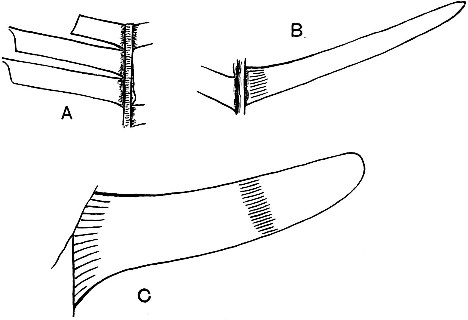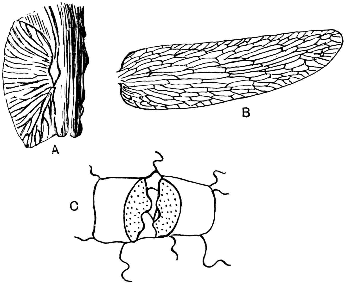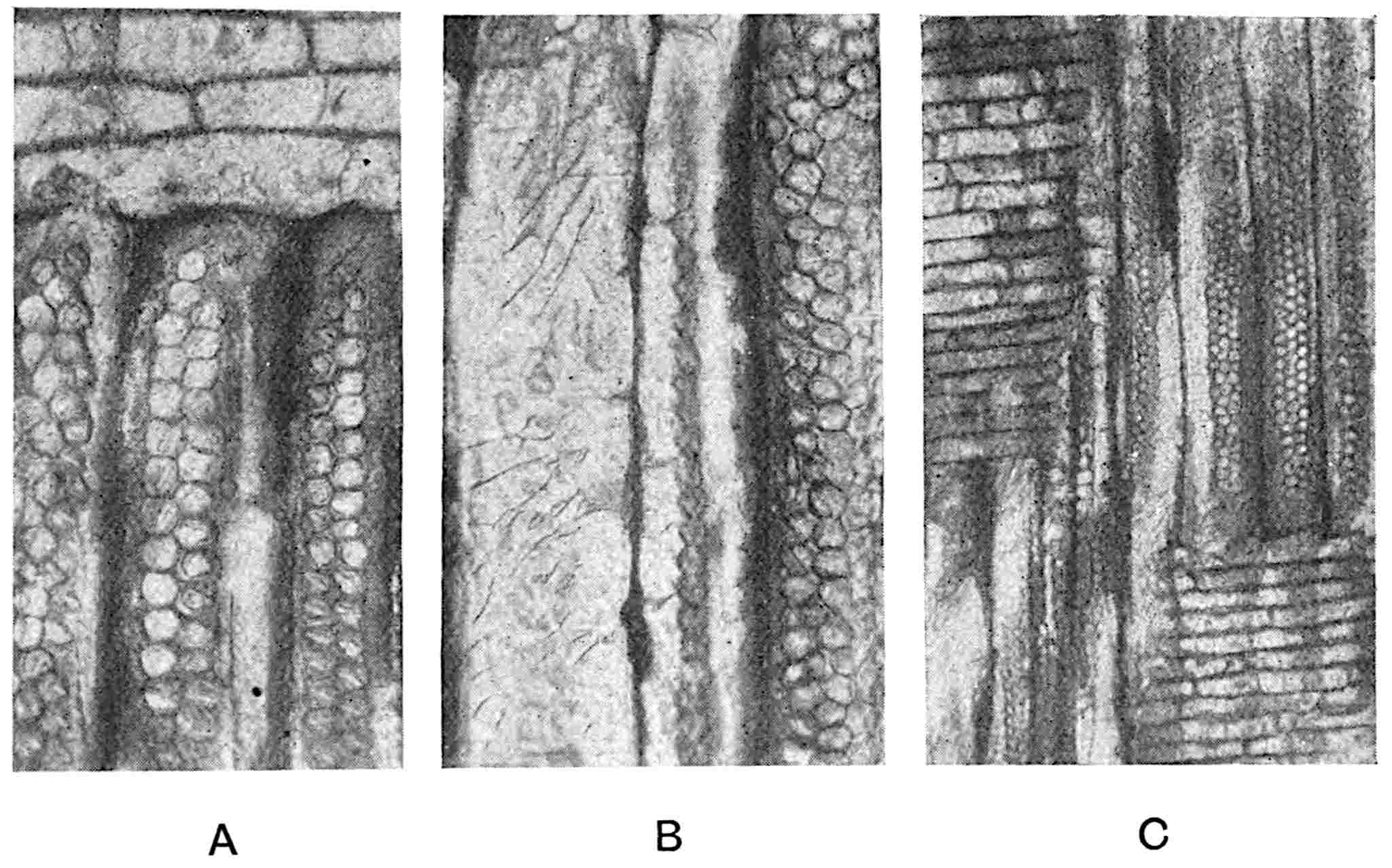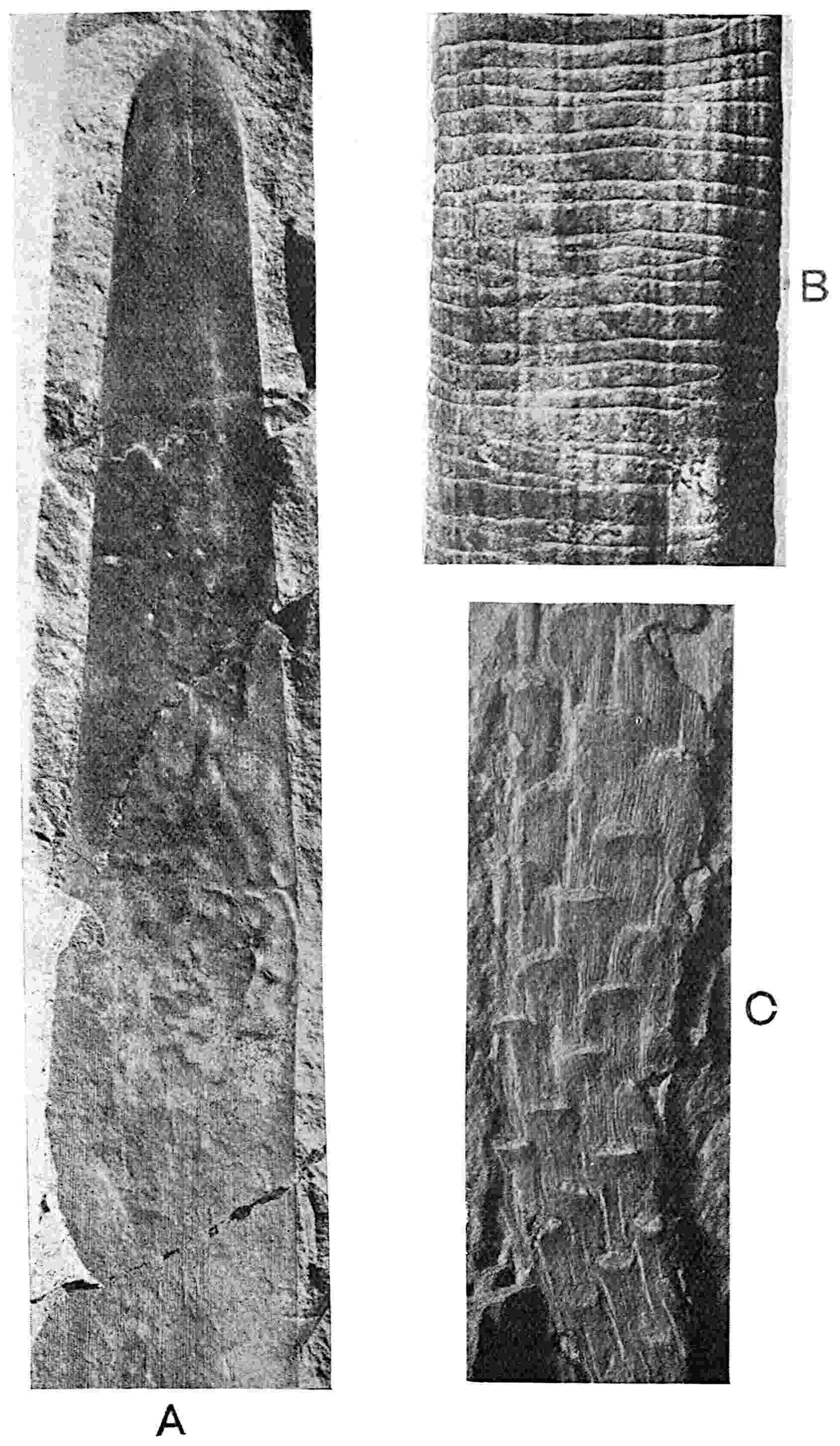 This Middle Jurassic type from Marske[1578], Yorkshire, differs from D. falcatus in the relatively broader segments, their straighter form (fig. 609, B), and in the attachment to the rachis being slightly below the middle of the pinna base. Fig. 609, A, shows the base of a pinna and an oval scar similar to those on the rachis of some recent Cycads (cf. fig. 387). The epidermis is like that in D. Johnstrupi and as in that species the stomata are confined to 548the lower surface. There are approximately 120 stomata per square millimetre; each with two subsidiary cells (fig. 609, C) of elongated form, and the guard-cells have small thickened outgrowths or papillae as in D. Johnstrupi.