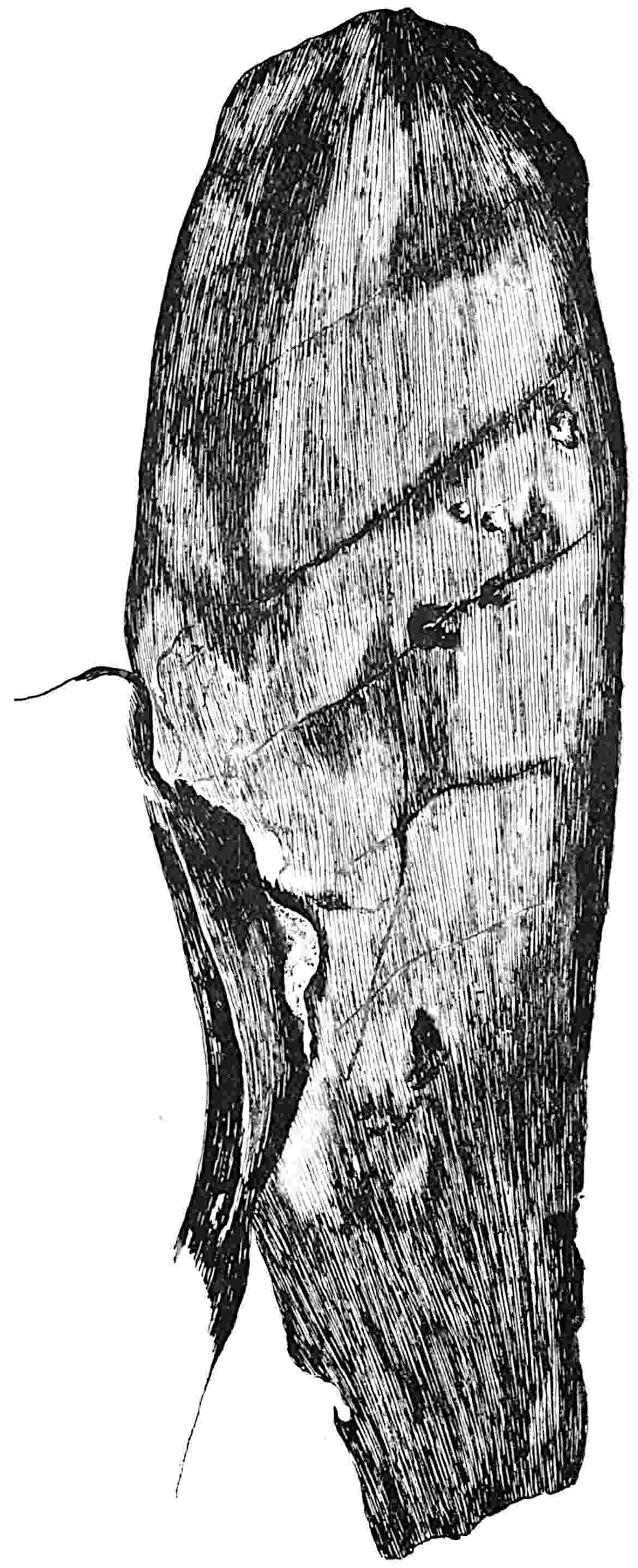This Middle Jurassic species from Stonesfield[1758] is founded on detached pinnae possibly identical with a specimen figured by Buckman as ?Naiadea obtusa[1759]. The pinnae are wedge-shaped, tapering gradually to an acute apex and attached by a narrow base: the leaflet shown in fig. 629 is 9 cm. long; the veins are numerous and more divergent than in some leaves of similar form referred to the genus Podozamites. With this species may be compared several Italian Jurassic specimens described by Zigno[1760] as four distinct species but more appropriately assigned to a single type S. Geylerianus. An examination of Zigno’s fronds in the Padua Museum, which he named S. Rossii, leads 589me to regard the irregularly serrate edge of the pinnae as the result of tearing of an originally entire lamina and to compare the specimens with Otozamites Beani (L. and H.). An imperfect ovoid pinna recalling S. Belli is figured by Newberry from the Rhaetic of Honduras as Sphenozamites robustus[1761]. A French Upper Jurassic species figured by Saporta as Sphenozamites latifolius bears a very close resemblance in the form of the leaflets to the Wealden plant Sewardia latifolia[1762]. Kurtz records the occurrence of Sphenozamites, S. Geinitzianus, from Rhaetic strata in Argentina[1763], but I have not seen any figures of this species.