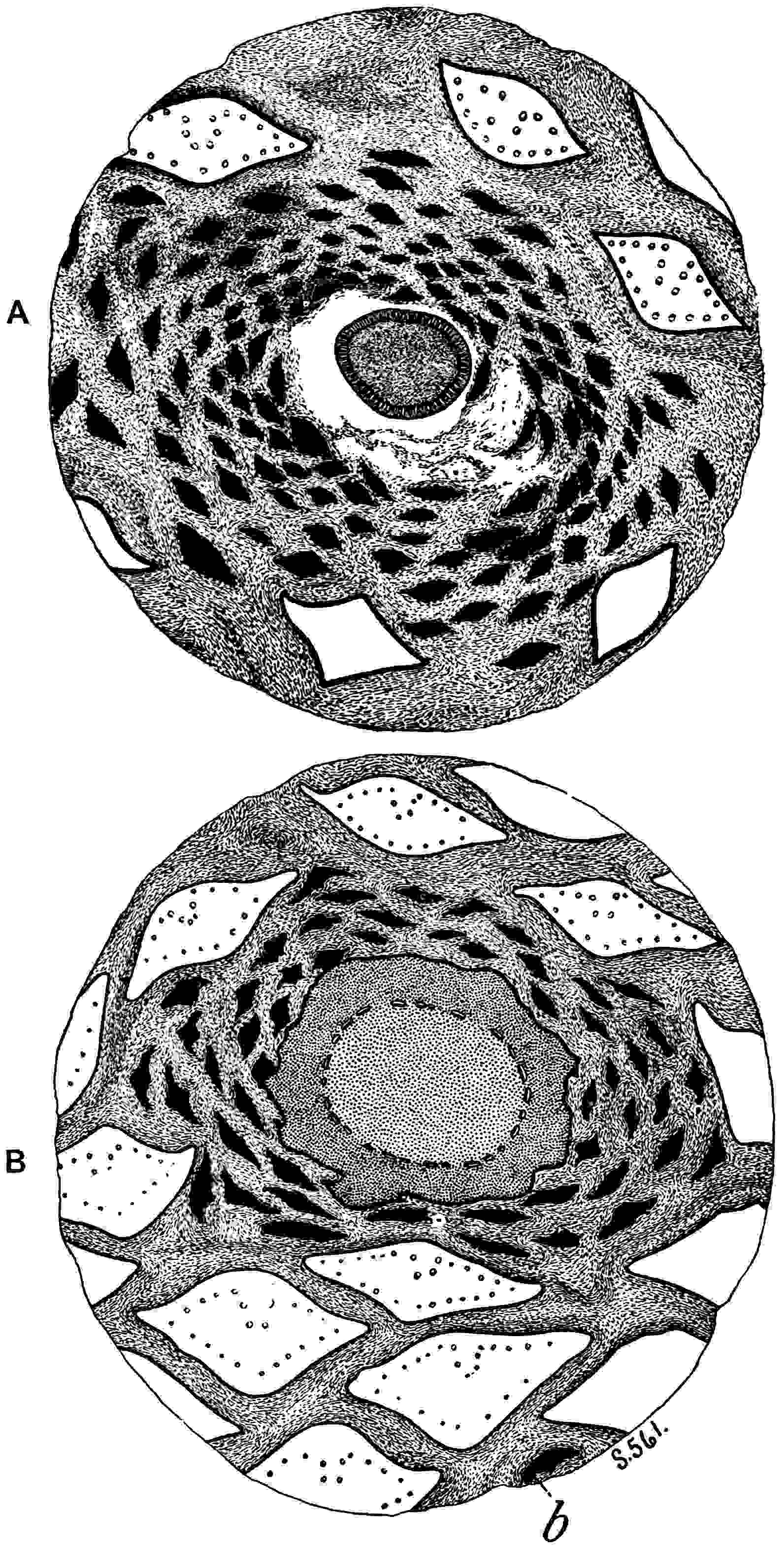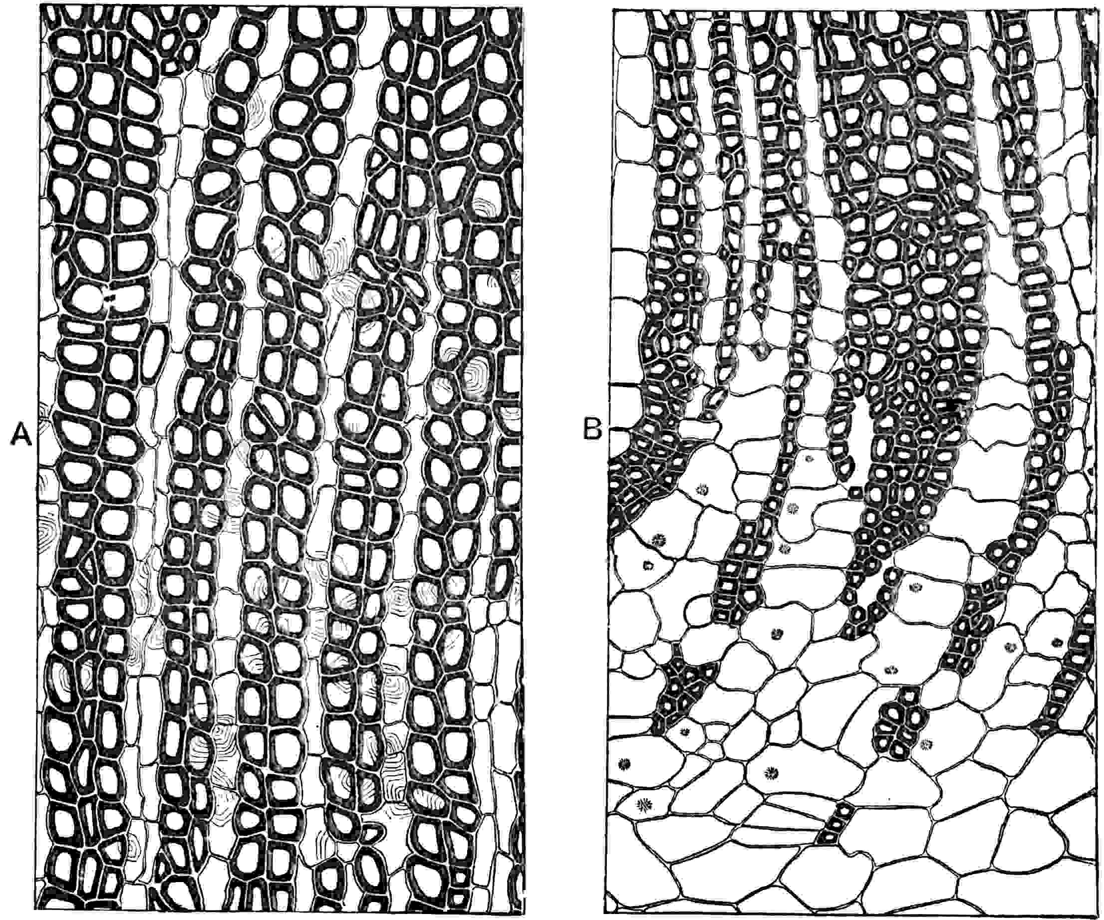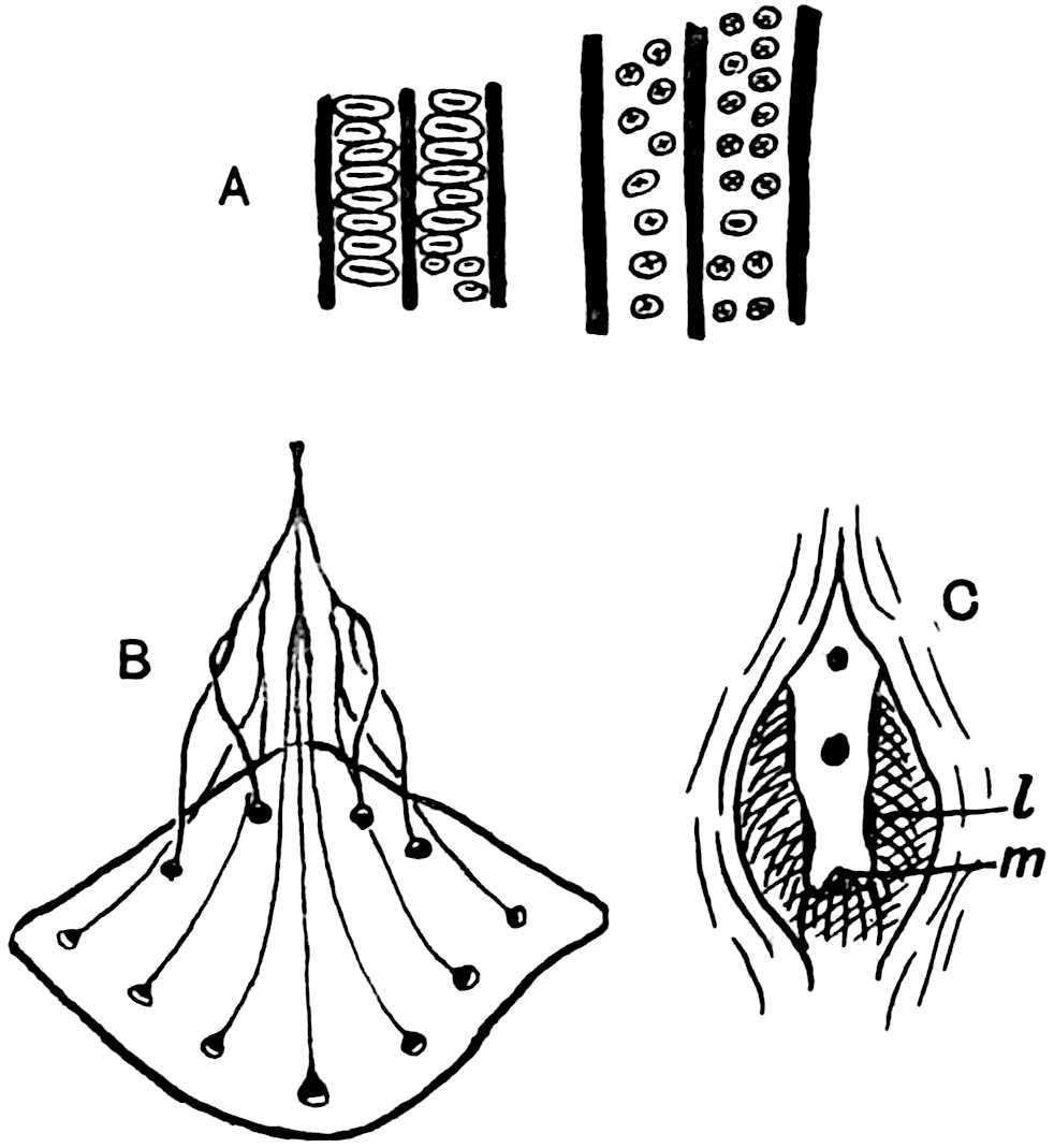 There is no satisfactory evidence as to the nature of the reproductive organs or stems of the plants which bore fronds of the type represented by P. Jaegeri (fig. 610) and other forms with equal segments. A stem referred by Heer[1587] and by Leuthardt[1588] to Pterophyllum was not found in connexion with leaves, and there is the same absence of any convincing evidence in the case of the imperfect specimens from the Keuper of Basel believed by Leuthardt to be male and female inflorescences. On the other hand leaves of Anomozamites are known to have been borne on comparatively slender stems with dichasial branching, and the reproductive shoots are of the same general type as those known as Bennettites. This discovery is due to Nathorst who founded the genus Wielandiella[1589] on fertile stems with Anomozamites fronds. Mr Thomas[1590] has recently obtained evidence from Yorkshire Jurassic material pointing to a similar connexion between Anomozamites fronds and Wielandiella stems. Pterophyllum is further distinguished from Nilssonia by the folded walls of the epidermal cells and by the presence of two crescentic subsidiary cells (fig. 611, A) instead of the ring of cells which surrounds the guard-cells in Nilssonia (fig. 611, B). Schenk[1591] figured a few pieces of cuticle from fronds referred to Pterophyllum in which the walls are more or less sinuous, but the cells of Pterophyllum crassinerve Goepp.[1592] appear to have straight walls: this 551species is, however, probably a Nilssonia. The stoma represented in fig. 611, A, is from the lower epidermis of Pterophyllum (Anomozamites) Nilssoni (Phill.)[1593].