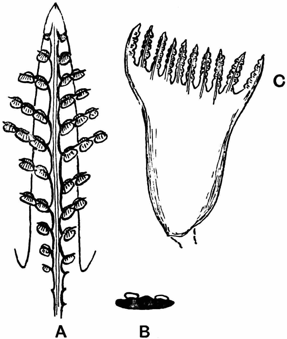 The fronds of this Cenomanian species from the West of Greenland reach a breadth of 16 cm.; the rachis, 1 cm. broad, has two 563parallel ridges on the upper surface and to these are attached at a wide angle the broad bases of narrow linear pinnae reaching a length of 9 cm. and a breadth of 2–3 mm. (fig. 617). The pinnae are thick and separate and each has a double ‘midrib’ consisting of two parallel lines (fig. 617, B) which are occasionally replaced by one. The so-called double ‘midrib’ represents the two prominent ridges bordering the groove. The stomata, confined to the median groove, are approximately circular and the short epidermal cells have sinuous walls[1648].