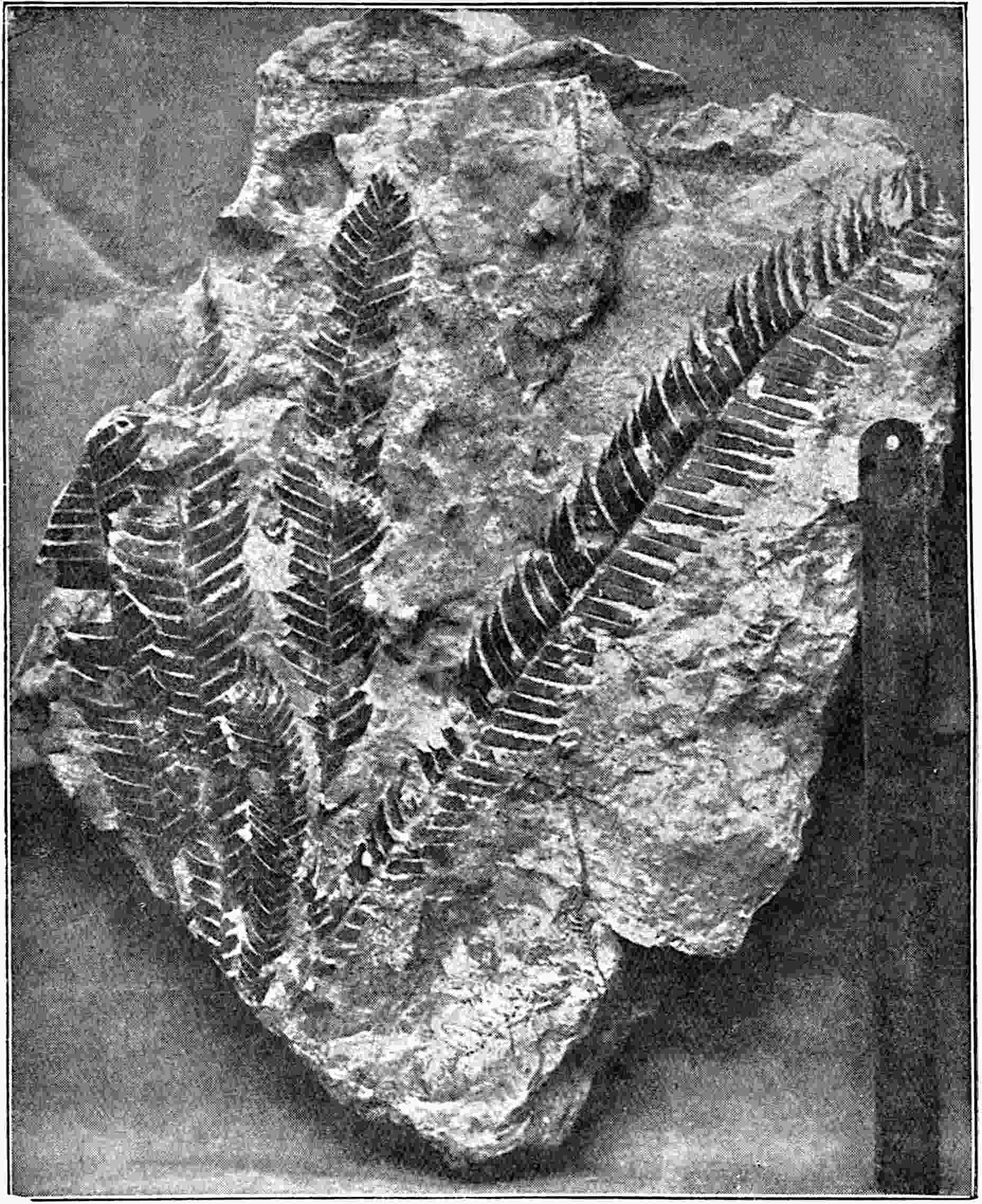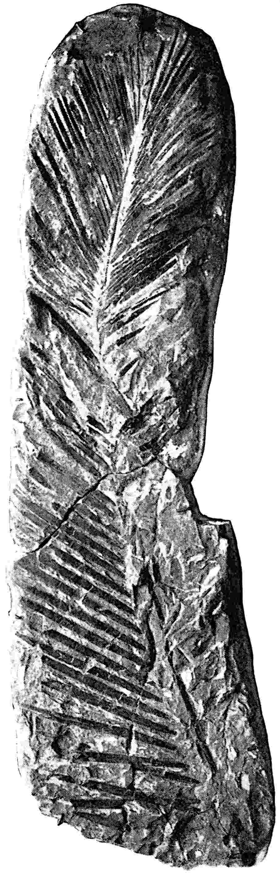This Rhaetic species from Tonkin[1616] and Persia[1617] is interesting as affording an example of a frond with exceptionally narrow and contiguous pinnae. The frond is narrow and lanceolate, 15–20 cm. long with pinnae normal to the rachis, ·5–1 mm. broad and 7–25 mm. long attached by the whole base which is sometimes slightly enlarged. The veins are simple or forked, ·15–·25 mm. apart: the apices of the segments are rounded or truncate and the form of the whole is similar to that of Pterophyllum aequale but narrower.