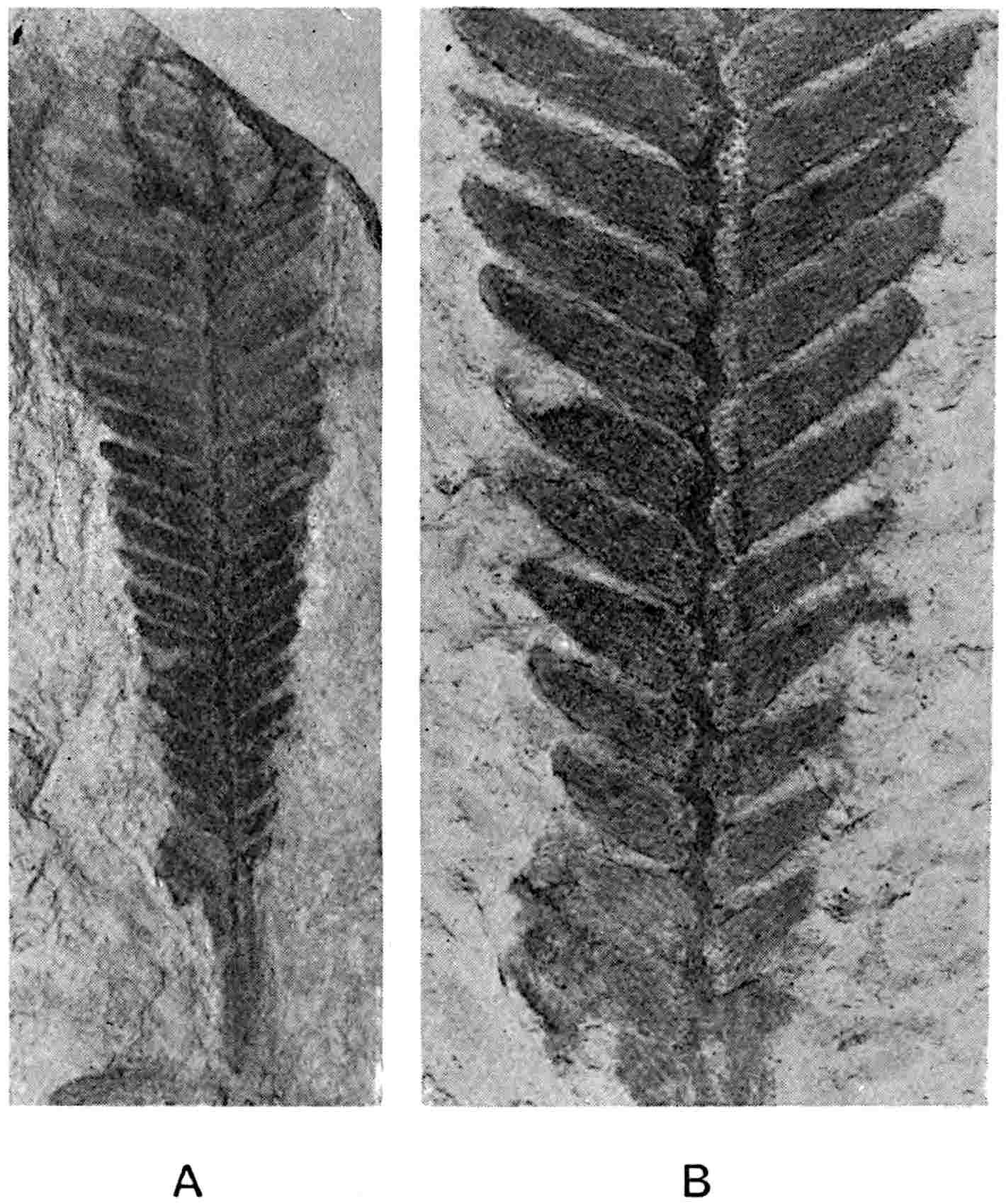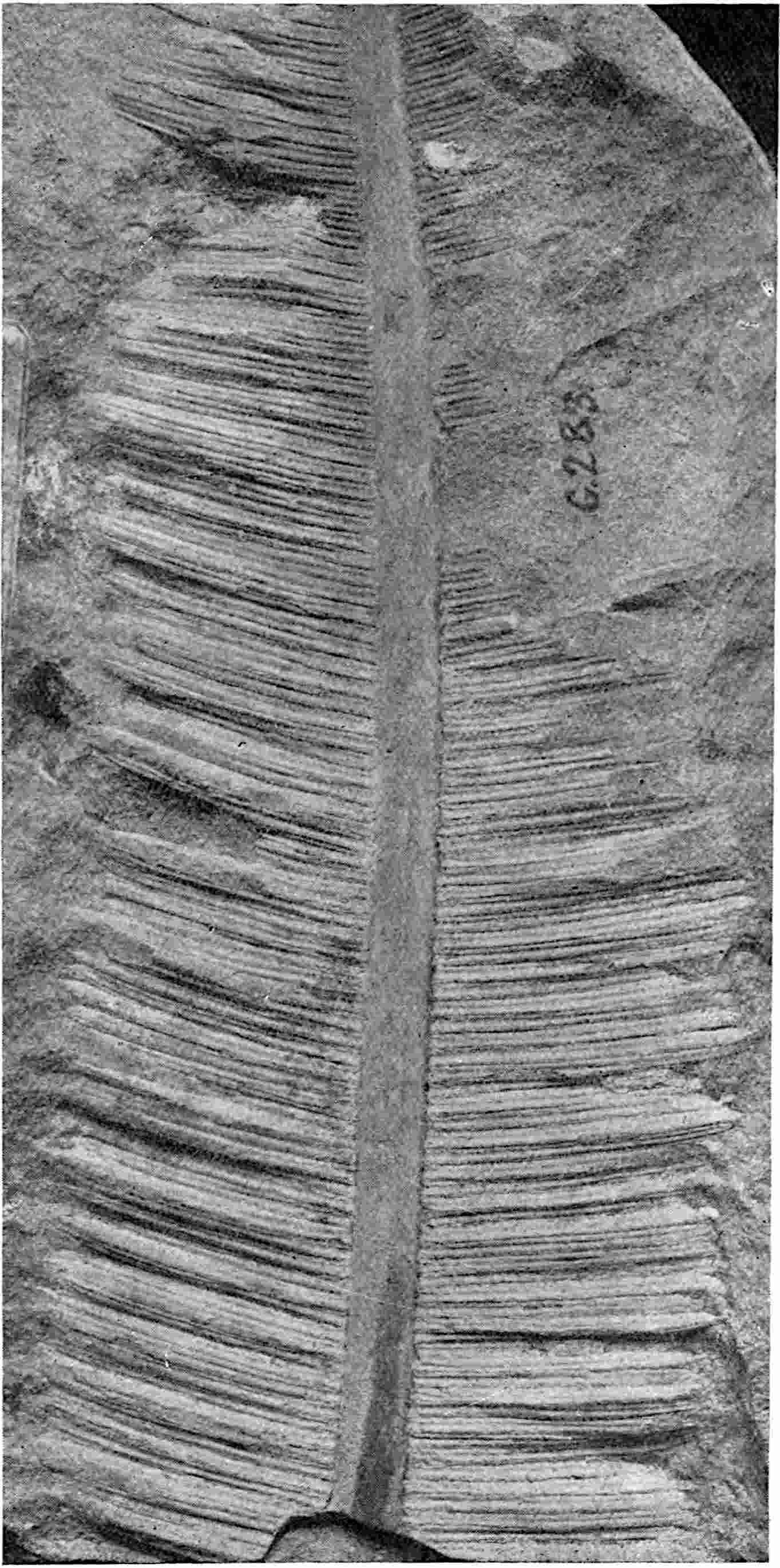 This species was founded by Zeiller[1656] on fronds from the Rhaetic of Tonkin reaching a length of 40 cm. and 2–8·5 cm. broad with a rachis 3–4 mm. wide bearing contiguous linear pinnae 1·5–4·5 cm. long and 1·5–3 mm. broad with a more or less contracted base and a rounded or obtusely pointed apex. The pinnae are attached almost at right-angles or at an angle of 60°–80°. There is a clearly defined midrib.
