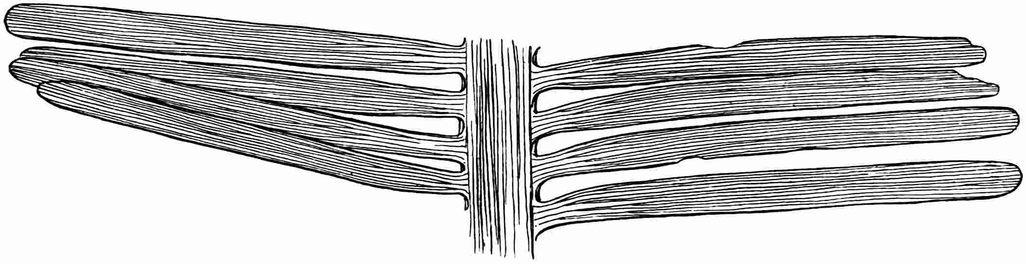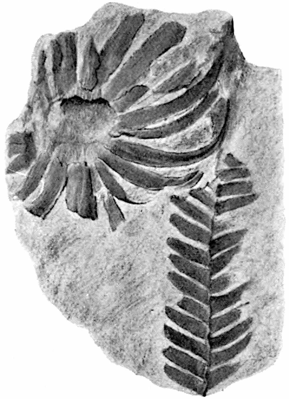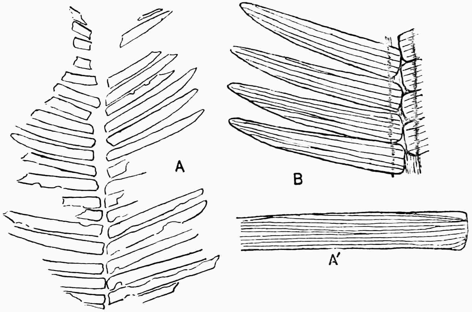 This species[1595] was founded on a large frond from the Commentry coalfield with a stout rachis bearing linear pinnae, attached along a narrow groove on its outer edge, reaching a length of 12 cm. and a breadth of 1 cm.; adjacent pinnae are united at the base. The apices are pointed and there are 10–12 unbranched veins in the lamina. Fig. 612 shows a small piece of the large specimen in the Natural History Museum, Paris.