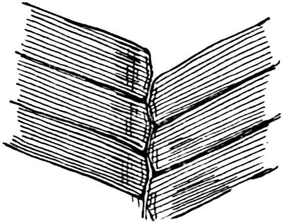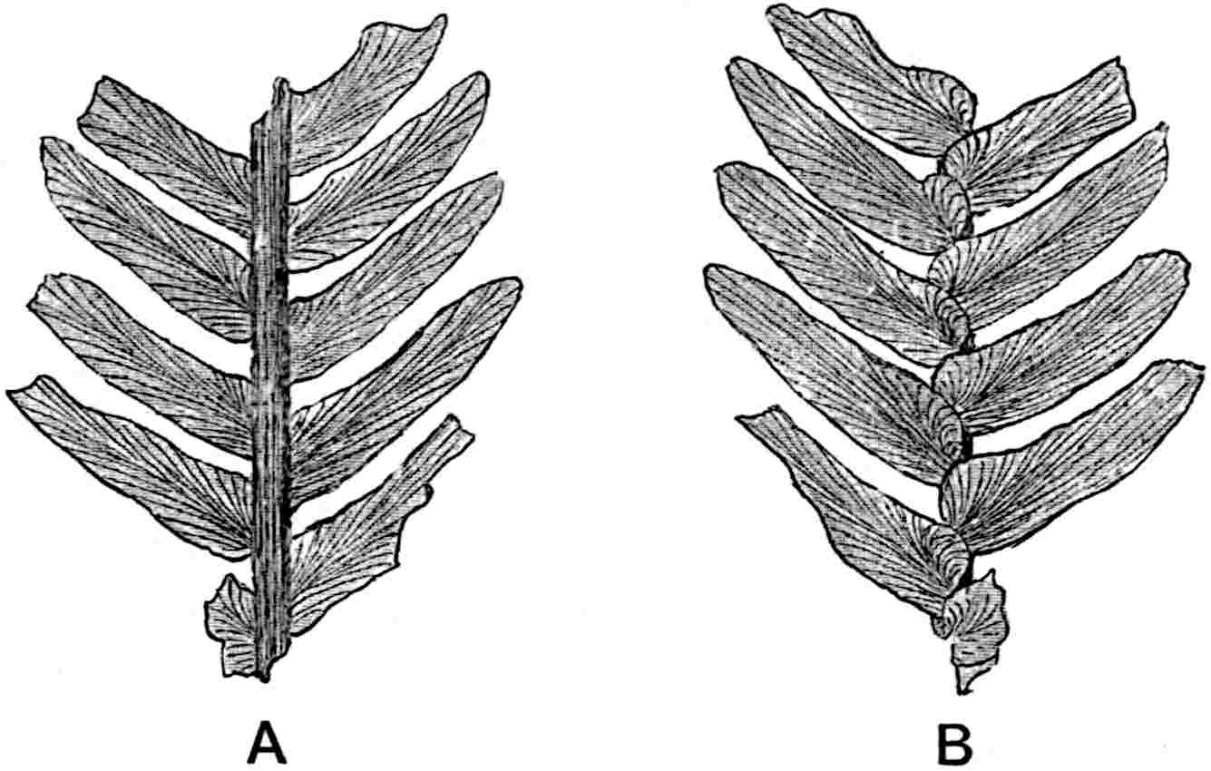 Fronds pinnate; pinnae linear, attached by the whole base, which may be enlarged; the apex is truncate, rounded, or occasionally pointed; the veins are simple or dichotomously branched and parallel to the edge of the lamina. In some fronds (sub-genus Anomozamites) the segments are unequal (fig. 615), short, broad 550and truncate, and the lamina may be entire or divided into a few very unequal segments. The surface of the rachis is never completely covered by the lamina on the upper face of the frond and is often characterised by transverse wrinklings, possibly due to the presence of ramental scales.