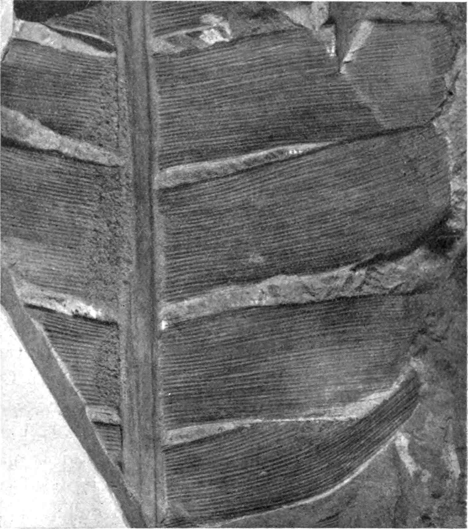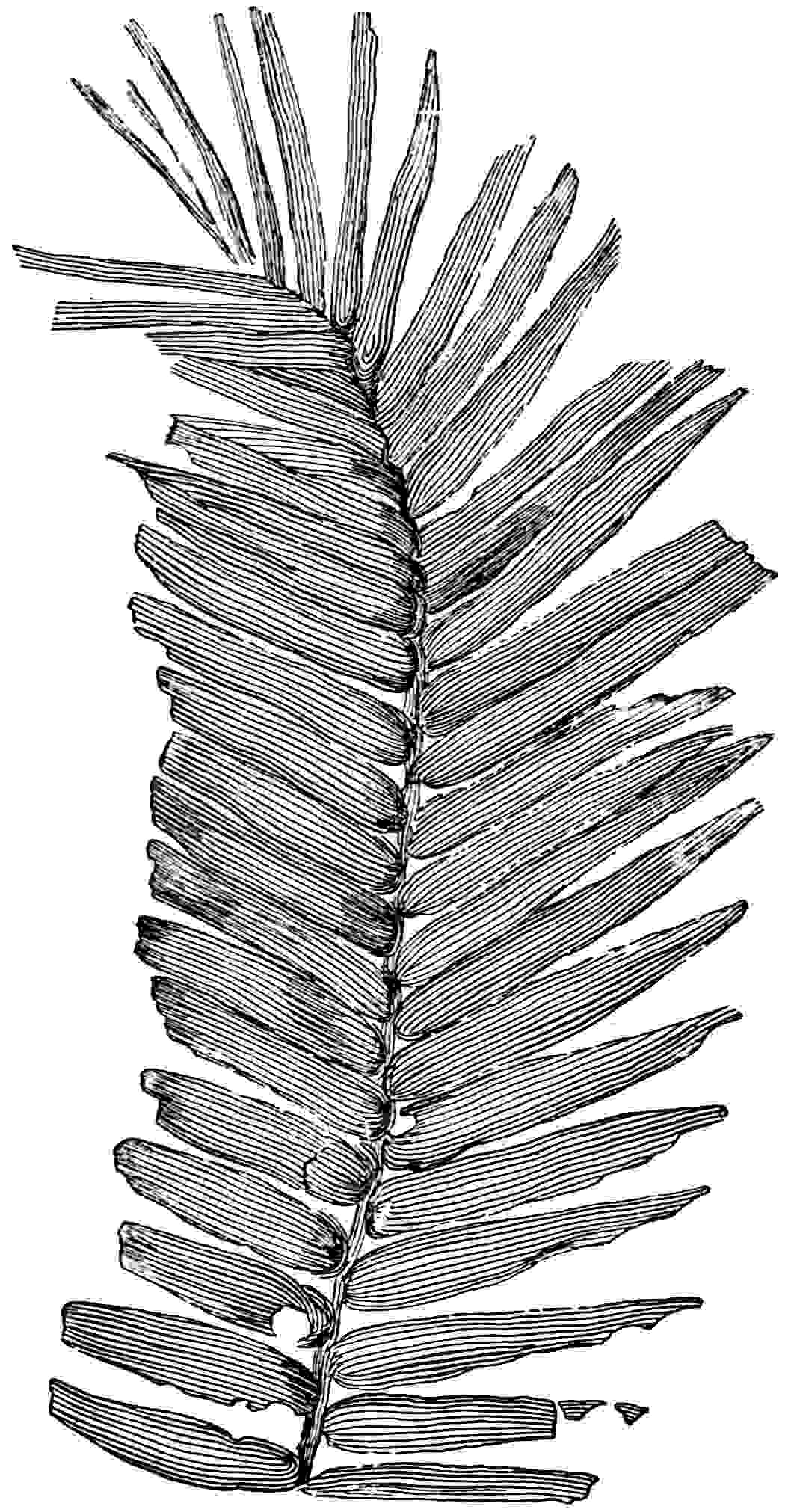 This type[1730] is more familiar under the name Ctenis falcata given to it by Lindley[1731], but if we follow Lester Ward[1732] in strict observance of the rule of priority, a course from which I have frequently deviated on the ground of long usage, the less familiar designation must be adopted. Fronds pinnate; long and tapered linear pinnae sometimes exceeding 12 cm. in length and 1 cm. in breadth attached obliquely or almost at right-angles to a fairly broad rachis (fig. 626). The lamina is broadest at the base and the lower margin is strongly decurrent, tapering distally to an acute apex. The parallel and frequently anastomosing veins diverge slightly in the basal region of the pinnae. Though usually separate to the base, the laminae of adjacent pinnae may be continuous as in a pinnatisect leaf[1733]. This species is recorded also from North America, and fronds of similar habit are figured by Fontaine[1734] from the Jurassic of Oregon as Ctenis orovillensis: a fragment recorded from Jurassic rocks in Afghanistan as Ctenis sp. may belong to C. sulcicaulis[1735].