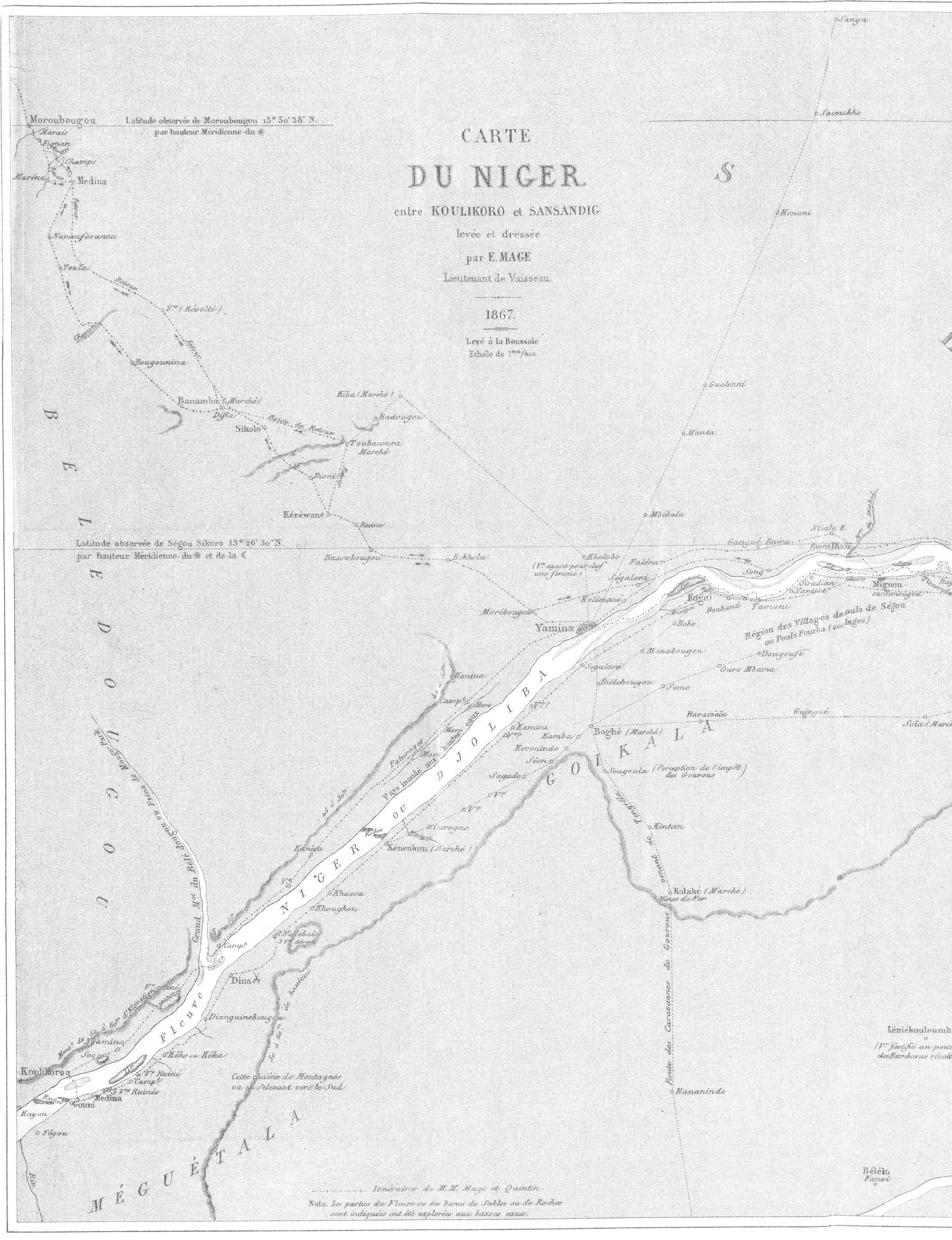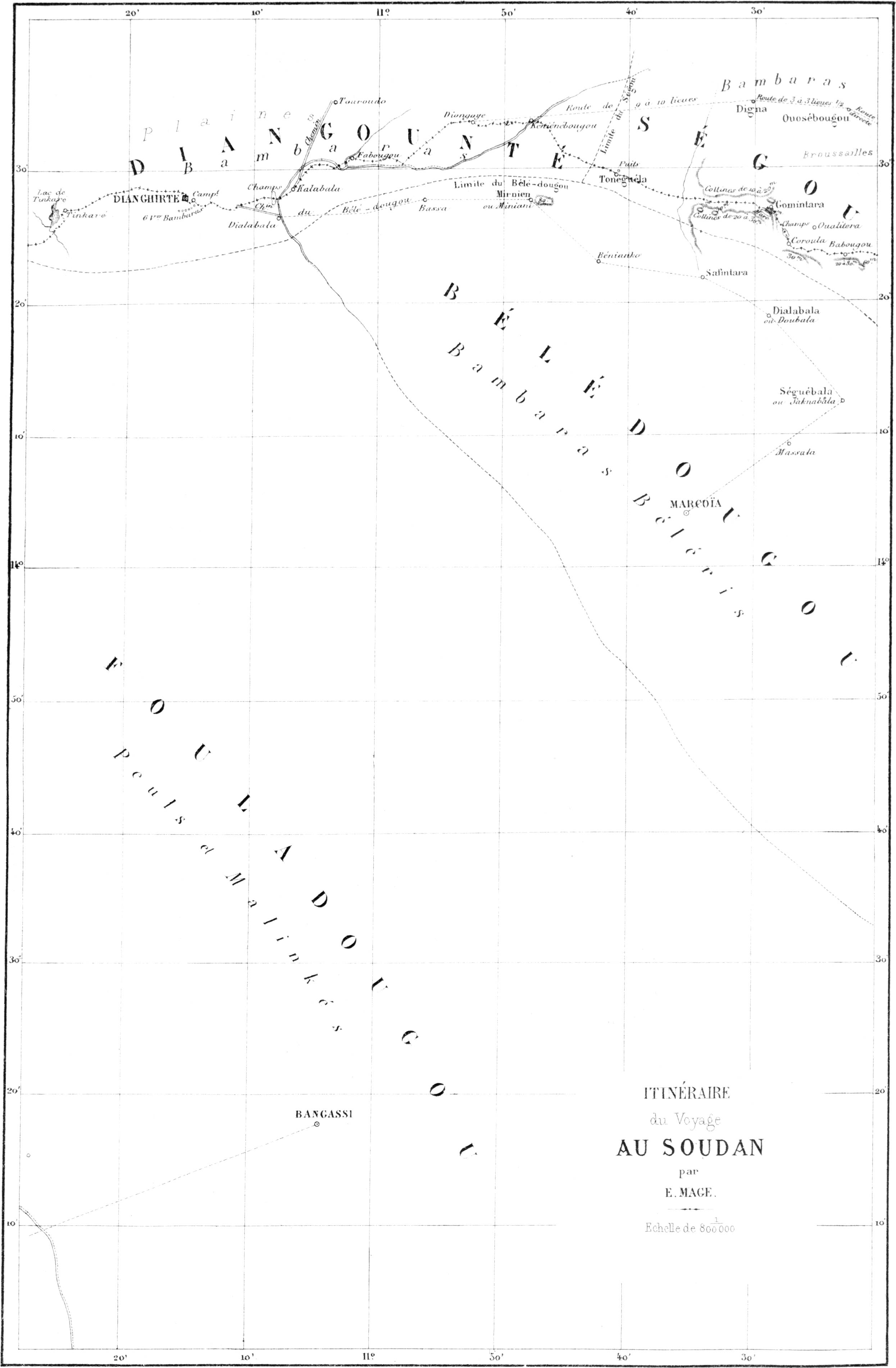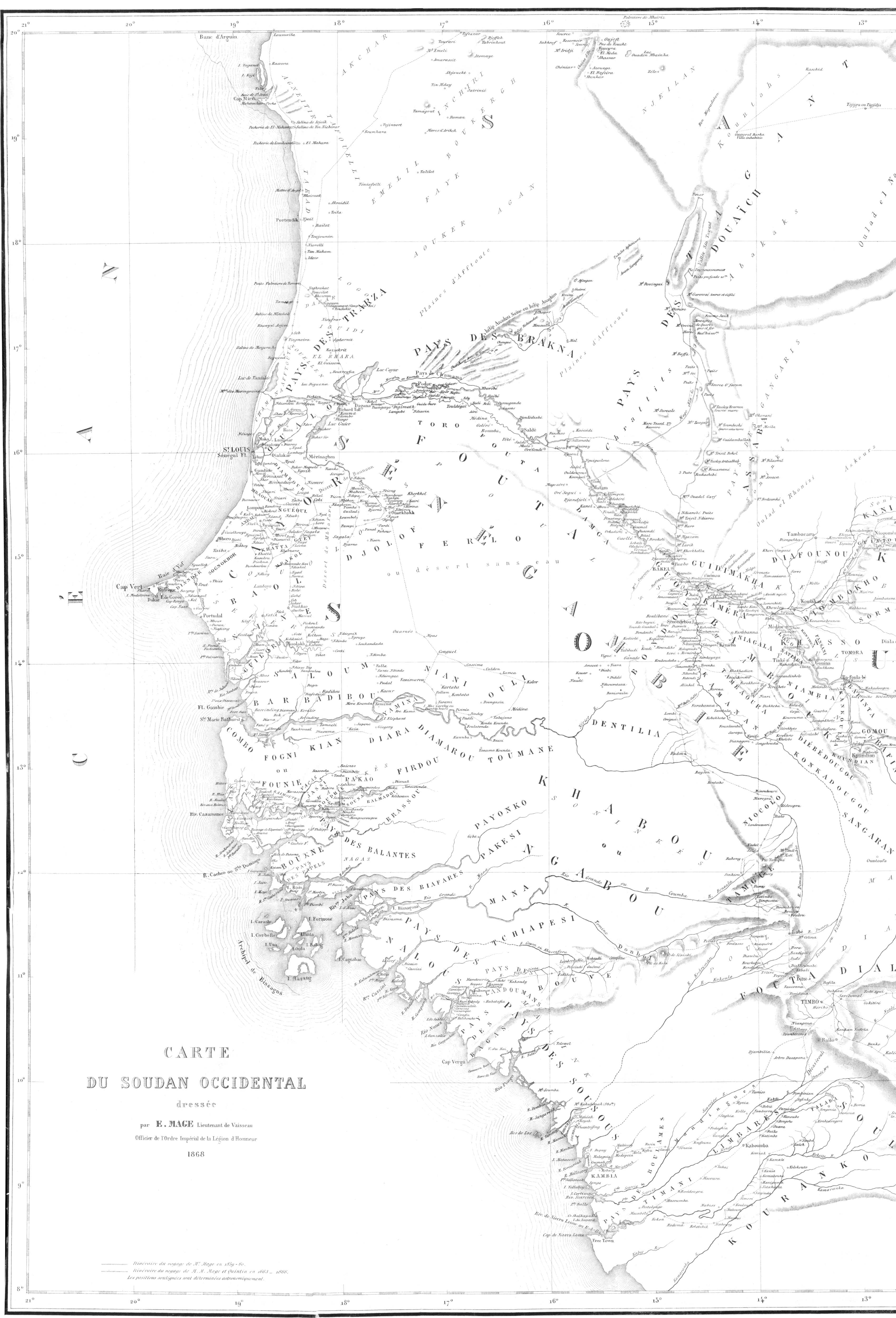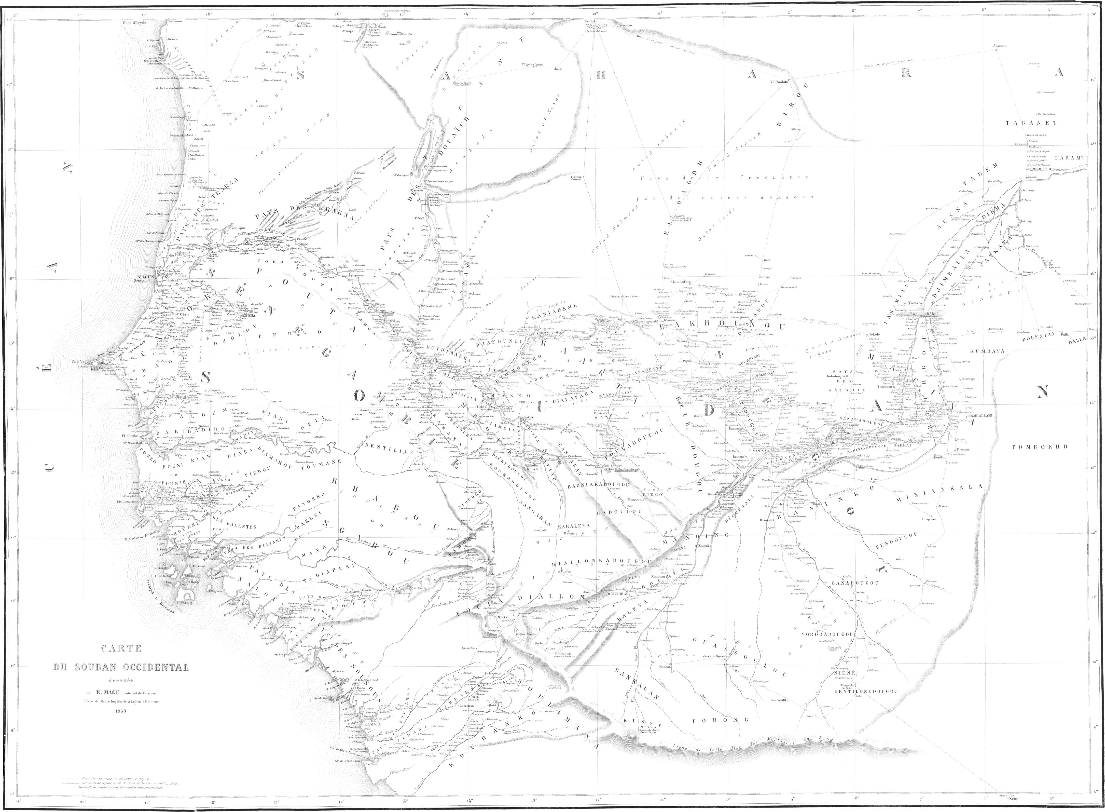 Le 10 juillet nous étions à Gorée, le 12 à Saint-Louis, et je fus tout de suite détaché à terre pour faire les études nécessaires à l’entreprise d’un tel voyage. J’avais déjà servi cinq ans au Sénégal et deux ans dans la station navale du littoral. Il était peu de points de la côte que je ne connusse. Un séjour de neuf mois au milieu des noirs du Haut-Fleuve à Makhana[3], et un pénible voyage d’exploration à l’oasis de Tagant, chez les maures Douaïch, m’avaient préparé. Je connaissais le caractère des noirs et des Maures, la manière de se conduire avec eux ; mais bien que possédant suffisamment l’histoire des voyages en Afrique, il me fallait relire Raffenel, Caillé, Mongo Park et même Barth, quoiqu’il ne parle pas des mêmes régions.