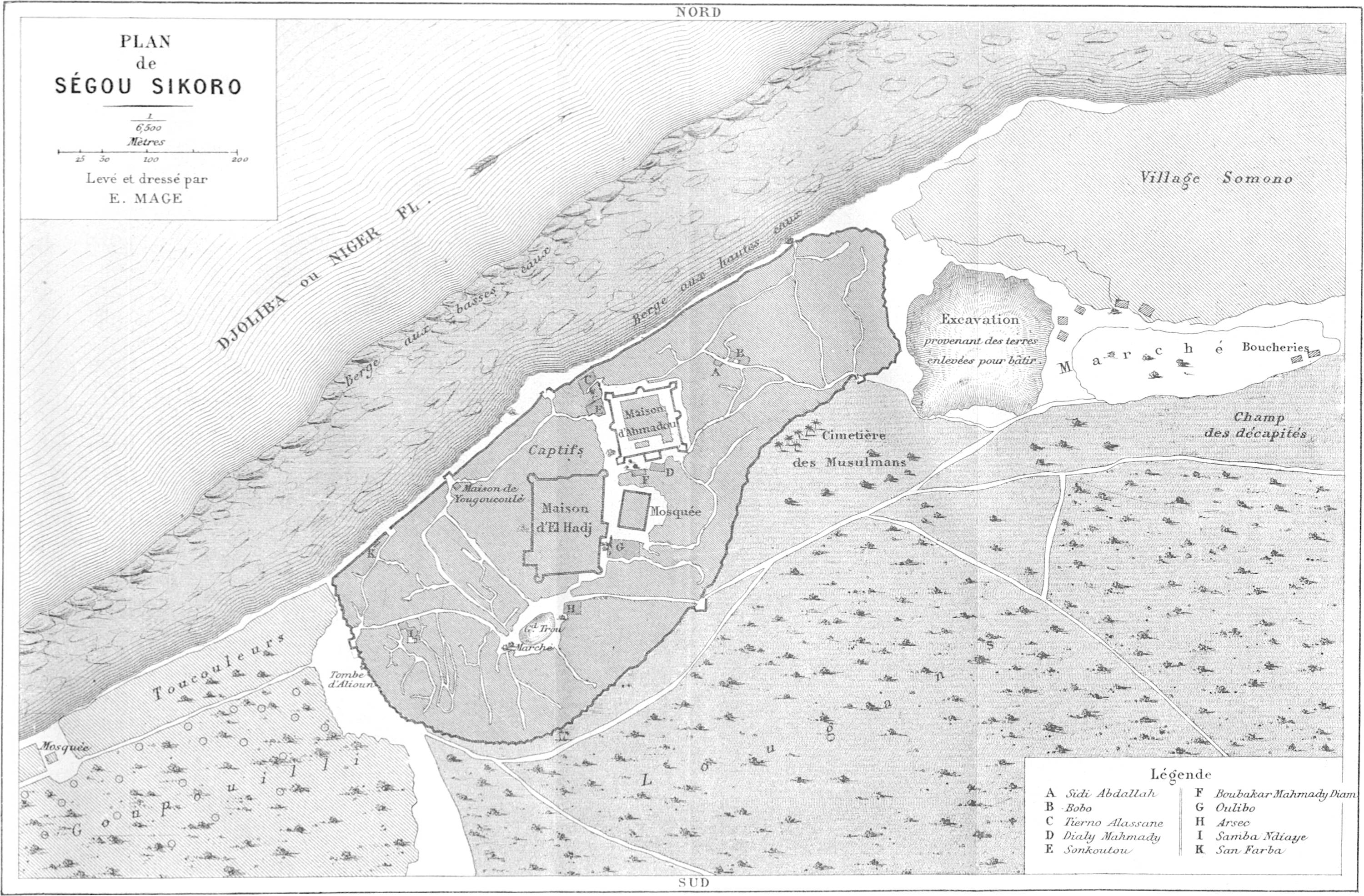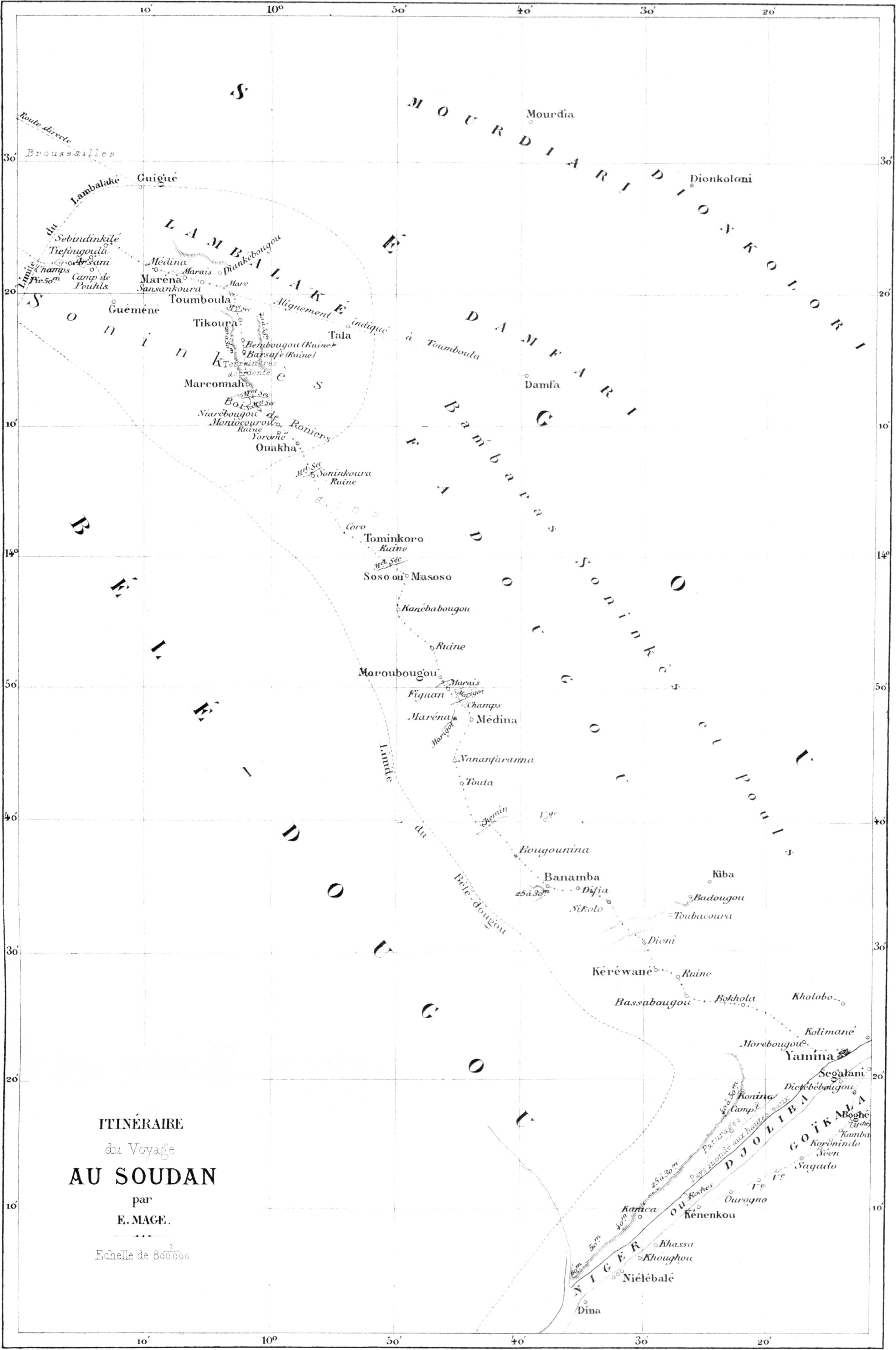 « Un petit-fils d’Ahmadou Labbo, fondateur du Macina, réfugié chez les Mouchis, a repris le pouvoir après la bataille de Goundam, à Hamdou Allahi. Cette ville, d’après notre informateur, serait dix fois plus grande que Tombouctou. Il donne cependant à cette dernière ville de trente à quarante mille habitants, près du double de l’évaluation de Barth. Les deux obusiers de 0m,12, abandonnés faute d’affûts par le commandant de Bakel, dans une expédition du Bondou, en 1857, avaient été ramassés par les gens d’El Hadj Omar, et celui-ci les traînait avec lui dans toutes ses guerres. Ils auraient été pris par l’armée d’Ahmed el Beckay, à la bataille qui s’est livrée sous Tombouctou, et ils seraient aujourd’hui dans cette ville. Tombouctou possède huit autres pièces d’artillerie, trois en bronze et cinq en fer, qui proviennent de Kagho, ancienne capitale, à une centaine de lieues en aval de Tombouctou. Elles avaient été amenées à Kagho par l’armée marocaine du pacha Djoddar, vers la fin du seizième siècle. Nous avons fait prononcer le nom des aborigènes de la contrée où sont les villes de Tombouctou, Kagho et Djénné, par Sidi Mohammed, pour être bien fixés sur ce nom, écrit de tant de manières par les voyageurs. Il prononce Sonkhey, la première voyelle nasale comme notre article possessif son ; quant à la consonne qui suit, bien que Sidi Mohammed prononce kh, il écrit ق, Qof. Barth a écrit ce nom Sonrhaï. Les vocabulaires de cette langue ont été donnés par Caillé, sous le nom de Kissour, par Raffenel, sous le nom d’Arama et par Barth.