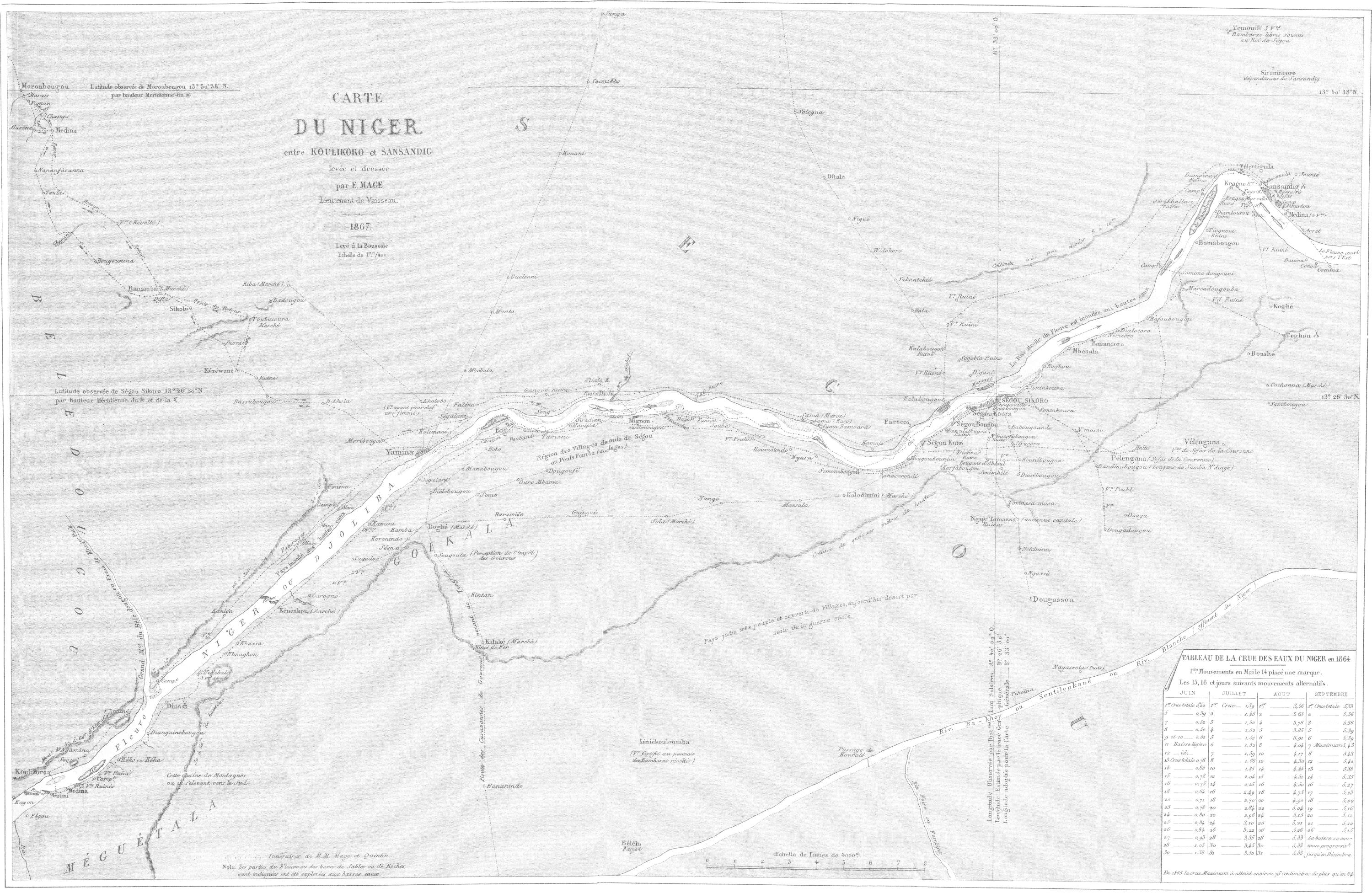 Tels étaient les premiers mots d’un projet d’exploration du Niger que je soumettais au ministre de la marine et des colonies au mois de février 1863. Je voyais là une grande et belle mission, un avenir sérieux, de véritables services à rendre à mon pays, et ces considérations me décidaient à braver les périls qui s’attachent toujours à ces sortes de missions, à imposer à ma famille et à moi-même les tourments d’une longue absence, les inquiétudes d’un silence forcé, et à ma jeune femme la dure épreuve d’une première séparation qui pouvait être éternelle.