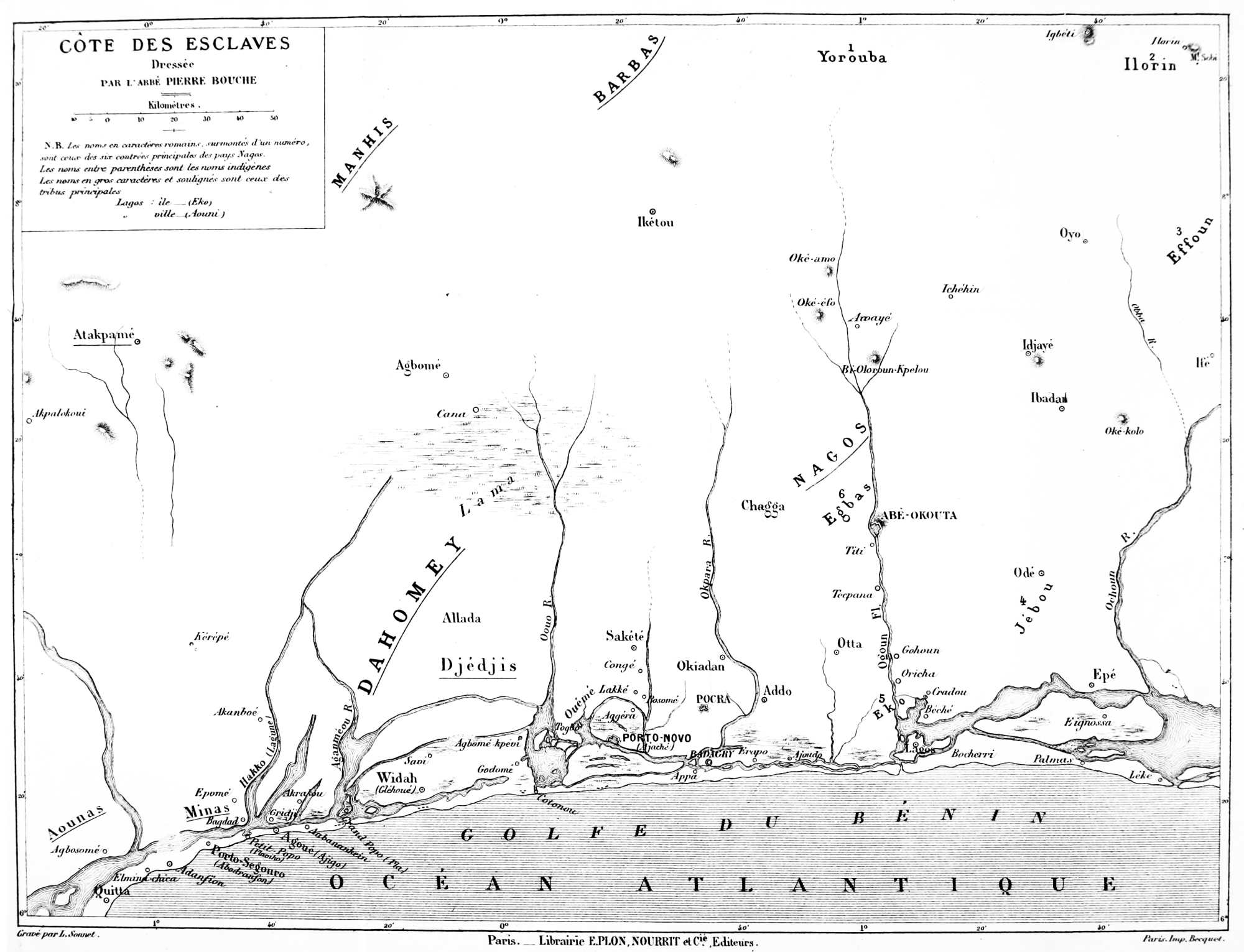 N. B. Les noms en caractères romains, surmontés d’un numéro, sont ceux des six contrées principales des pays Nagos. Les noms entre parenthèses sont les noms indigènes. Les noms en gros caractères et soulignés sont ceux des tribus principales.