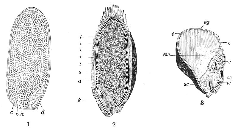 415. Disappearance of the gametophyte.—The seed is a comparatively recent development in plant evolution. It has no counterpart anywhere among the cryptogams, but is strictly characteristic of the three great orders of Spermophytes: Monocotyl, Dicotyl, and Gymnosperms, which compose the greater part of the vegetation of the globe. Structurally, it is a matured sporangium containing a rudimentary sporophyte (the embryo), and a reduced gametophyte (the embryo sac), which, under the form of endosperm, has dwindled to an insignificance that makes it difficult to recognize it as a phase in an alternation of generations.