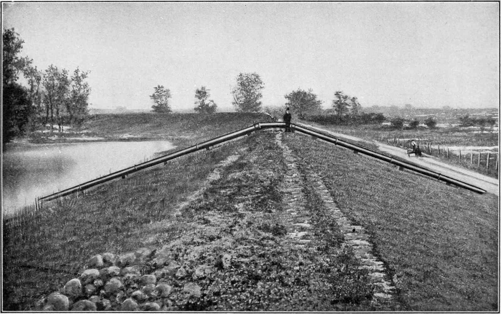 Plate 2.—Carrying water over the Mississippi levee by siphon to irrigate rice fields. (From Circular of La. Exp. Station.)
