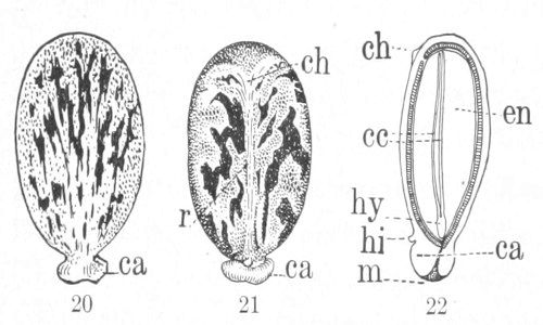 8. How food substances get into the cells.—As there are no openings in the cell walls, the only way substances can get into a cell or out of it is by soaking through the inclosing membrane, as will be explained in a later chapter. Since starch, oil, and proteins, the most important foods stored in seeds, are none of them soluble in the cell sap, it is clear that they could not have got into the cells in their present state, but must have undergone some change by which they were rendered capable of passing through the cell wall.