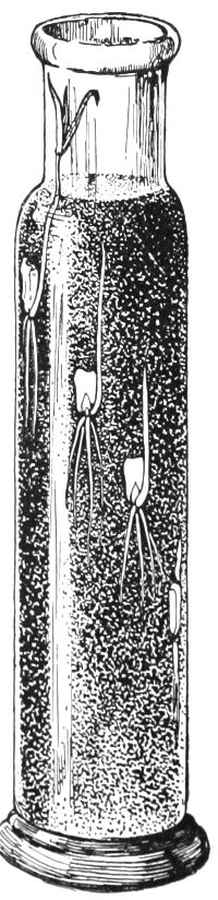 Experiment 10. Do seeds in their ordinary quiescent state contain any water?—Place a number of beans, or grains of corn or wheat in a glass bottle, making a small perforation in the cork to allow the air to escape, and heat gently. Does any moisture form on the glass?