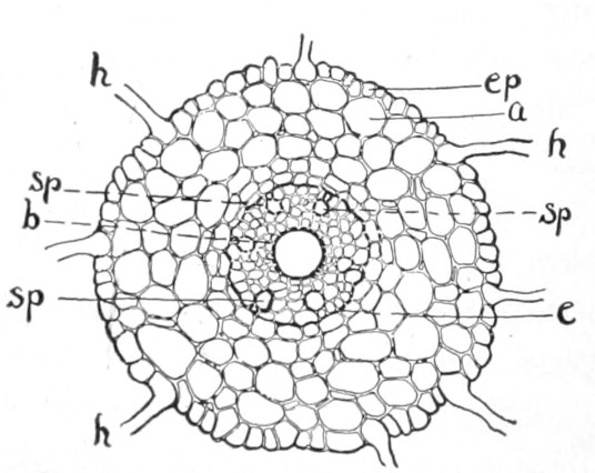 The theory of their comparatively recent origin from an aquatic ancestor is further borne out by the many points of similarity between their internal structure and that of hydrophytes (318), and also by the great proportion of aquatic plants among them, amounting to thirty-three per cent, while in dicotyls the proportion is only four per cent. Can you give any reasons, from your examination of their internal structure (113, 114), for believing that the line of development which they have followed is a less effective one for meeting conditions now existing on the globe than that attained by dicotyls?