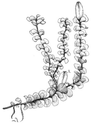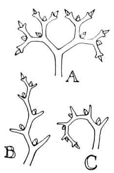 417. Plant genealogy.—It has been shown by a study of existing forms of plant life that there is no hard and fast line of division anywhere between the different groups, but that they are all connected by ties of kinship more or less defined, according to their distance from a common ancestral stock. The geological record points to the same conclusion, and our classification of them into families, orders, and species is merely a very imperfect genealogical table of their supposed pedigrees. This does not mean, however, that we can assert positively that such and such a species is derived from such or such another, but that both are descended from some common intermediate form more or less remote. While we have reason to believe that the flowering plants are derived through pteridophyte and bryophyte types from some of the green algæ, no direct connection has ever been traced between any particular kind of flowering plant and any particular kind of alga,—or between a liverwort and an alga, for that matter,—and probably never will be, because the intermediate forms die out, or pass on by variation into other lines of development. But while this is true, all the evidence we possess does go to show that, since the beginning of life on the globe, there has been a general progressive evolution from lower and simpler to higher and more complex forms.