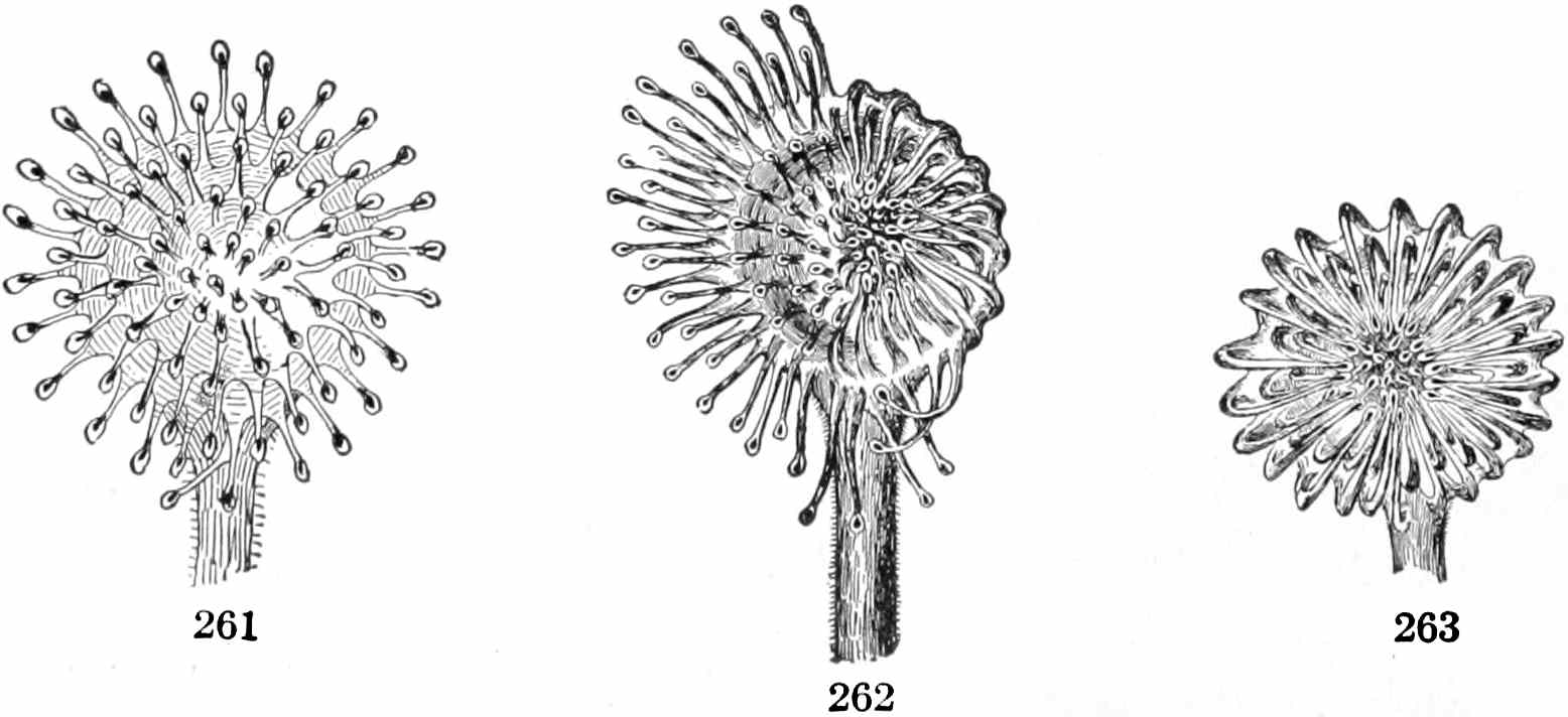 413. No break in the chain of life.—The great gap that was once supposed to exist between the cryptogams and phanerogams has been bridged over by the discovery of[Pg 355] analogies in the reproductive processes of the two groups that connect them together as successive links in one continuous chain of vegetable life. It is therefore very important to have a clear understanding of the nature and meaning of these processes, for the chief turning points in the life history of the different groups of plants are connected with them, their natural relationships to each other, and their distribution according to their respective places in the evolutionary scale, being determined largely by a comparison of their modes of continuing the life of the group.