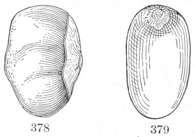 3. Food substances contained in seeds.—There are four principal classes of food stored in seeds: sugars, starches, oils, and proteins. The first are held in solution and can be detected, if in sufficient quantity, by the taste. The most important varieties of this group are cane and grape sugar, the latter occurring most abundantly in fruits, the former in roots and stems. Oil usually occurs in the form of globules. It is very abundant in some seeds, e.g. flax, castor bean, and Brazil nut. In the corn grain it is found in the part constituting the germ, or embryo (Figs. 6, 7). Starches and proteins occur in the form of small granules, which have specific shapes in different plants (Figs. 8, 9). Those containing proteins are called aleurone grains, and are, as a rule, smaller than the starch grains with which they are intermixed in the bean and some other seeds. In wheat, corn, rice, and most grains they form a layer just inside the husk, as shown in Fig. 10. This is the reason why polished rice and finely bolted flour are less nutritious than the darker kinds, from which this valuable food substance has not been removed. The two most familiar kinds of proteins are the albumins, of which the white of an egg is a well-known example, and the glutins, which give to the dough of wheat flour and oatmeal their peculiar gummy or “glutinous” structure.