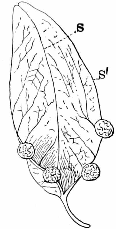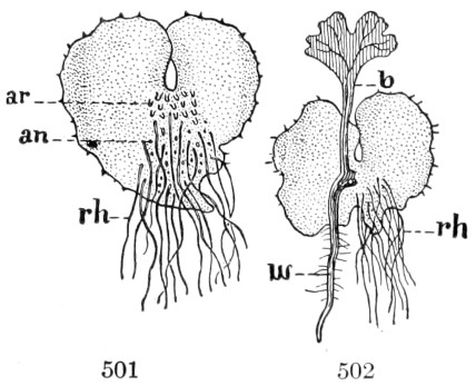 414. Alternation of generations in seed plants.—This process, so conspicuous among Bryophytes and Pteridophytes, and not unknown among Thallophytes, is universal among seed plants (Spermatophytes) also, though in so masked a form that it is not easy to recognize without a more detailed study than would be practicable within the limits of a book like this. Briefly, we may say that the stamens of spermatophytes, and the pistils, or rather the carpels, which we have seen to be transformed leaves (298), represent the sporophylls (406) of the higher pteridophytes. The pollen sacs and ovules are sporangia, bearing microspores and megaspores (409), represented respectively by the pollen grains in the anther and the embryo sac in the ovule. These go through a series of microscopic changes in the body of the ovule analogous to the production of the oöspore in the archegonia of ferns and liverworts, but the process is so obscure that to an ordinary observer the pollen grains and the ovule appear to be the real gametes, and were long supposed to be such. The fertilized germ cell in the embryo sac (251) corresponds to an oöspore; the embryo sac with the endosperm found in all seeds (previous to its absorption by the cotyledons) is a rudimentary gametophyte; and the embryo in the matured seed is the undeveloped sporophyte, destined, after germination and further growth, to produce a new generation with its recurrent cycle of alternating phases.