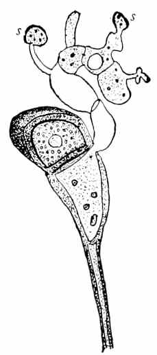 In the gymnosperms,—pines, yews, cycads, etc.,—which represent the most ancient and primitive type of existing seed-bearing plants, the similarity of these processes to those of certain of the pteridophytes is very striking, and it was through the study of these that the sequences of the process were traced in the much more obscure form in which they occur among the angiosperms. From the endosperm in the seeds of gymnosperms archegonia were found to be developed (Fig. 510) in much the same way as in Selaginella, from the prothallium, thus showing the endosperm to be a modified and greatly reduced gametophyte. In some cases, it has even been found to protrude a little way out of the embryo sac and to take on a slightly greenish tinge—another reminiscence of its origin. Fertilization, too, takes place in precisely the same manner as in the pteridophytes, except that in all but the ginkgo and the cycads, the fertilizing cells in the pollen grains are non-motile, and find their way to the ovule by growing down into the embryo sac with the pollen tube, instead of swimming to it—an adaptation probably brought about in response to changed condition during the course of evolution from aquatic to terrestrial life.