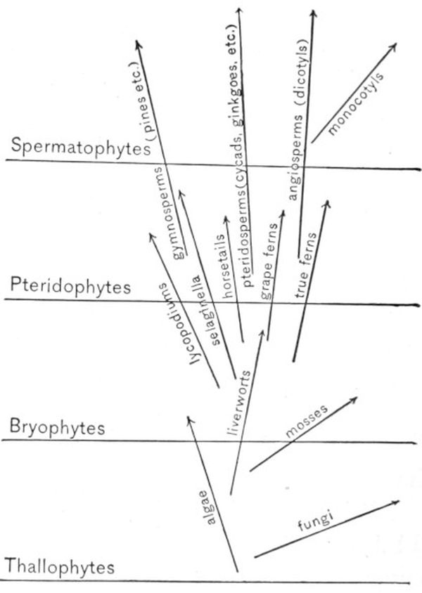 419. Explanation of the diagram.—An attempt to show the general course of plant evolution up to the present time is made in the accompanying diagram. The four great divisions, Thallophytes, Bryophytes, Pteridophytes, and Spermatophytes, are represented by spaces between four horizontal lines arranged one above the other in the order of their succession in time and complexity of organization. It should be borne in mind that these dividing lines are not sharply defined in nature, but overlap or indent the territory between them with varying[Pg 362] degrees of irregularity, like the coast line on a map. The relative positions of the different orders we have been considering are represented by upright and diagonal lines, the general course of which, as indicated by the arrows, is intended to give an idea of the trend of evolutionary progress in the particular group represented by each line. No one of these lines is made to originate directly in any other, because, with the possible exception of the monocotyls, we have no authority for asserting that any such direct connection exists between plants as we know them, but only that certain types give evidence of descent from a common ancestry. This lack of certainty is expressed by placing the point of origin for any given line in more or less close proximity to the one which is supposed to be the nearest living representative of the common ancestor. The line of ferns, for instance, is depicted as originating in the region of the bryophytes, somewhere in the neighborhood of the liverworts, but the two lines nowhere come in contact, because there is no evidence that any fern, living or fossil, is directly descended from any particular kind of liverwort known to us. With these explanations, the diagram shows, in a rough way, the generally accepted view of plant relationships as based on the evidence at present before us. But in questions of this sort it is wise to keep in mind the blunt remark of a famous old American statesman, that “only fools and dead people never change their opinions.”