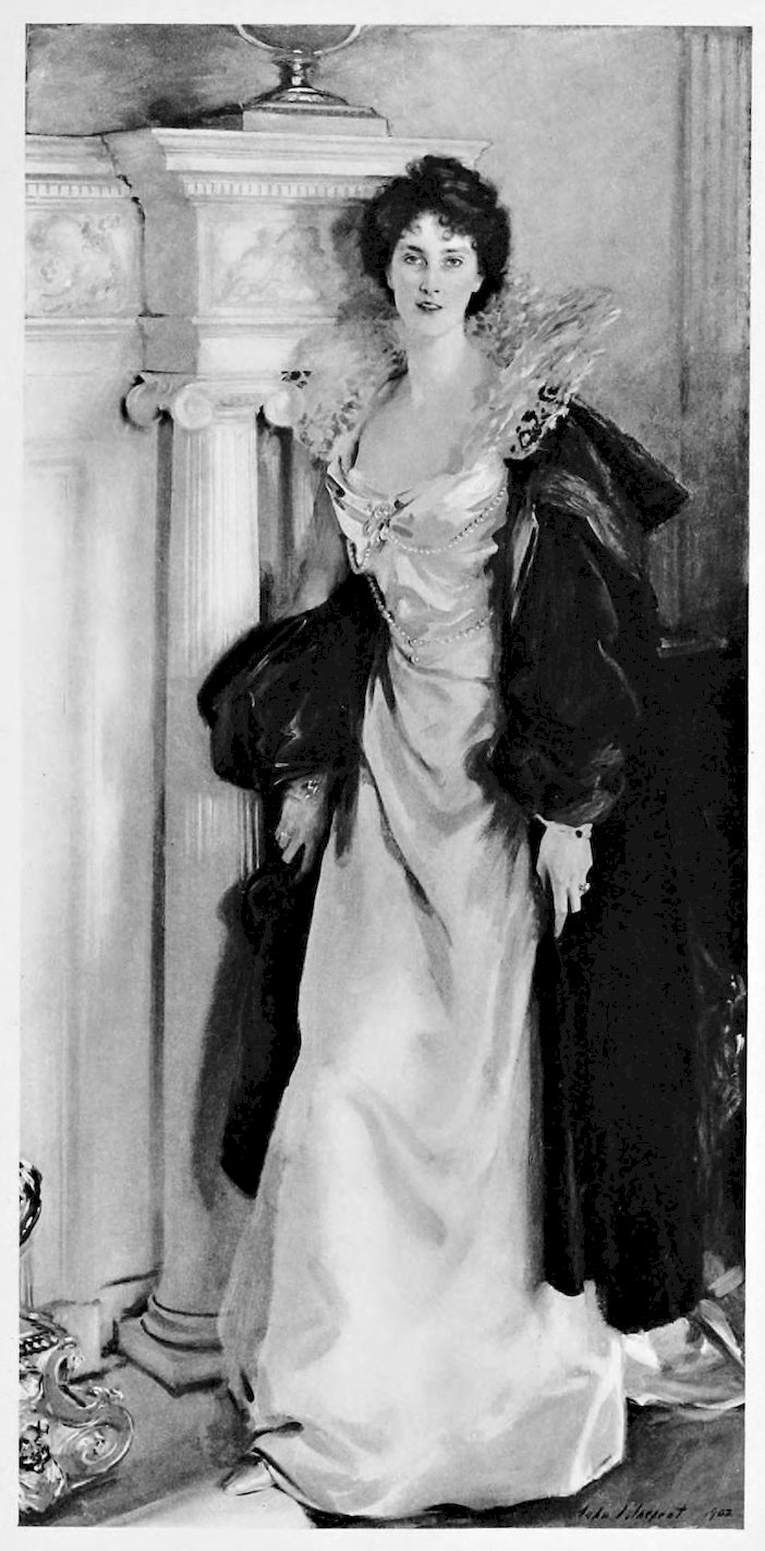The race, nevertheless, does not overpower the least of the personal traits that are, personally, worthy of record. Mr. Sargent takes at times a sudden view, and thus makes permanent, too singly, one aspect of an often altering face. It seems to be so, for example, in the portrait of Coventry Patmore, in which that great poet’s vitality wears an aspect too plainly of mere warfare. Even here one may hesitate, conjecturing that some other eyes may see in this likeness traces of “the many movements” of a poet’s nature. But “one thing at a time” is the right rule for much portraiture; and yet again, it has perhaps been obeyed here where it should not. Elsewhere the accident of a moment that is not important may be something too passing for the dignity of a portrait; but assuredly this is noted only when there has been nothing to note that has a graver claim to “immortality.” I rather report another’s murmuring than my own (the murmuring of one who prizes Mr. Sargent’s genius in such a degree as no one can outdo) if I aver that he tells us, in a portrait, now and then, such a fact as that a man has or has not slept well. When he has something finer to show us, I do not think Mr. Sargent shows us that; but the graver conditions of life are so visible to him, and their aspect is so plain in the reflection of his picture, that it is told of one portrait that a physician made a diagnosis from it and named a malady until then uncertain—a disorder that has a characteristic effect upon bearing and expression. The ordinary eye might see in that expression nothing but a kind of demonstrative health. It is moreover interesting, in the case of this portrait, to know that the painter, at work on one of the finest pictures of his wonderful gallery, a picture magnificently arranged, was keen as well as large of sight, and saw both the pictorial beauty of the accessories and the difference between the look of another woman of the world and the look of this one, who wears her jewels with an almost secret difference. If the story is true, well; if it is not true, it has been aptly invented by one who must know something of Mr. Sargent’s manner of seeing and of perceiving what he sees. An example of the portrait of a moment that is full of spirit and action is that of Mrs. George Batten, which breathes the last note of a song—a note of Tosti’s, one might guess. With this we may compare the repose of the standing portrait of Lord Ribblesdale, in which one hardly knows whether face or figure is more expressive of the poise of life—the unstable equilibrium by which a man is thus admirably erect, so that nothing stable and secure seems so upright, and nothing in flight more full of life. Another pause is that in the face of Eleonora Duse in the quick sketch in oils of which the reproduction is one of the treasures of this book. The face is quite tranquil, so that other faces look uneasy in comparison, and the eyes under their sombre lids have, in this brief sketch, the most direct look in the world. The great tragedian gives in her portrait, as in her art, the impression of an incomparable sincerity, and faces us from the yonder side of the common human custom of intercepted, veiled, retreating or hesitating looks. She does not find these minor disguises to be worth while. Mr. Sargent’s sketch is peculiarly moderate, and the reproduction happily keeps all the distinction he has made between the one large light on the forehead and the lower lights on the nose, cheek, and chin, so that it is the modelling of the forehead that is most important, but one part is as simple as another.