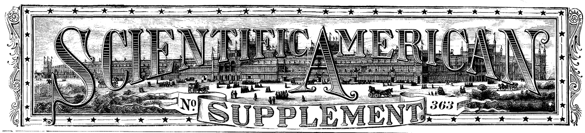 The Project Gutenberg EBook of Scientific American Supplement, No. 363, December 16, 1882, by Various This eBook is for the use of anyone anywhere at no cost and with almost no restrictions whatsoever. You may copy it, give it away or re-use it under the terms of the Project Gutenberg License included with this eBook or online at www.gutenberg.org Title: Scientific American Supplement, No. 363, December 16, 1882 Author: Various Posting Date: October 10, 2012 [EBook #8452] Release Date: July, 2005 First Posted: July 16, 2003 Language: English Character set encoding: ISO-8859-1 *** START OF THIS PROJECT GUTENBERG EBOOK SCIENTIFIC AMERICAN SUPPL., NO. 363 *** Produced by Olaf Voss, Don Kretz, Juliet Sutherland, Charles Franks and the Online Distributed Proofreaders Team