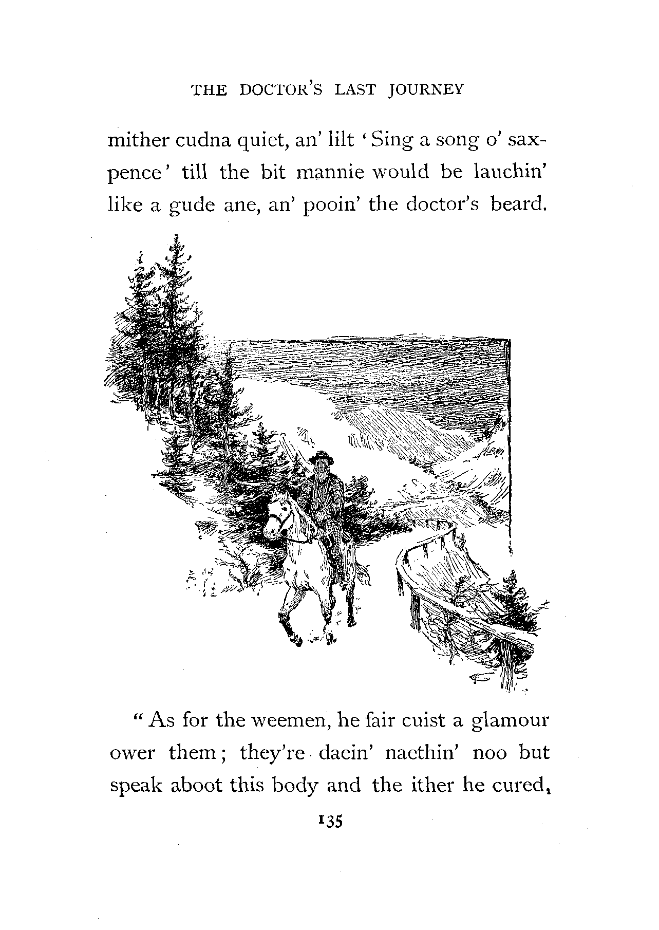 "The smith said that he wes thinkin' o' Annie's tribble, but ony wy a' ca' it rael bairnly. It's no like Drumtochty; ye're setting an example, Milton, wi' yir composure. But a' mind ye took the doctor's meesure as sune as ye cam intae the pairish."