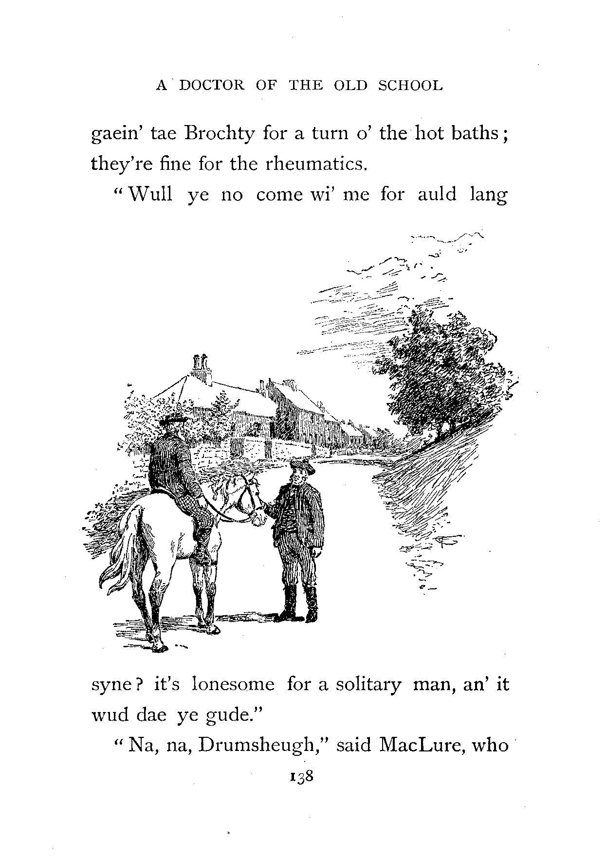 "Na, na, Drumsheugh," said MacLure, who understood perfectly, "a've dune a' thae years withoot a break, an' a'm laith (unwilling) tae be takin' holidays at the tail end.